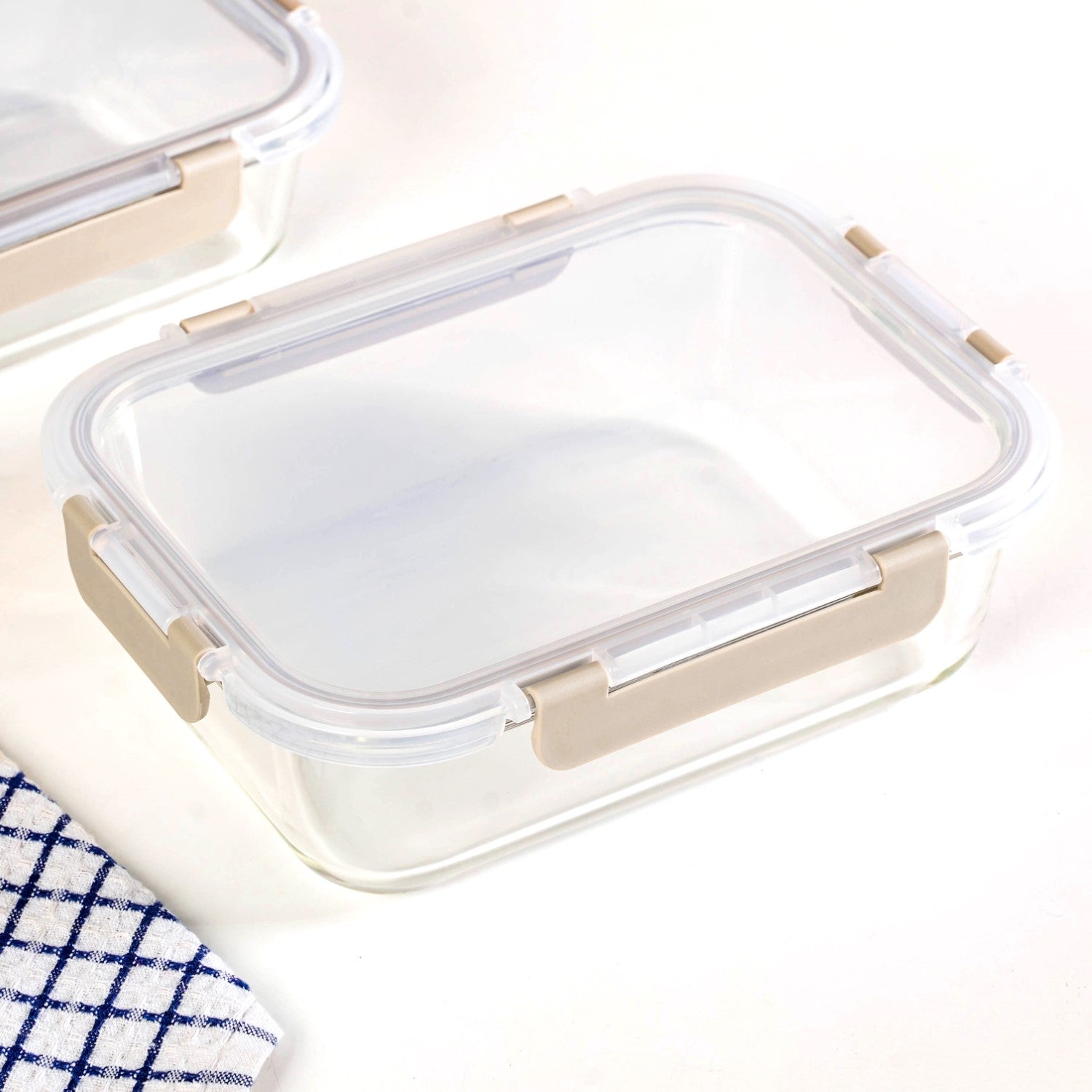 Design: Crafted from durable borosilicate glass, this set of meal prep containers features a transparent body for quick visibility of stored food. Beige airtight locking clips secure the clear PVC sealing lids to lock in freshness and prevent spills. The rectangular stackable design ensures space-saving storage in cupboards and refrigerators. With four varying sizes, the set is ideal for snacks, lunches, or main courses. The smooth polished glass finish and thick, durable glass walls offer both style and strength, while BPA free parts ensure safe everyday use. The base is microwave-friendly without lids for easy reheating.