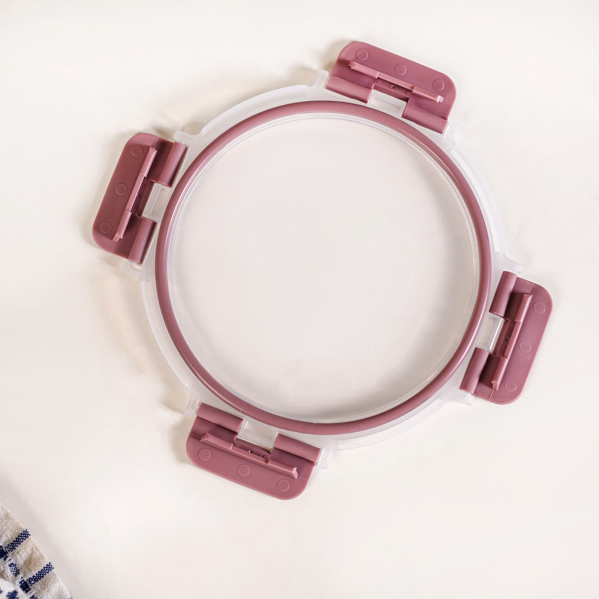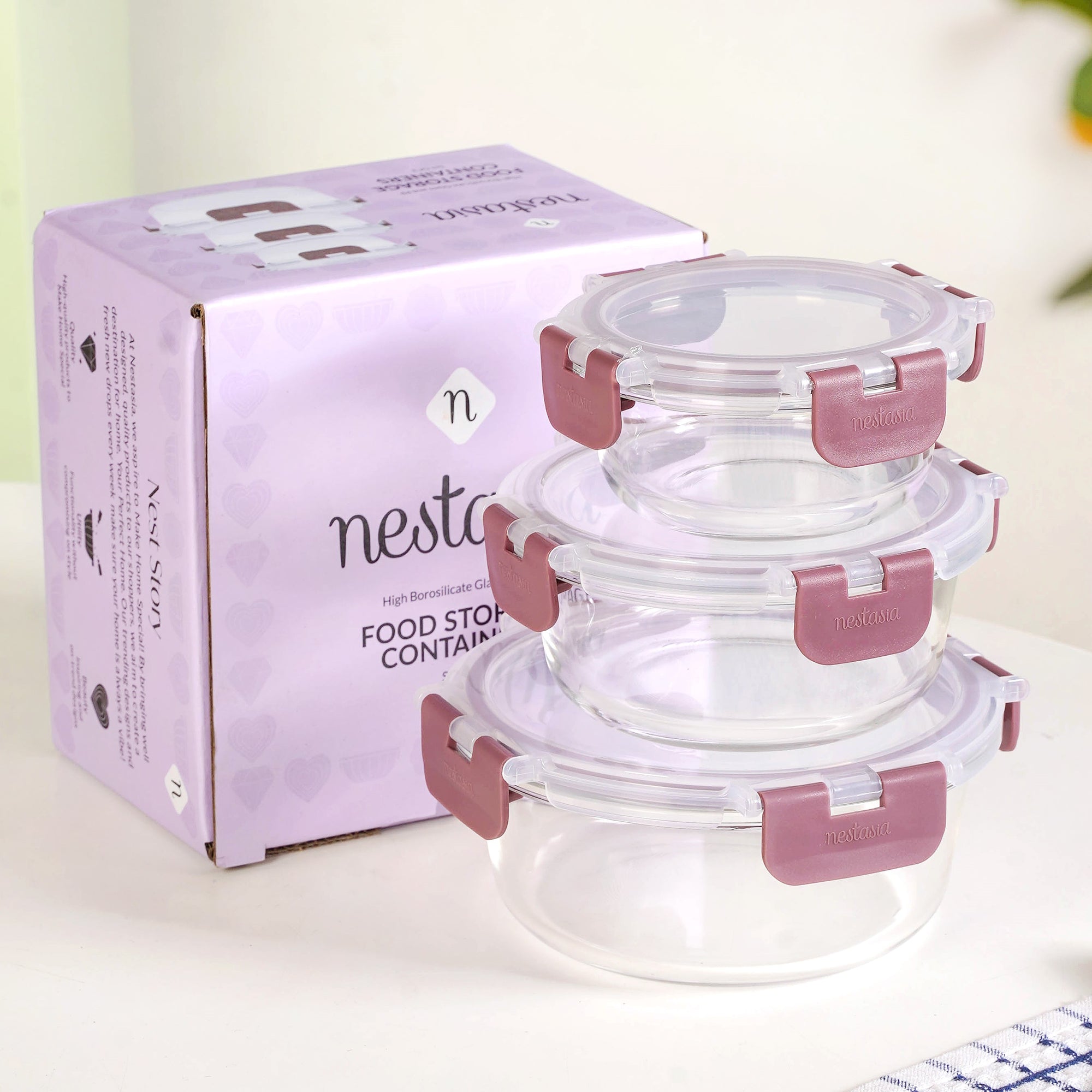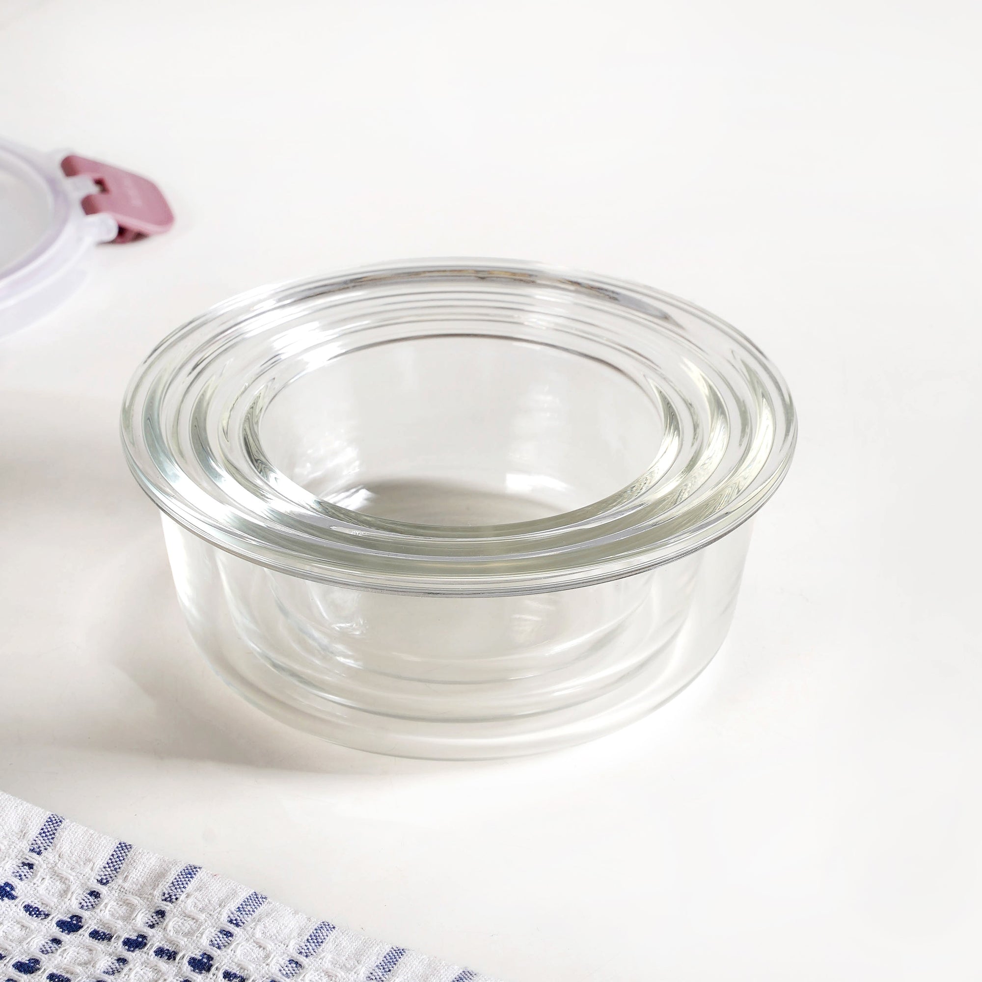 Design: This set features round high borosilicate glass containers with transparent bodies for a clean, modern kitchen aesthetic. Each container has a mauve PP lid with secure locking clips and a silicone gasket for airtight closure. Subtle grooved bases prevent slipping, and the containers come in varying capacities for versatile storage. Stackable design maximizes pantry and fridge space while combining durability, clarity, and visual appeal in every piece.
