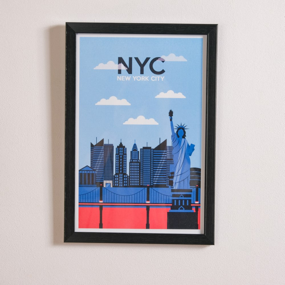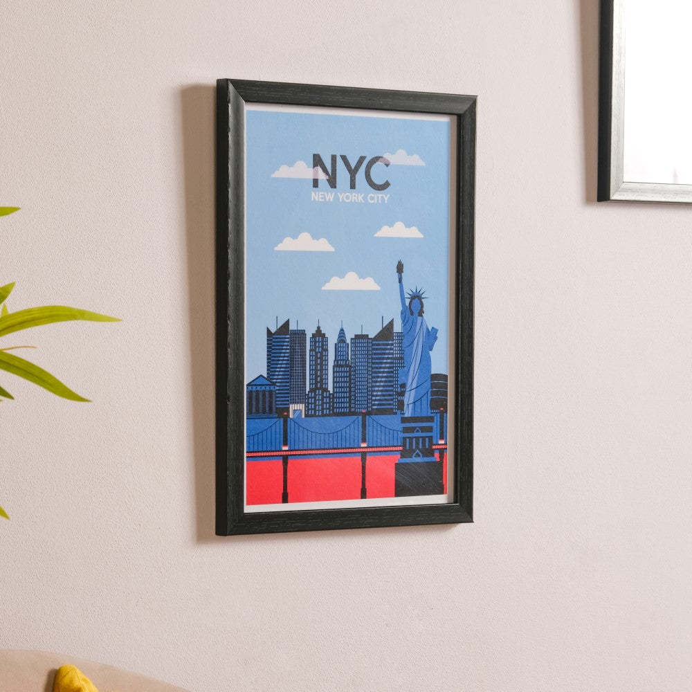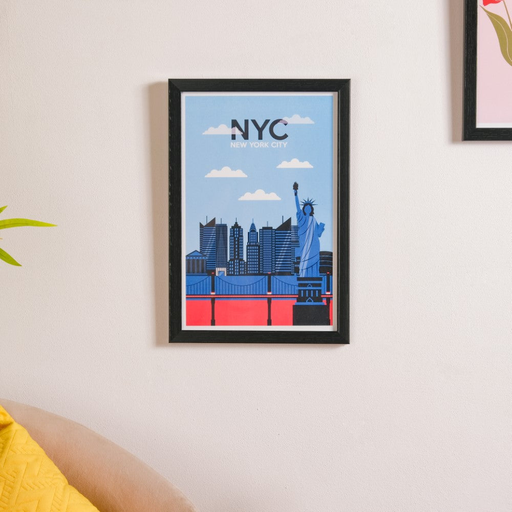 Decorate the wall with the beautiful skyline of New York City featuring the iconic Statue of Liberty and futuristic skyscrapers. The poster features vibrant high-definition colours as a result of premium digital printing. The different blue-coloured tones and the contrasting pink colour of digital art make the framed poster a modern wall decoration option. The printed poster is encased in a synthetic wood and acrylic photo frame and comes ready to be hung on the wall. The wall hanging is ideal for being used as bedroom wall decor or as wall decor for the living room.