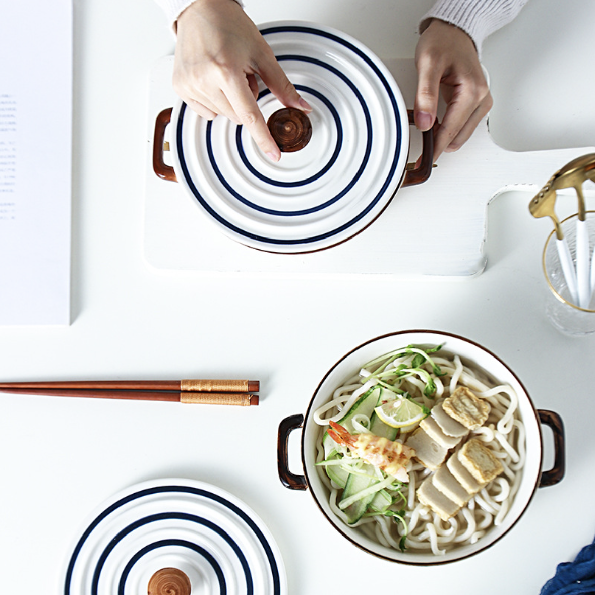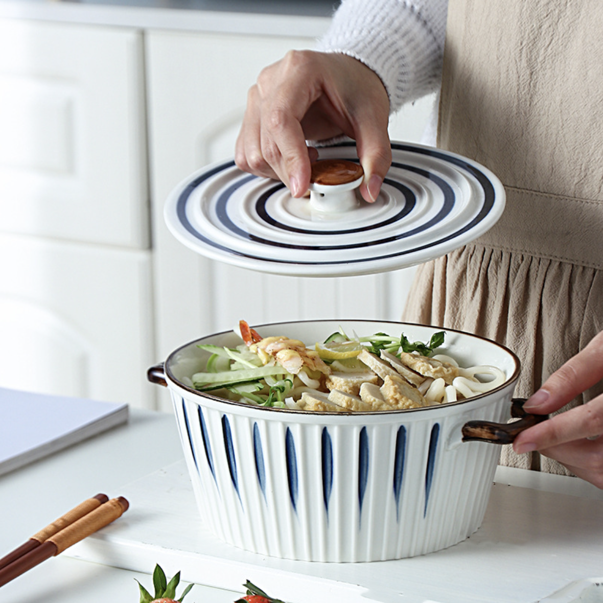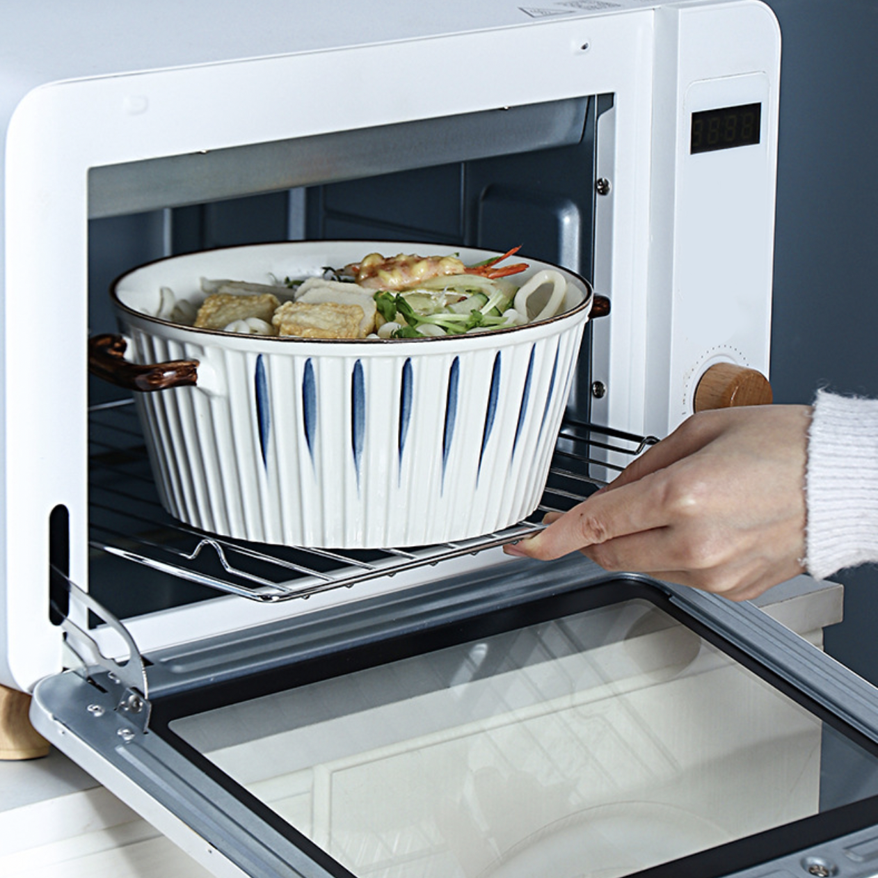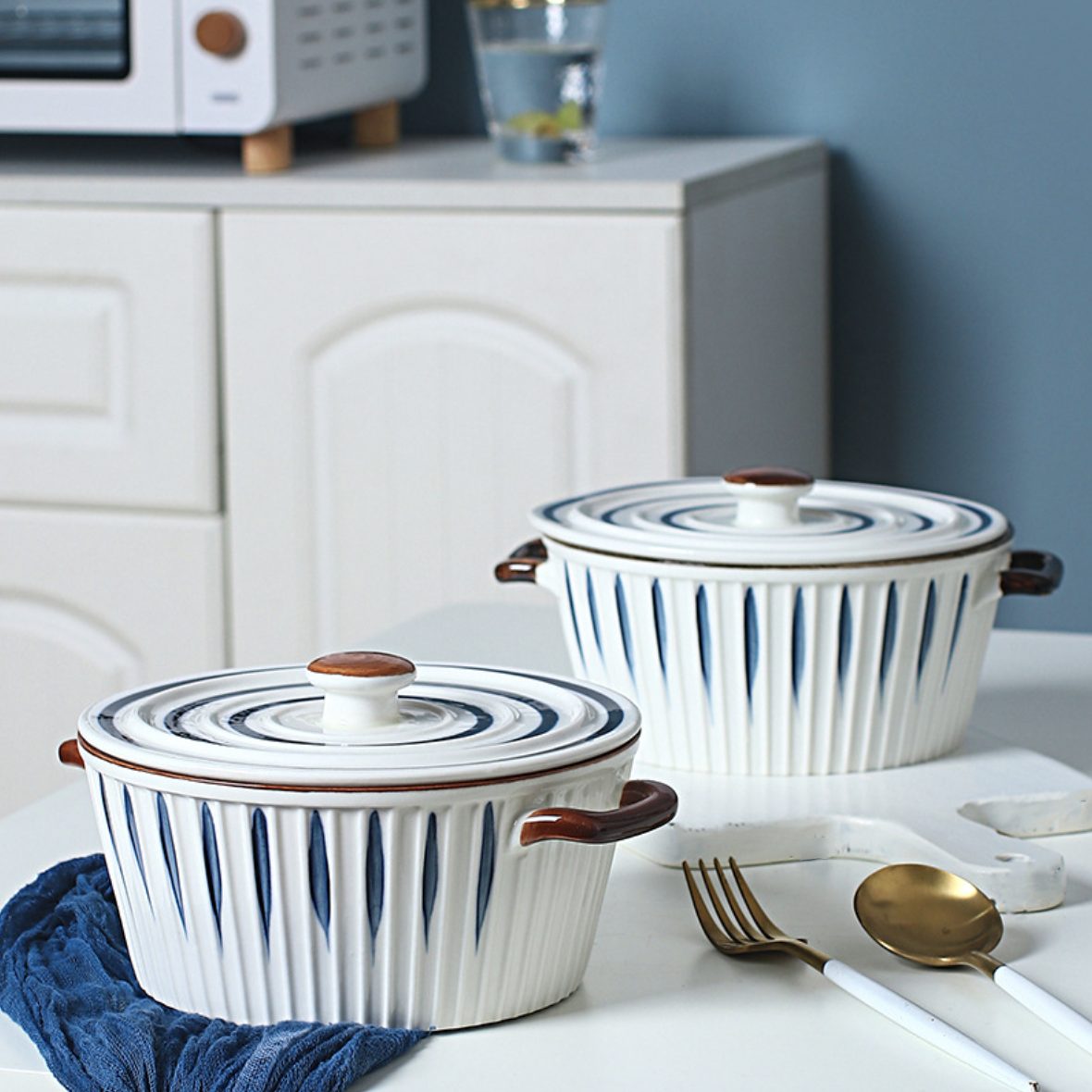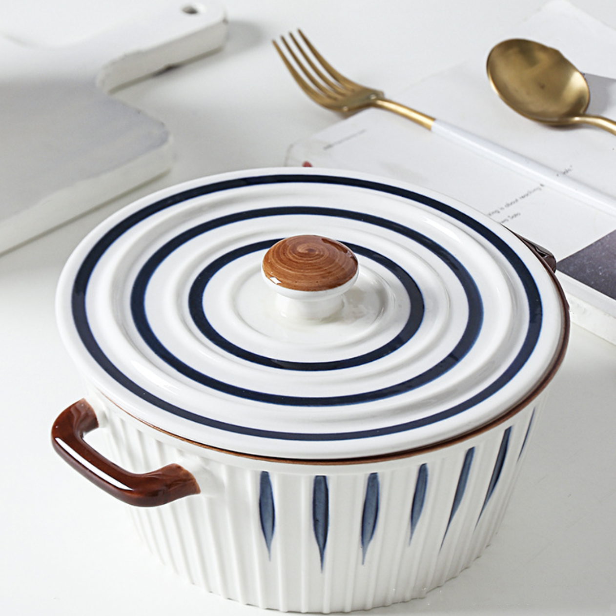 The exquisite ceramic cooking pot from our Nitori collection is a culinary masterpiece that combines functionality and elegance. Crafted with the utmost care, this casserole features a convenient cover lid and 2 sturdy handles, ensuring effortless cooking and serving. The classic white and blue colour scheme adds a touch of sophistication to any kitchen decor, making it an eye-catching addition to your culinary arsenal. This versatile casserole is perfect for baking, roasting, and serving your favourite dishes with style. Its high-quality ceramic construction guarantees excellent heat retention, allowing for even and consistent cooking. Elevate your cooking experience with this exceptional Nitori cooking pot, where form meets function flawlessly.