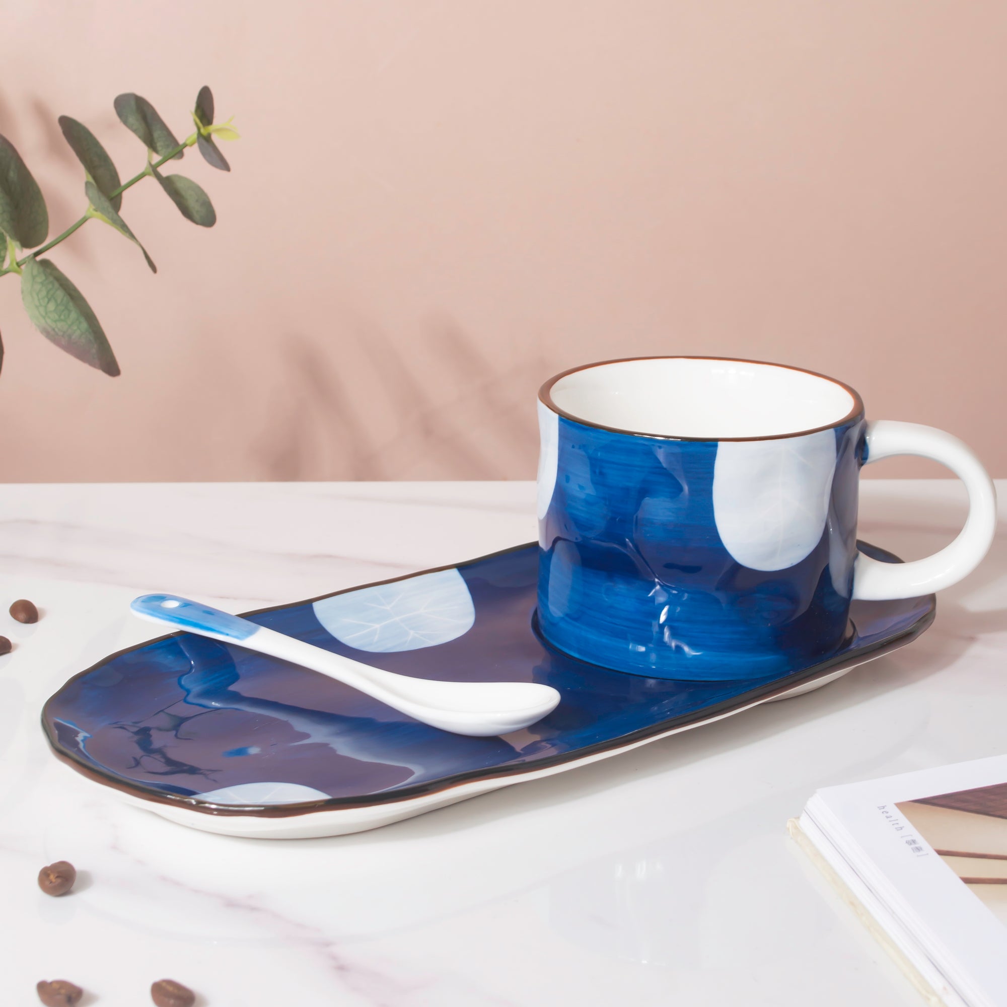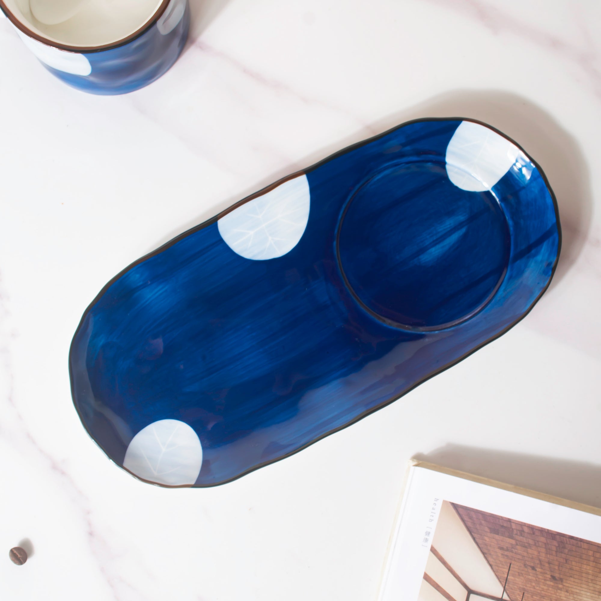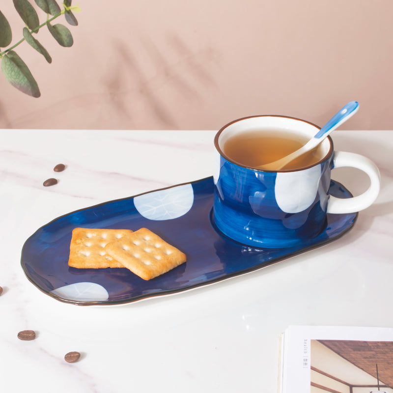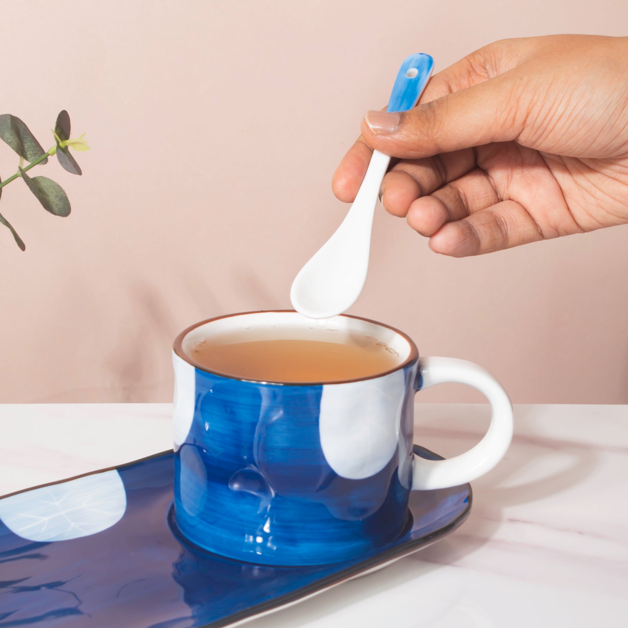 The ceramic blue teacup, tray, and spoon set are richly handcrafted and painted to showcase luxury. The contrast of blue and white elevates the tea set even when it is simply on display in the showcase. When offered to guests at home, the teacup set will make a statement and a fantastic first impression. The set has been crafted in ceramic to exude calm elegance and provide a chance for refreshment.