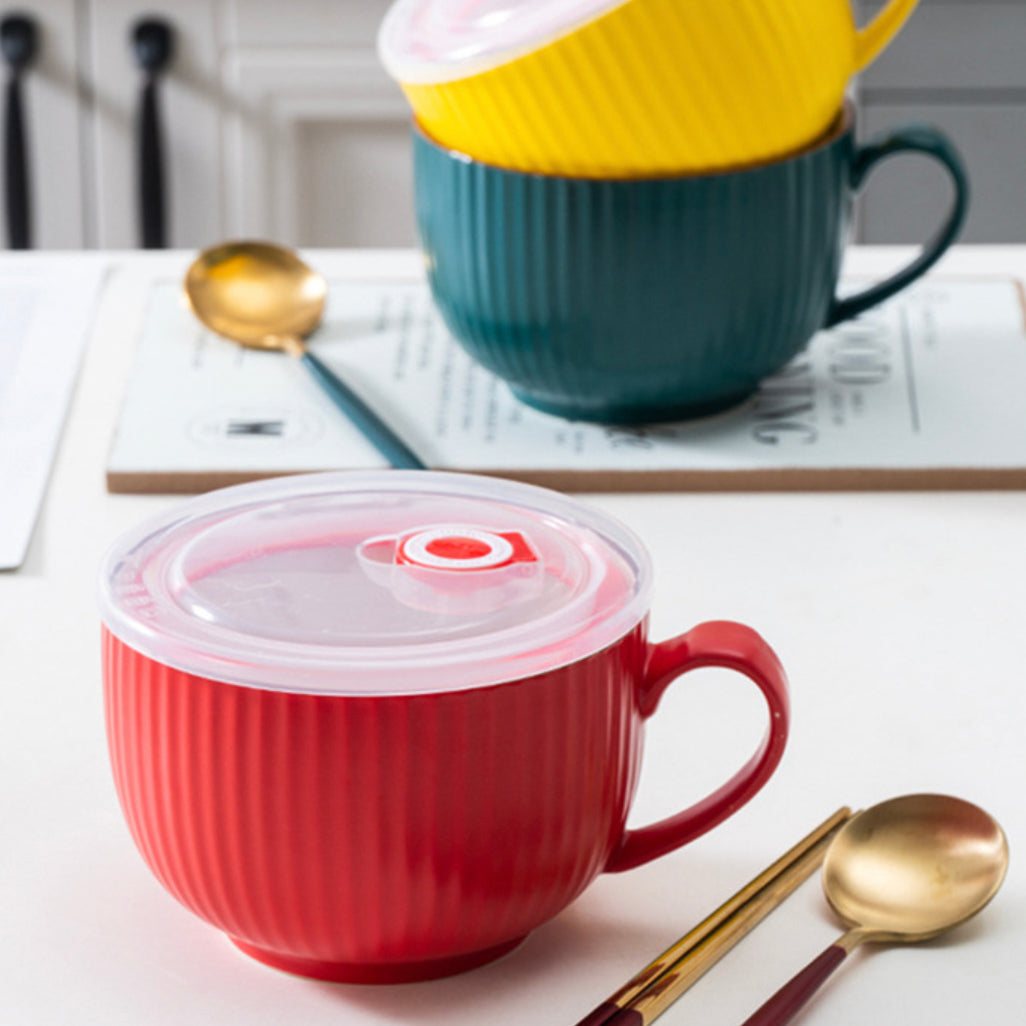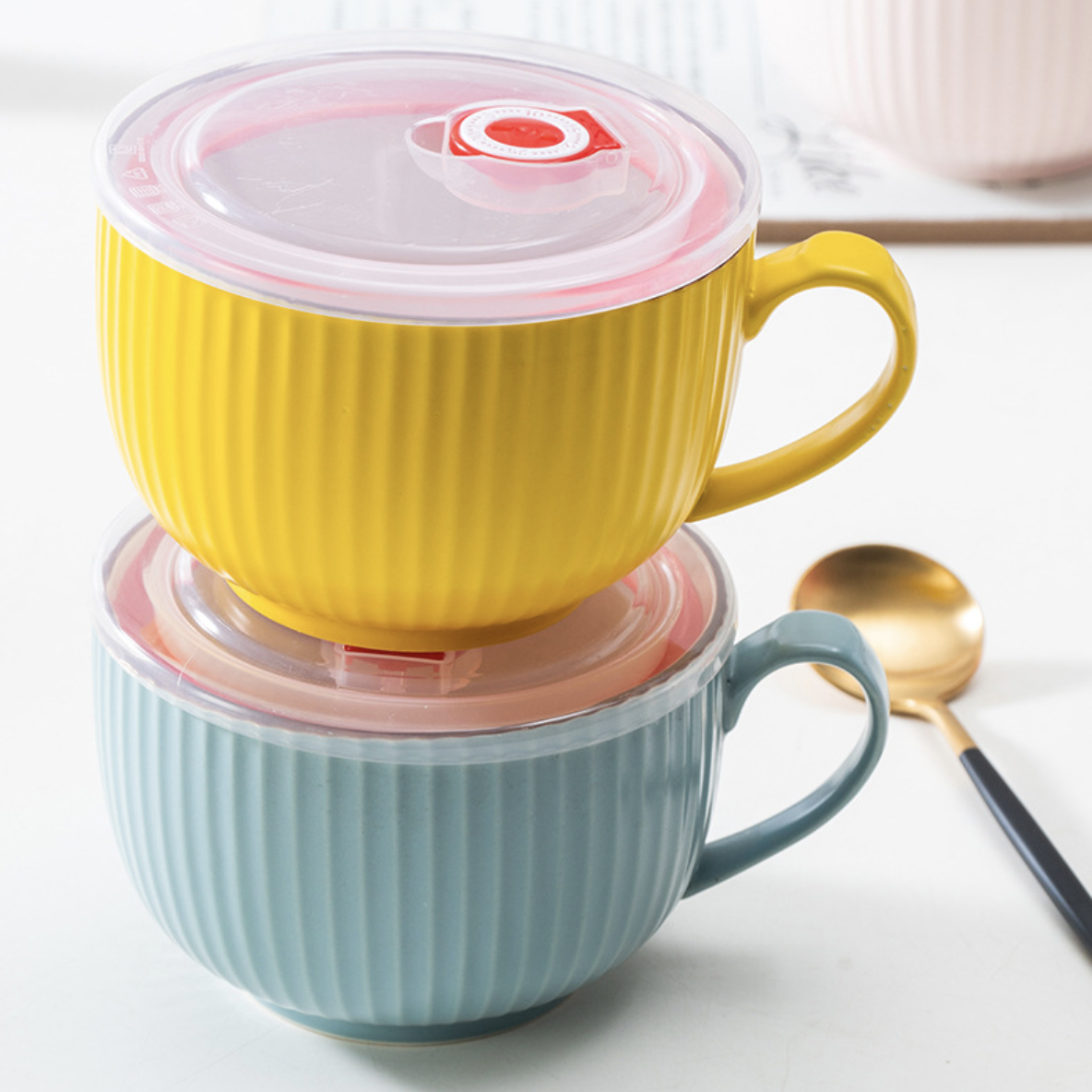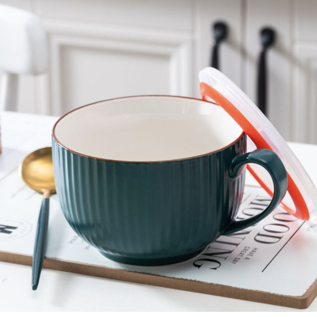 Ceramic cup with lid which comes in 3 enticing colors. The cup exudes simplicity and class at the same time and are ideal for drinking a big serving of coffee, hot chocolate, tea, lime juice and so on. The outer surface of the cup has a thin lined texture which gives it a wholesome look overall. The product is microwave and dishwasher-safe, and it may even be used in the oven. The lid has a stopper to let off steam, which is a unique feature of the cup and makes it a one-of-a-kind addition to any kitchenware .