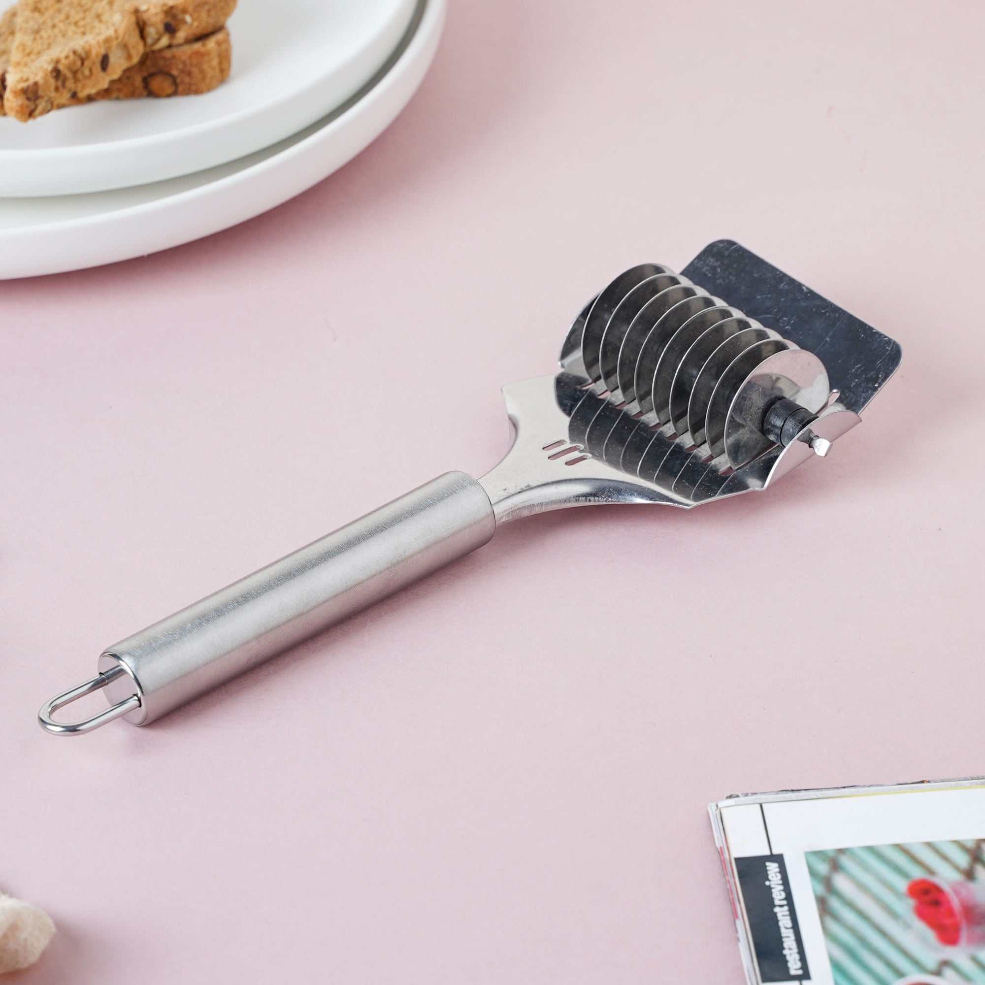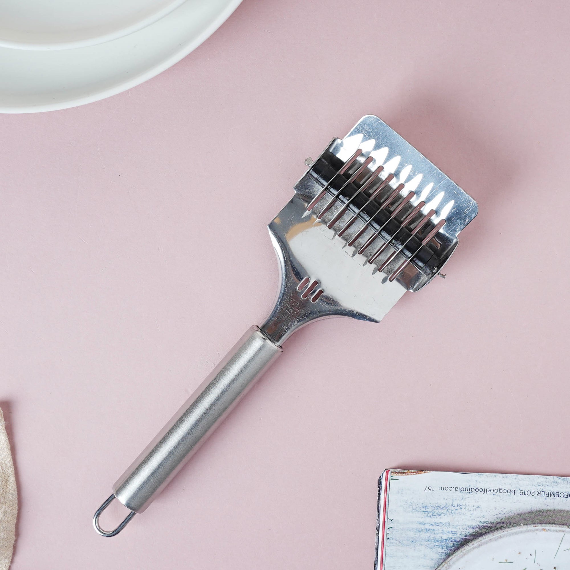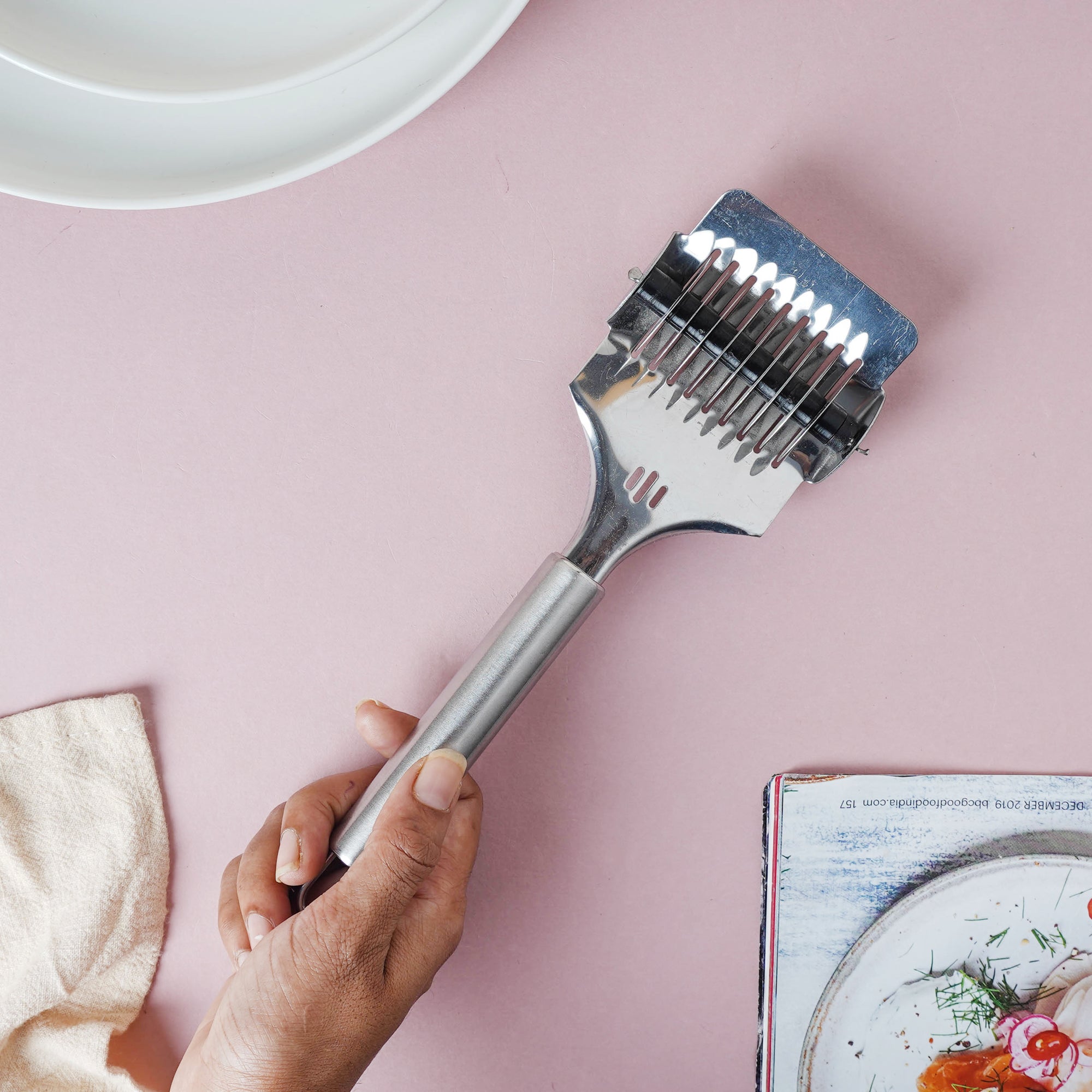 The noodle cutter is particularly useful for cutting out long strips of noodles while making noodles from scratch - straight from dough to pho. Roll out the dough flat, and then run the cutter over it. The noodle cutter has a 360 degree rollover cut feature which makes it extremely easy to cut the noodles perfectly. The noodle cutter can also be used as a pasta maker for making fresh pasta from scratch.