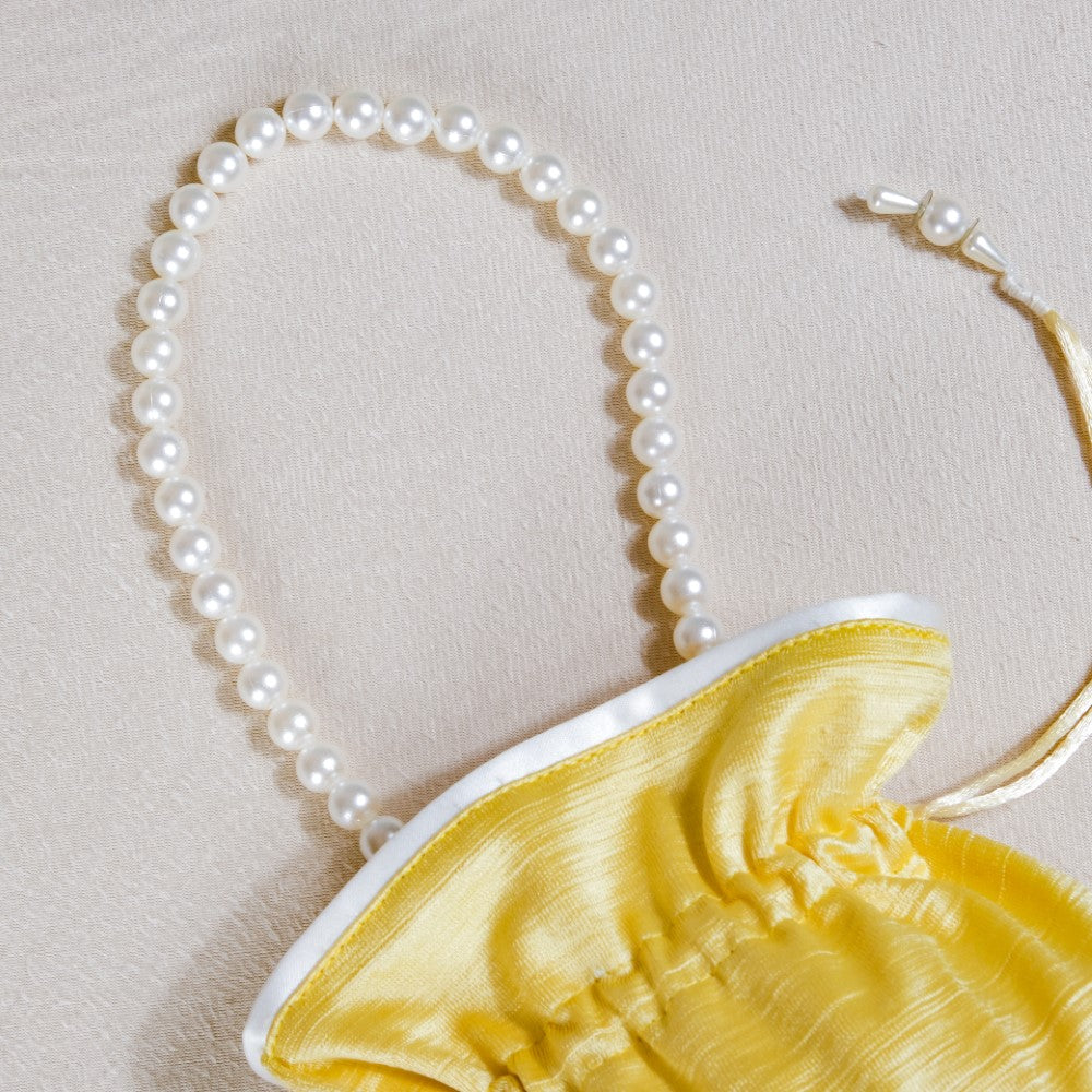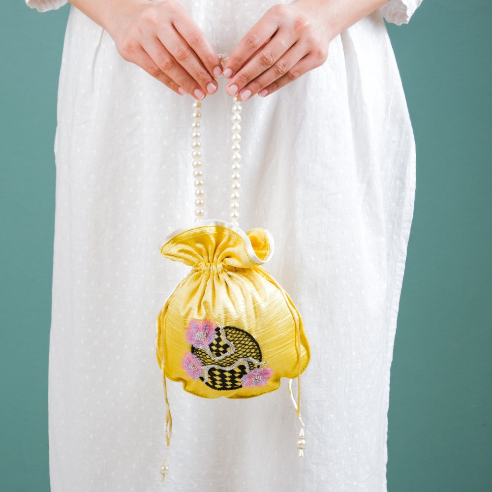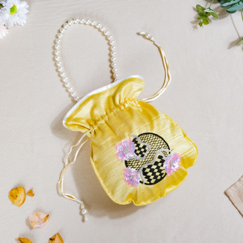 Featured here is a yellow potli bag in a premium polyester material with sequins and a hand-woven embroidery pattern that adds luxury and class to it. The potli is handcrafted, unique, and intricately embroidered with the additional benefit of carrying all your stuff in one go without any hassle. The potli bag is the perfect amalgamation of traditional Indian culture and contemporary style that looks good with all fashionable outfits. It has been beautifully crafted and created to match the women of today's world. This luxurious potli can be gifted at weddings, baby showers, and other occasions.