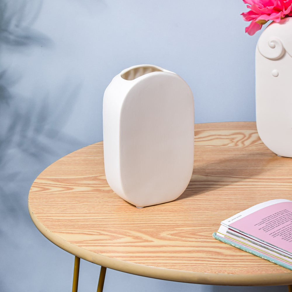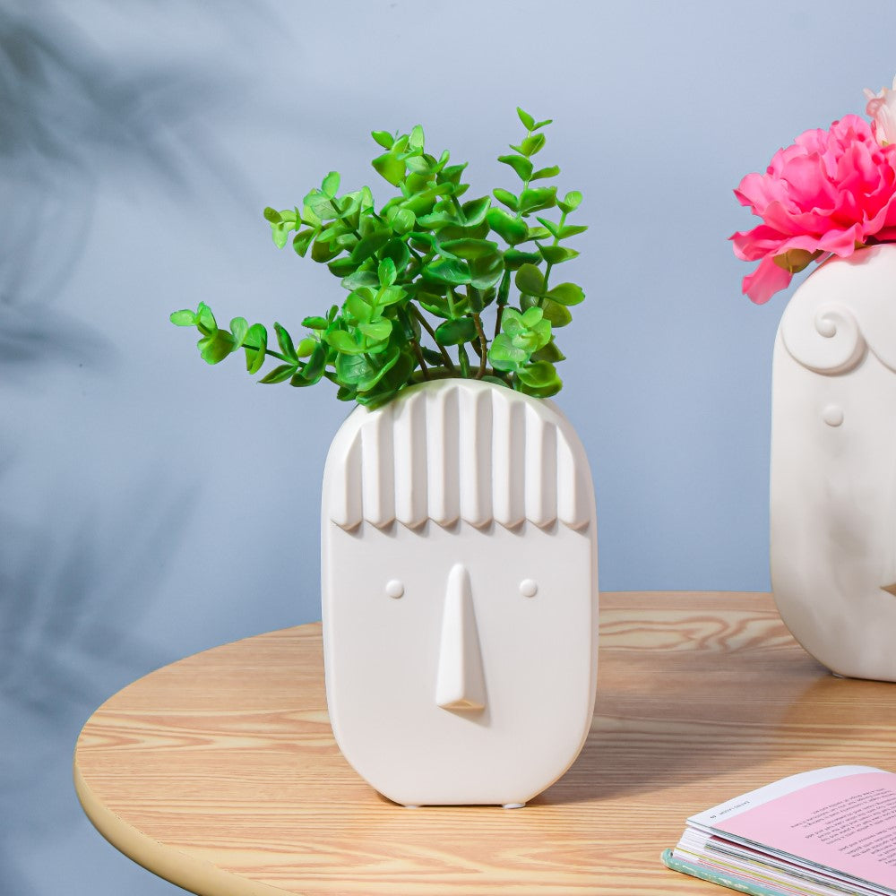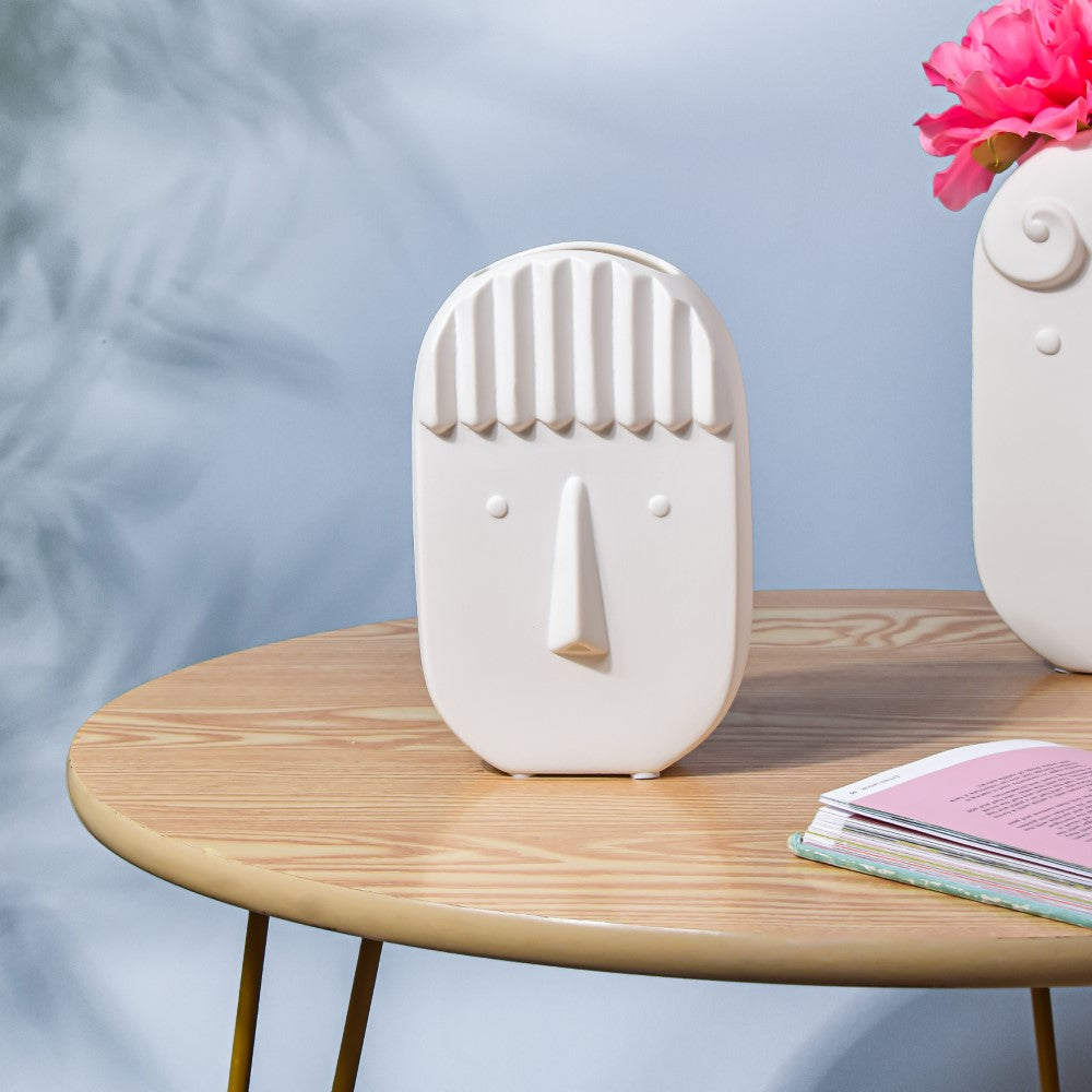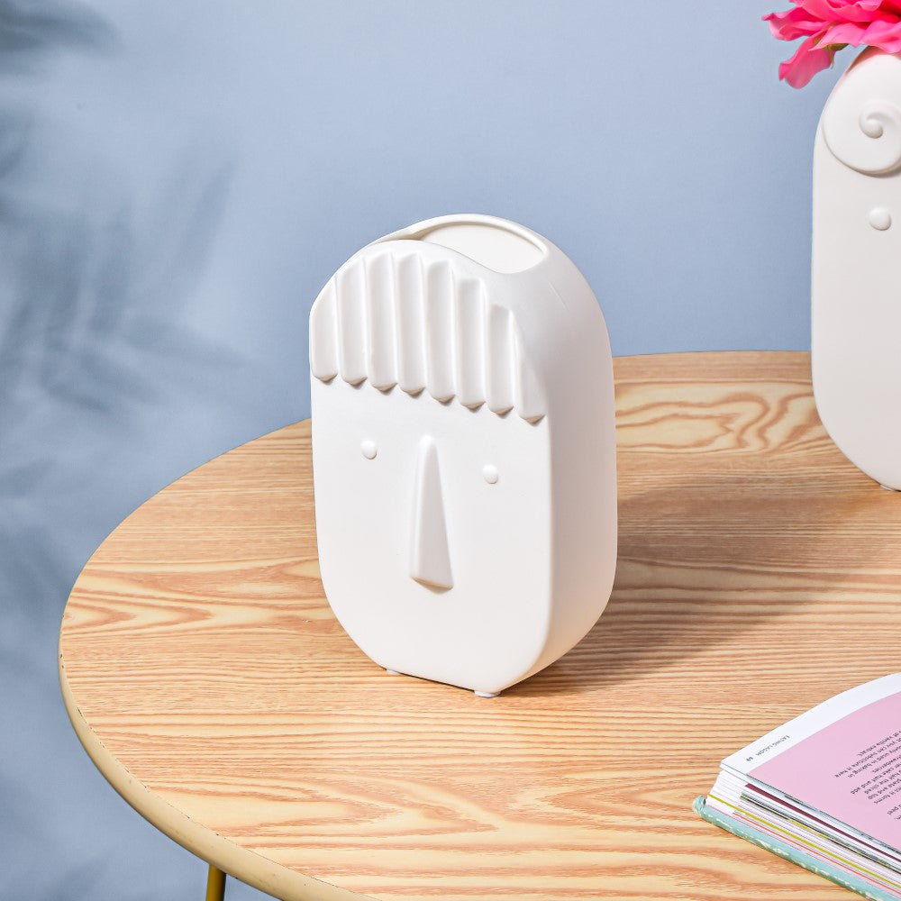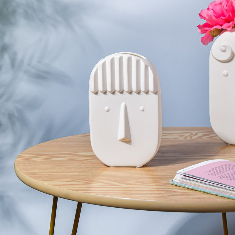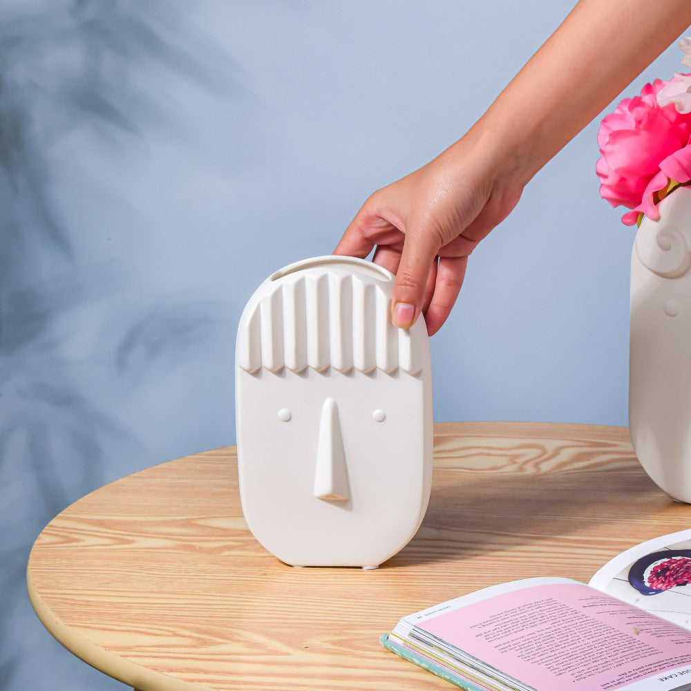 The white ceramic vase is a simple clean way to bring a touch of freshness and a color-balanced decor style to your home. The face vase has been skillfully crafted with fine workmanship and durable material. The vase can display your floral arrangement in a stylish and elegant way. With a fine texture and elegant look, the abstract vase will show the natural beauty of your decor. The designer vase can also be gifted on housewarmings, anniversaries, and so on.