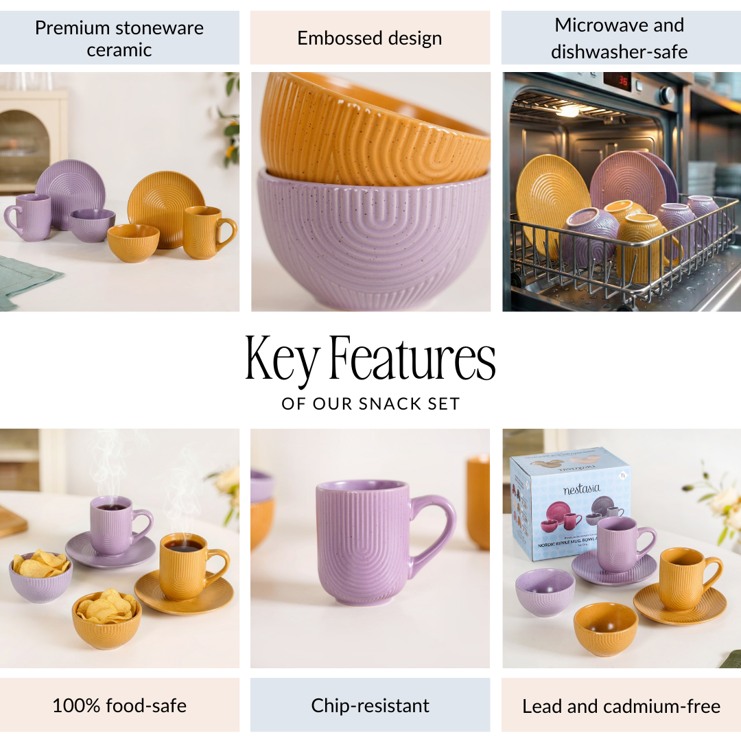 Design: A mix of soft purple and warm mustard yellow gives this set a playful yet sophisticated character. Each piece is defined by the ripple pattern and delicate speckled detailing, offering a balance of texture and simplicity. The textured base helps each mug, bowl, and plate stay secure, making it perfect for cosy snacks, tea sessions, or colourful breakfast plating.