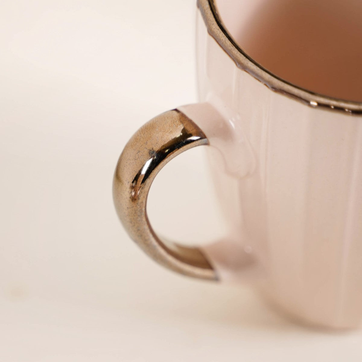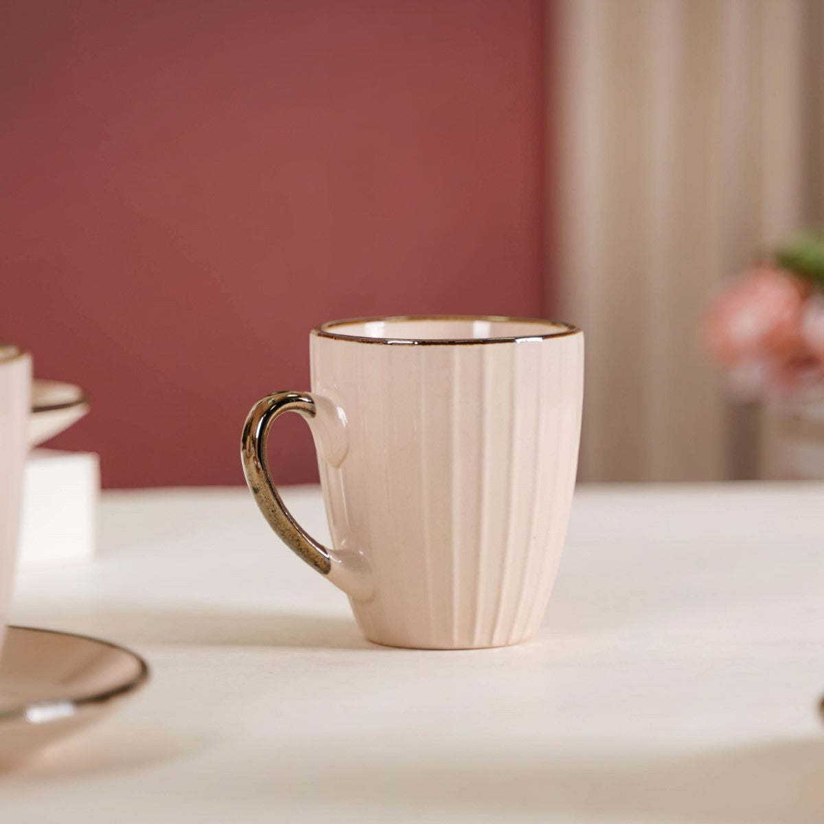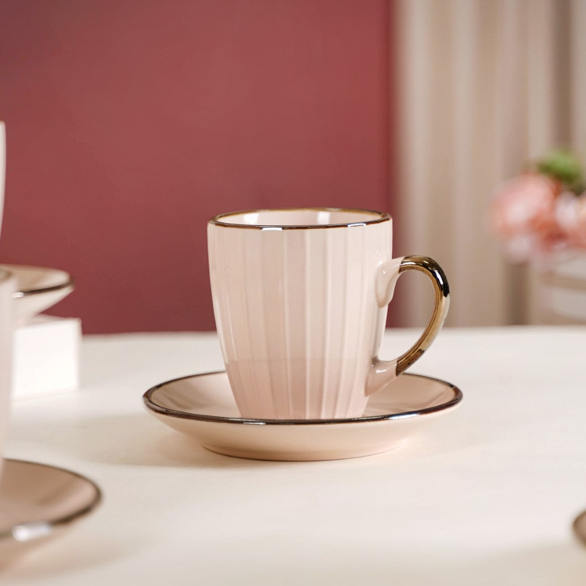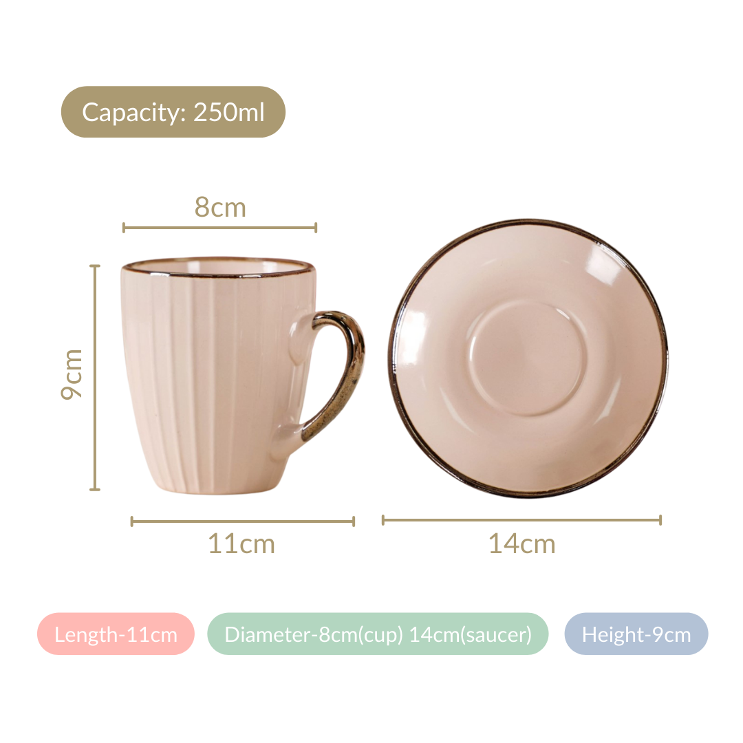 Step into the world of timeless elegance with our ribbed texture off-white cup and saucer set of 6. These exquisite cups and saucers redefine sophistication with their finely crafted ribbed texture, metallic rims, and handles. Their serene off-white hue seamlessly harmonizes with your kitchen decor, making them an indispensable addition to your drinkware collection. Crafted from 100% food-grade ceramic, these pieces are not only beautiful but also resilient, boasting chip-resistant quality that ensures durability. Designed with ergonomic precision, they offer a comfortable, non-slip grip for daily convenience.