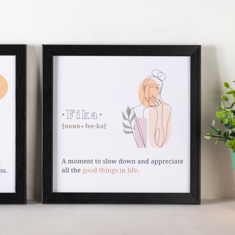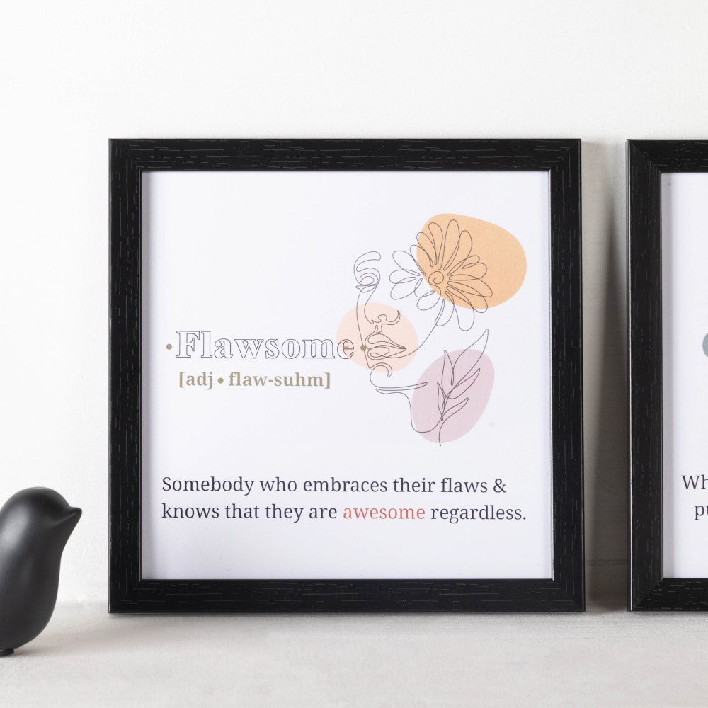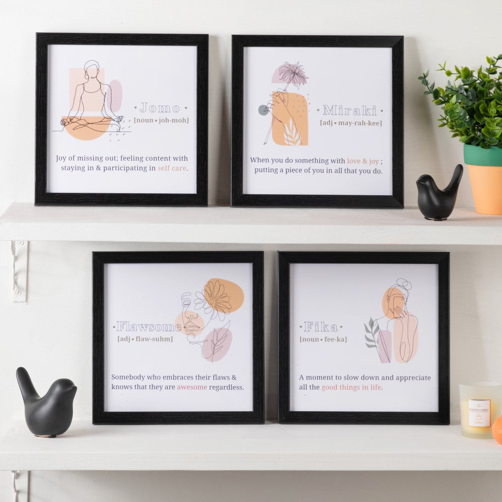Elements to inspire and visual art to soothe the mind are combined in the set of 4 framed posters. The framed wall posters that have been framed for wall hanging each showcase line art with the meanings of 'Miraki', 'Flawsome', 'Fika', and 'Jomo'. The meaningful posters and motivational posters for wall decoration are encased in a square frame and add a serene aesthetic element to the wall decor. The separate wall posters can be arranged together or placed separately for office wall decoration or living room wall decoration.