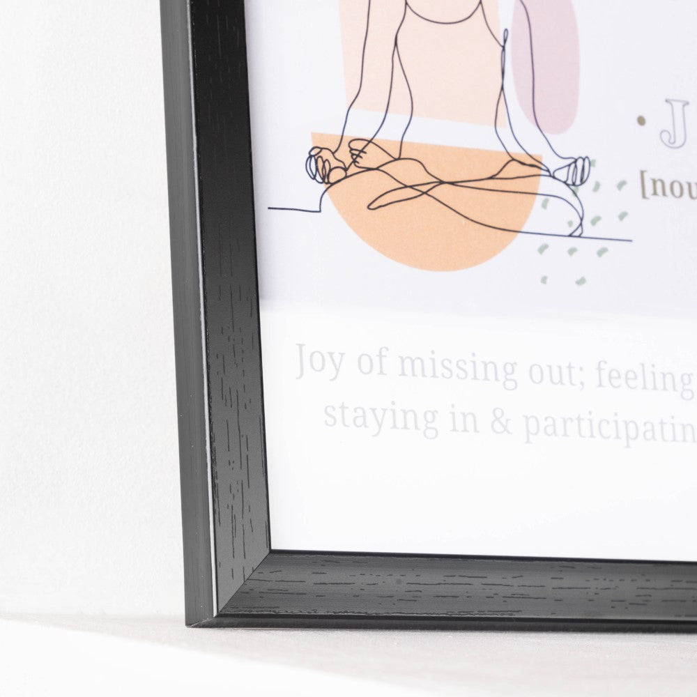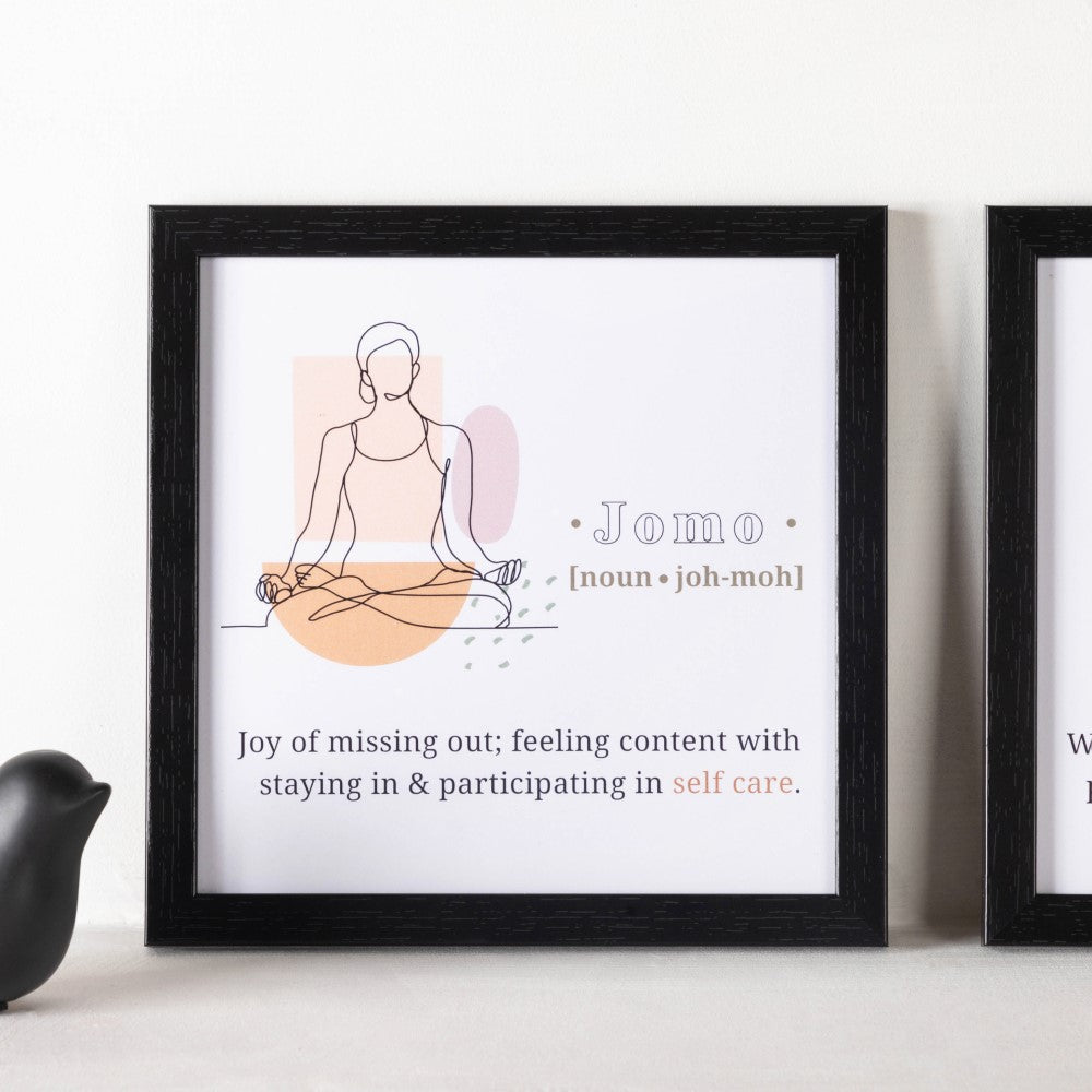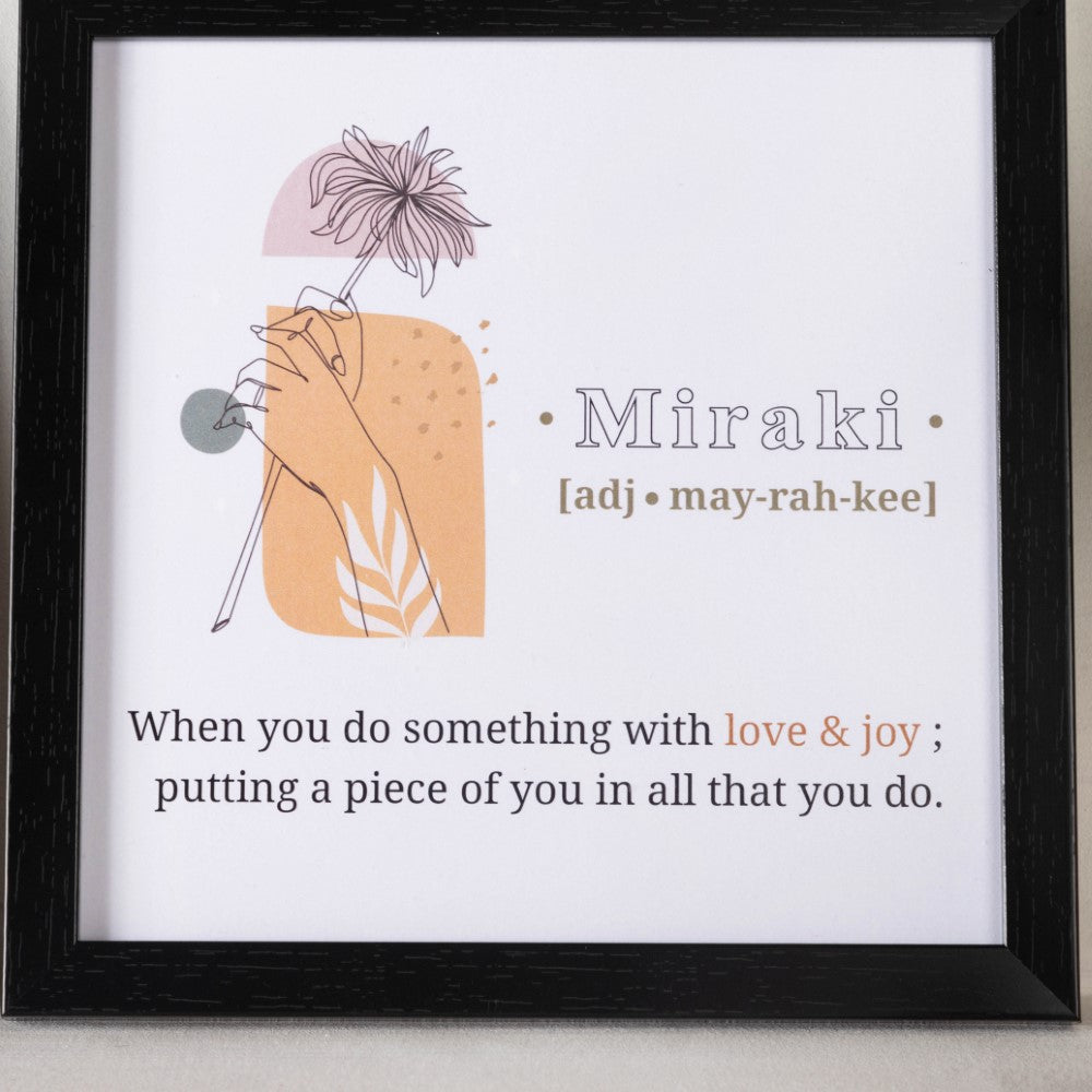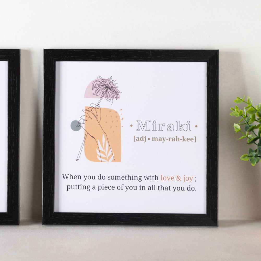 Elements to inspire and visual art to soothe the mind are combined in the set of 4 framed posters. The framed wall posters that have been framed for wall hanging each showcase line art with the meanings of 'Miraki', 'Flawsome', 'Fika', and 'Jomo'. The meaningful posters and motivational posters for wall decoration are encased in a square frame and add a serene aesthetic element to the wall decor. The separate wall posters can be arranged together or placed separately for office wall decoration or living room wall decoration.