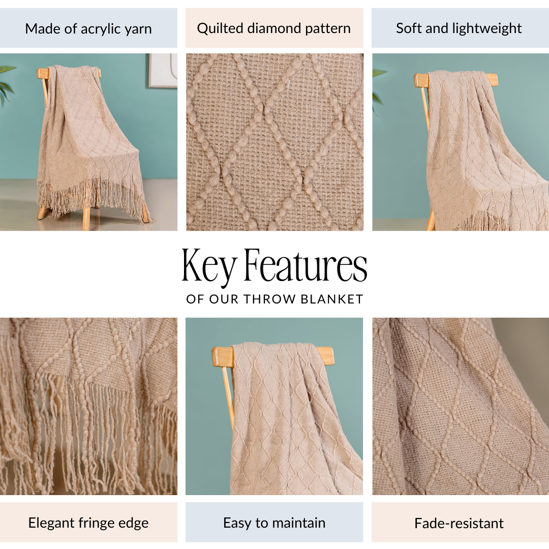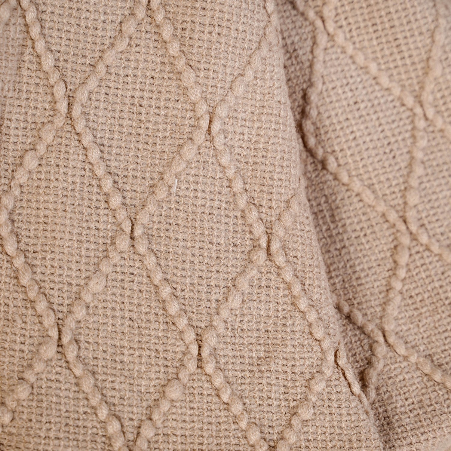 Design: This beautiful throw is made from high-quality acrylic yarn and has a classy, muted brown hue. The design features a tactile quilted diamond pattern with delicate raised bobble details that create wonderful visual depth. It also has long, flowing fringes along the edge.