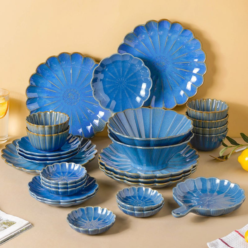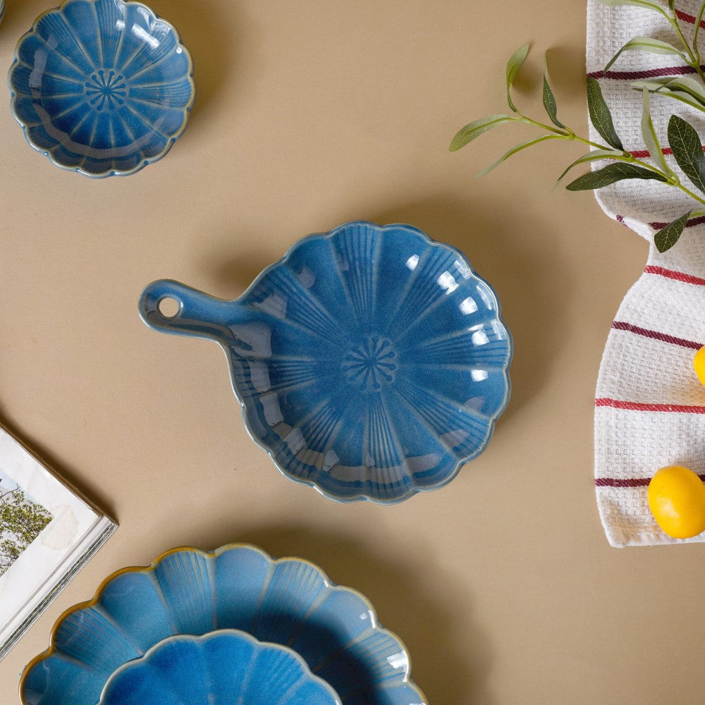 The ceramic ocean blue dinner set gets its ideation from the border where both the blue sky and blue ocean meet. The tranquility and serenity of these blues are delivered through the floral rimmed ocean blue dinner set. The grace of the oceanic enchantment comprises 6 dinner plates, 6 snack plates, 6 dessert plates, 6 soup bowls, 2 serving bowls and 1 plate with handle.