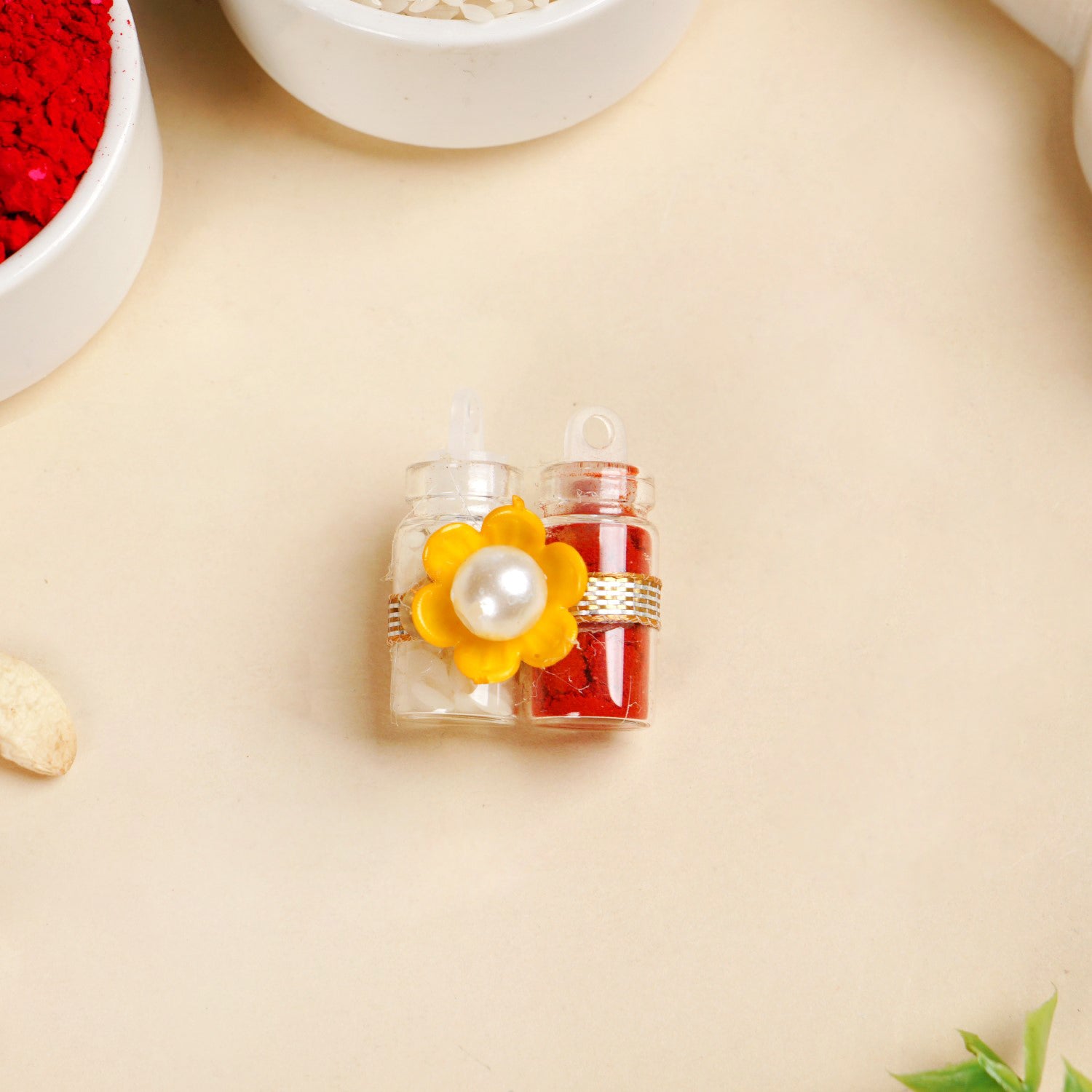 This curated set features 6 crystal-clear glass bowls with intricate embossed patterns, perfect for serving festive treats. Complementing this is a serene ceramic coffee mug with a robinia leaf print in calming tones, ideal for comforting sips. The star of the hamper is a beautifully handcrafted Rakhi-Lumba set, adorned with pearls, seashells, and pastel beads for a graceful, heartfelt touch. This hamper is a perfect expression of love, tradition, and thoughtful utility in one elegant bundle. The set also includes 1 roli-chawal bottle set, 1 pack of mixed dry fruits, 1 gift box, and 1 wish card.