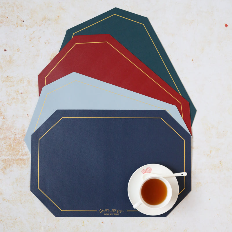 A table placemat or table mat for the dining table that comes in a variety of colours to pick from. The dining mat is distinctive and interesting since it is shaped like an octagon rather than a rectangle. The placemat can help to make a dining table look more organised and well-organized. Host dinners or parties and use the table mats to create an exquisite setting for visitors. The water-resistant table mat protects the table from water, scratches, and stains.