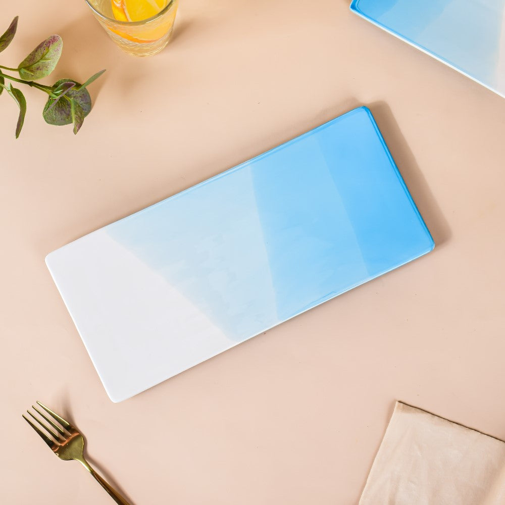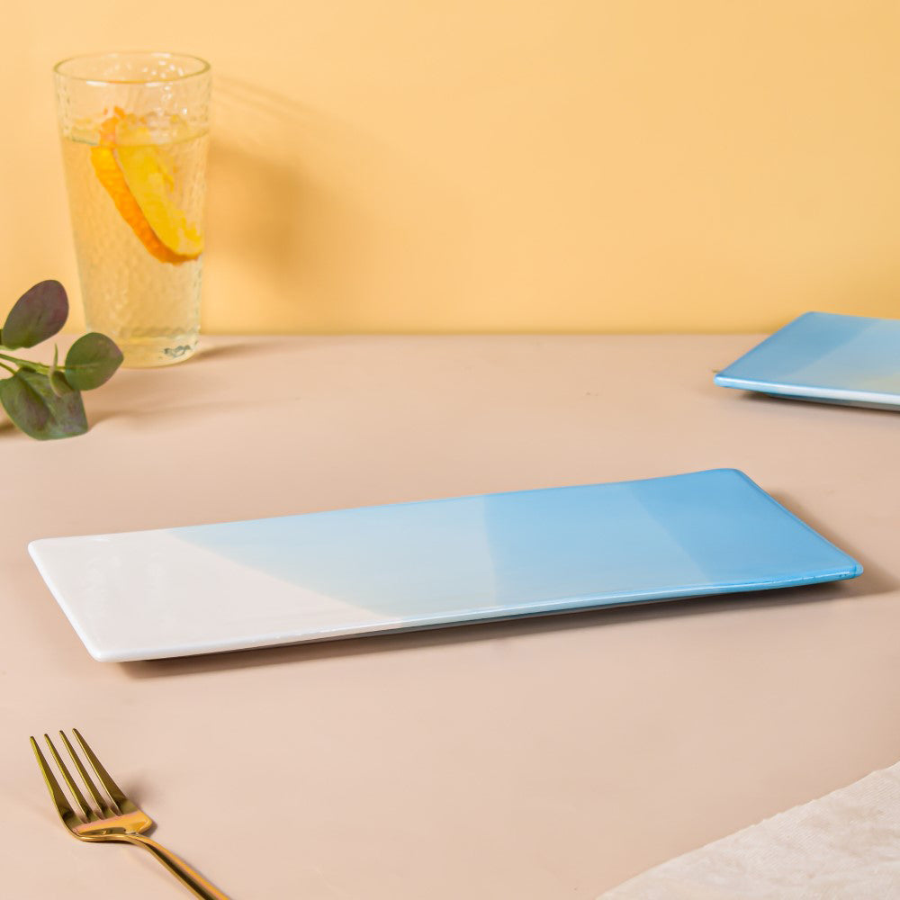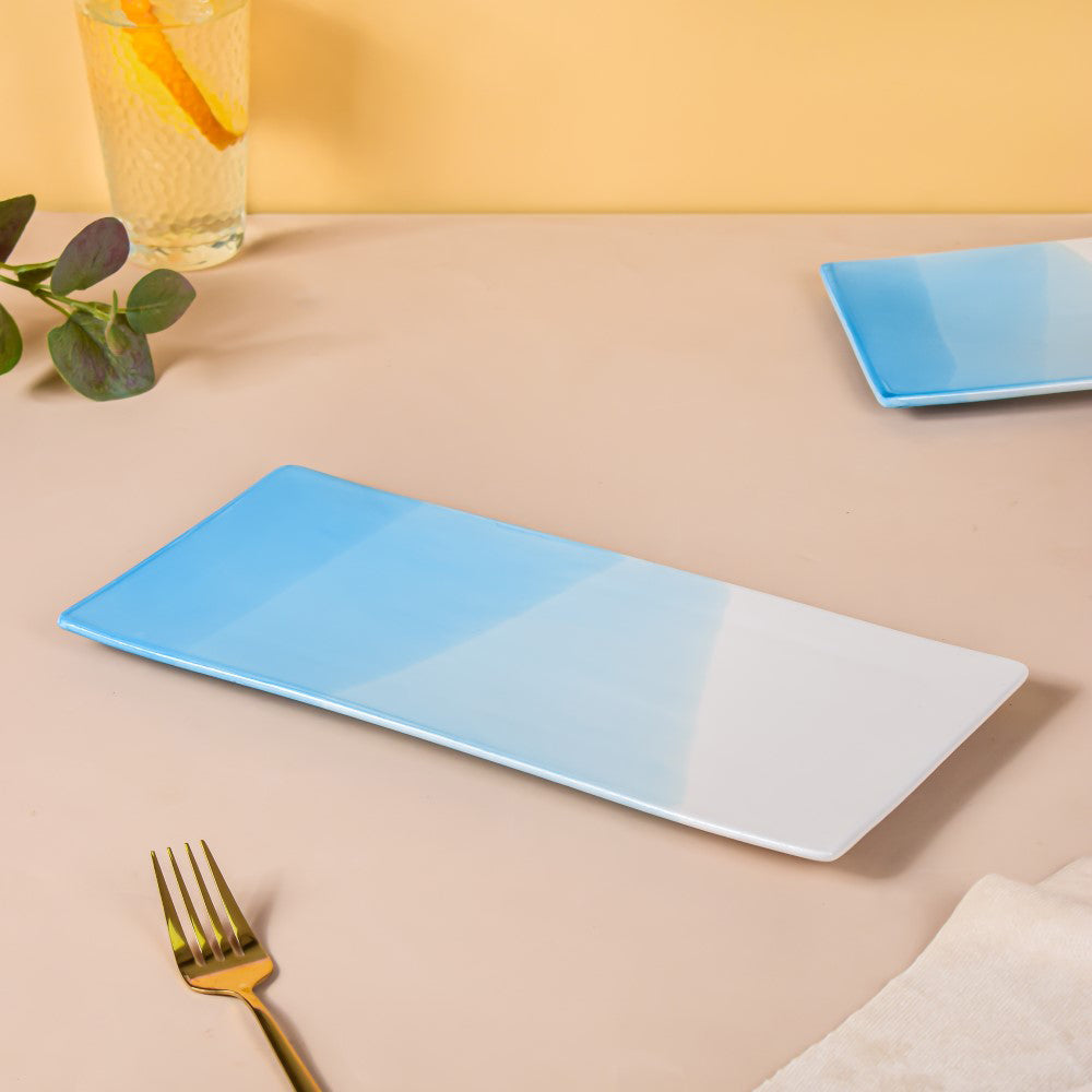 The rectangle-long ceramic platter with blue and white ombre shading is a beautiful piece of serve ware that is perfect for displaying an array of culinary creations. The elongated shape of the platter makes it ideal for serving sushi rolls, canapés, or even a fruit and cheese board. The gradient of blue and white hues adds a touch of elegance and sophistication to any presentation, making it perfect for special occasions or everyday use. The ceramic material is durable and easy to clean, ensuring that the platter will last for many years to come. Its minimalist design makes it versatile enough to complement any table setting or decor style.