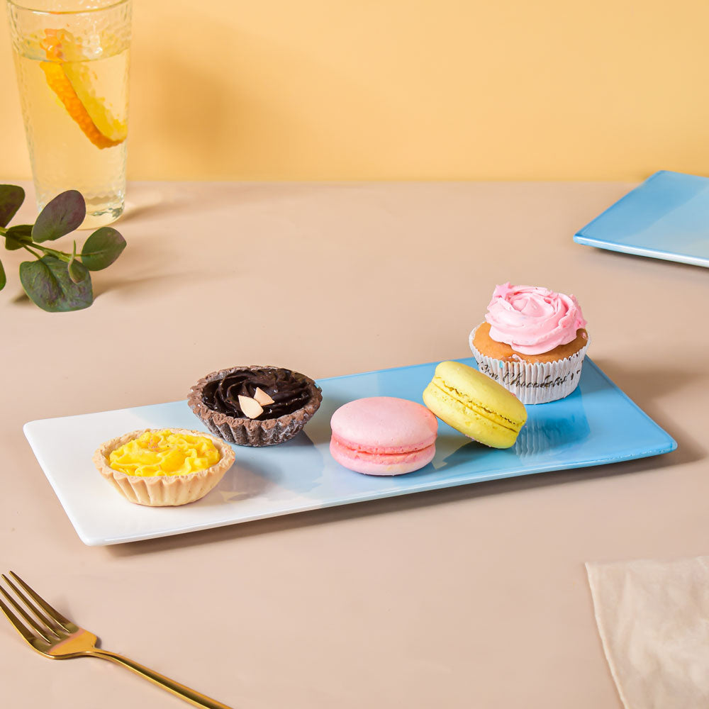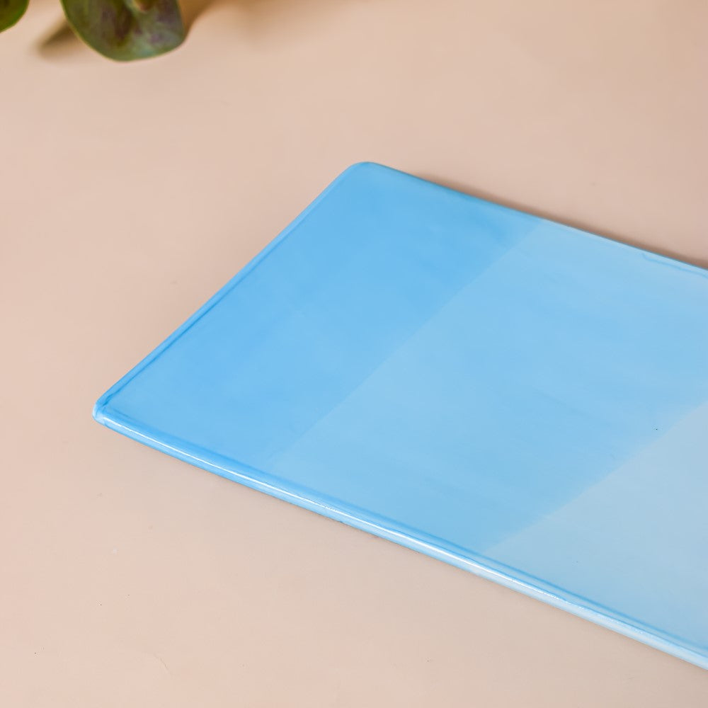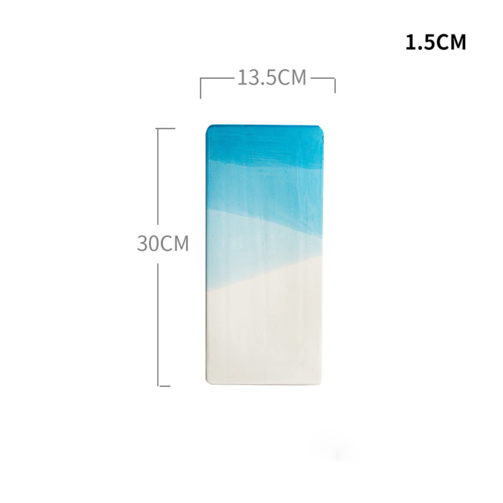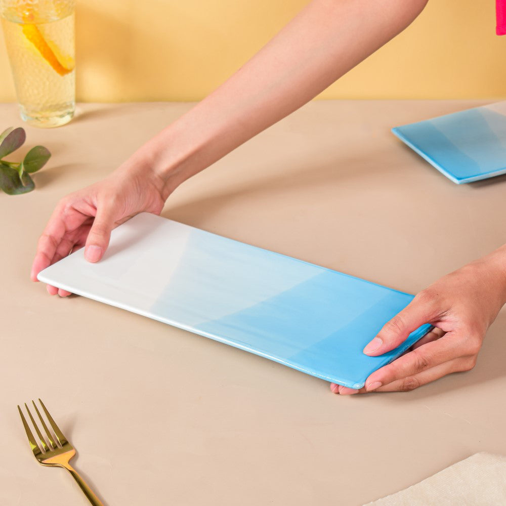 The rectangle-long ceramic platter with blue and white ombre shading is a beautiful piece of serve ware that is perfect for displaying an array of culinary creations. The elongated shape of the platter makes it ideal for serving sushi rolls, canapés, or even a fruit and cheese board. The gradient of blue and white hues adds a touch of elegance and sophistication to any presentation, making it perfect for special occasions or everyday use. The ceramic material is durable and easy to clean, ensuring that the platter will last for many years to come. Its minimalist design makes it versatile enough to complement any table setting or decor style.