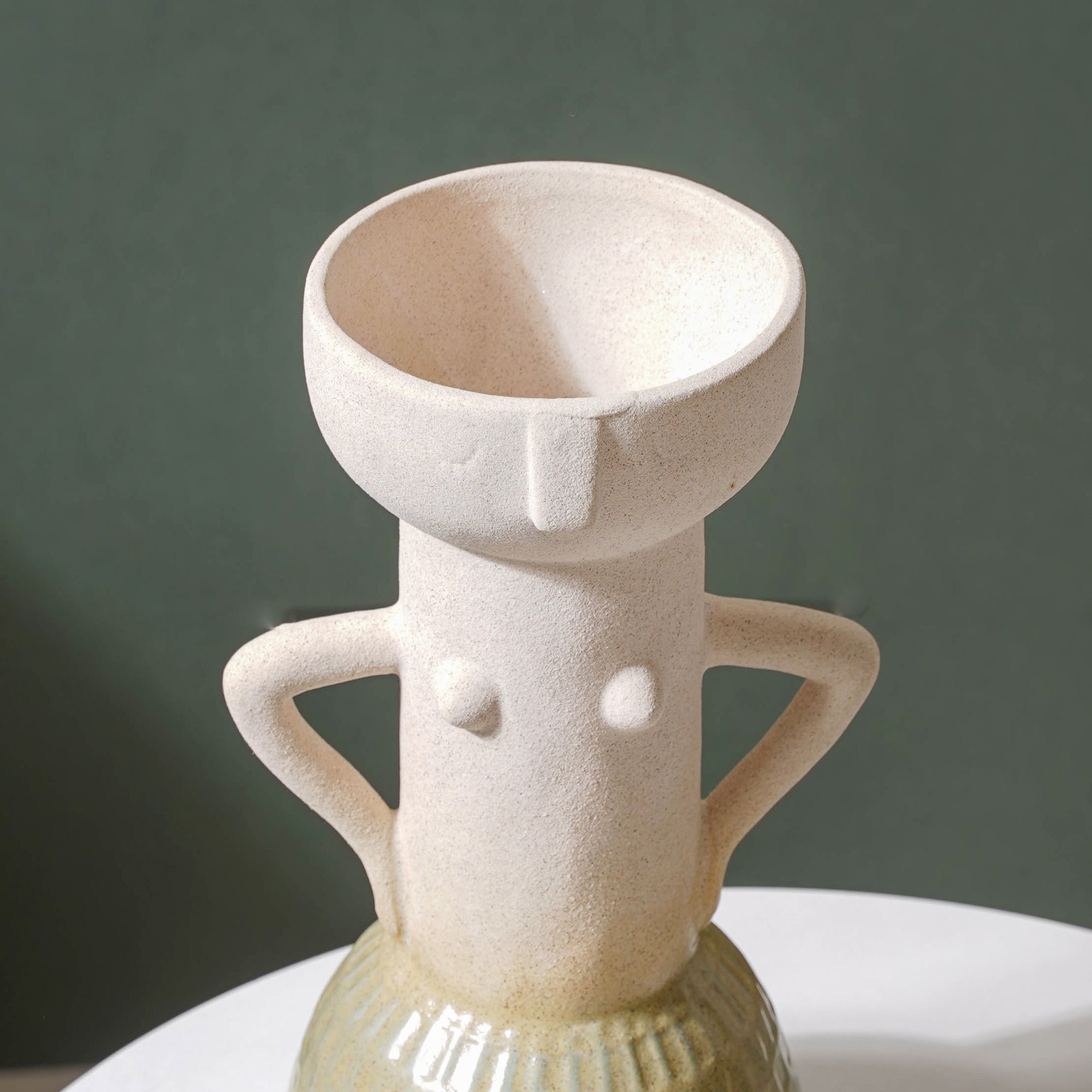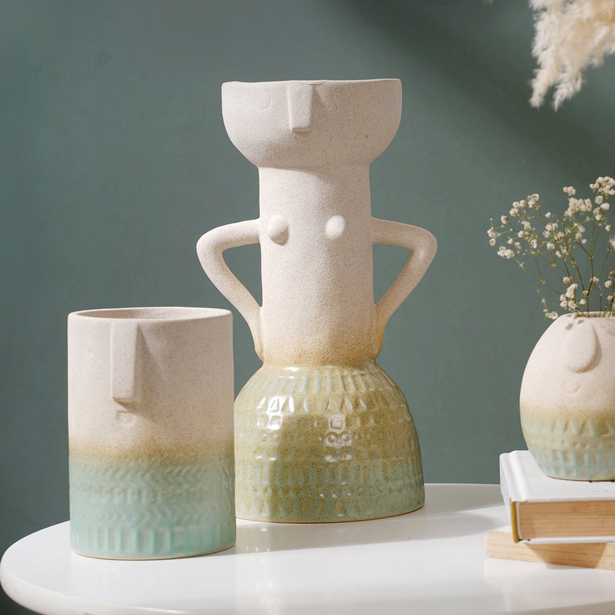The white earthen clay vase with a hint of sea green is a fantastic décor element for a living room with its unique and modern form. The unique vase, with its teacup shape at both ends, joined by a linear pipe can be used to showcase fresh flowers or to hold artificial stems. When not in use, the vase can be used as a decorative element on a side table or dressing table.