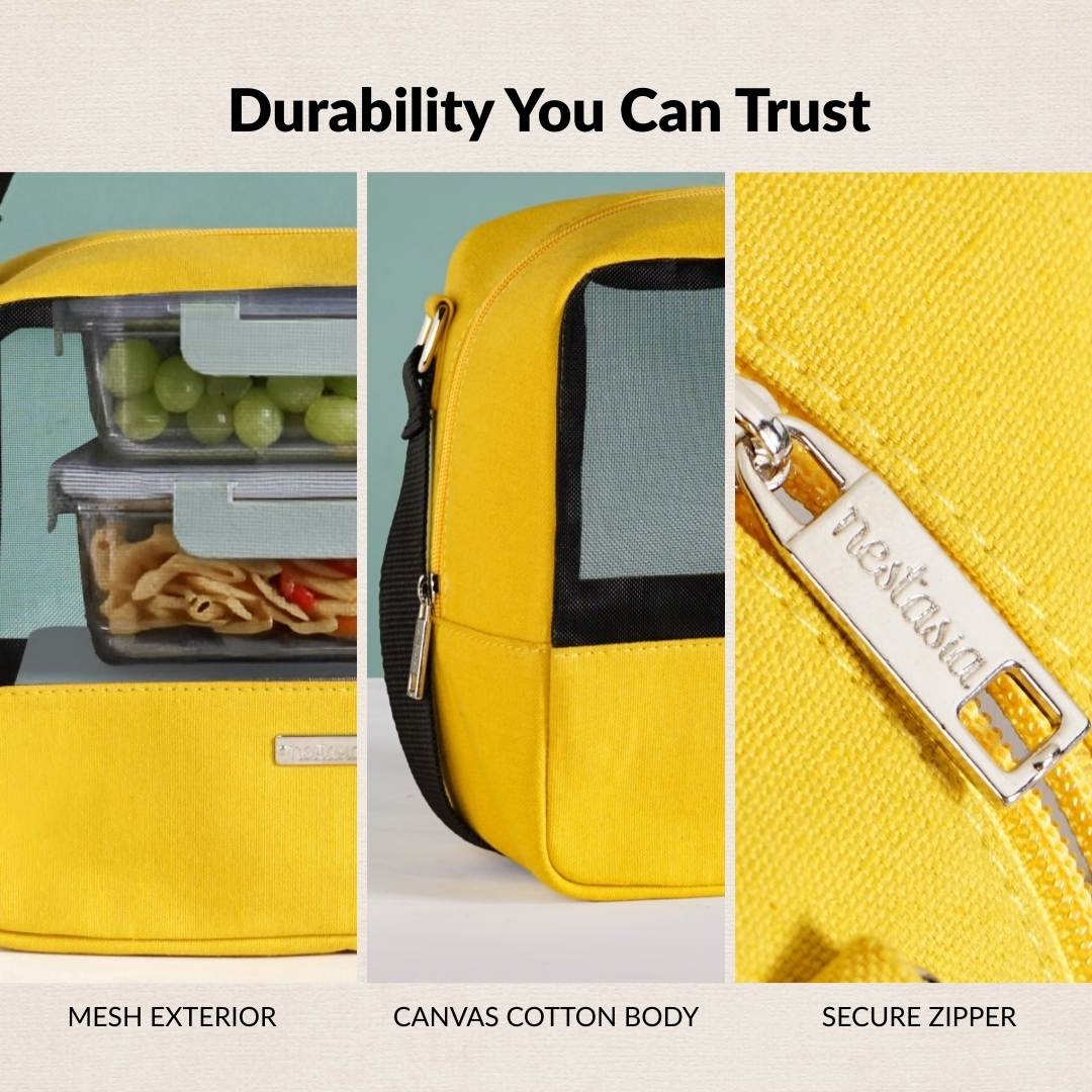 Design: Finished in a vibrant yellow shade, the lunch bag features a breathable mesh outer panel with a durable canvas cotton exterior and a smooth nylon lining. Reinforced stitched side seams support the dual-layer material build, while the spacious rectangular compartment maintains a neat, structured look. The lightweight foldable body, soft flexible fabric construction, and zippered secure closure create a compact everyday lunch carrier suited for lunch bags for men and women.