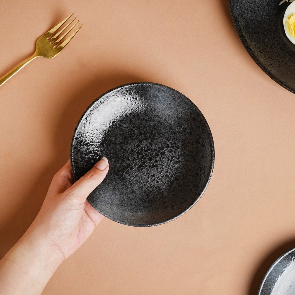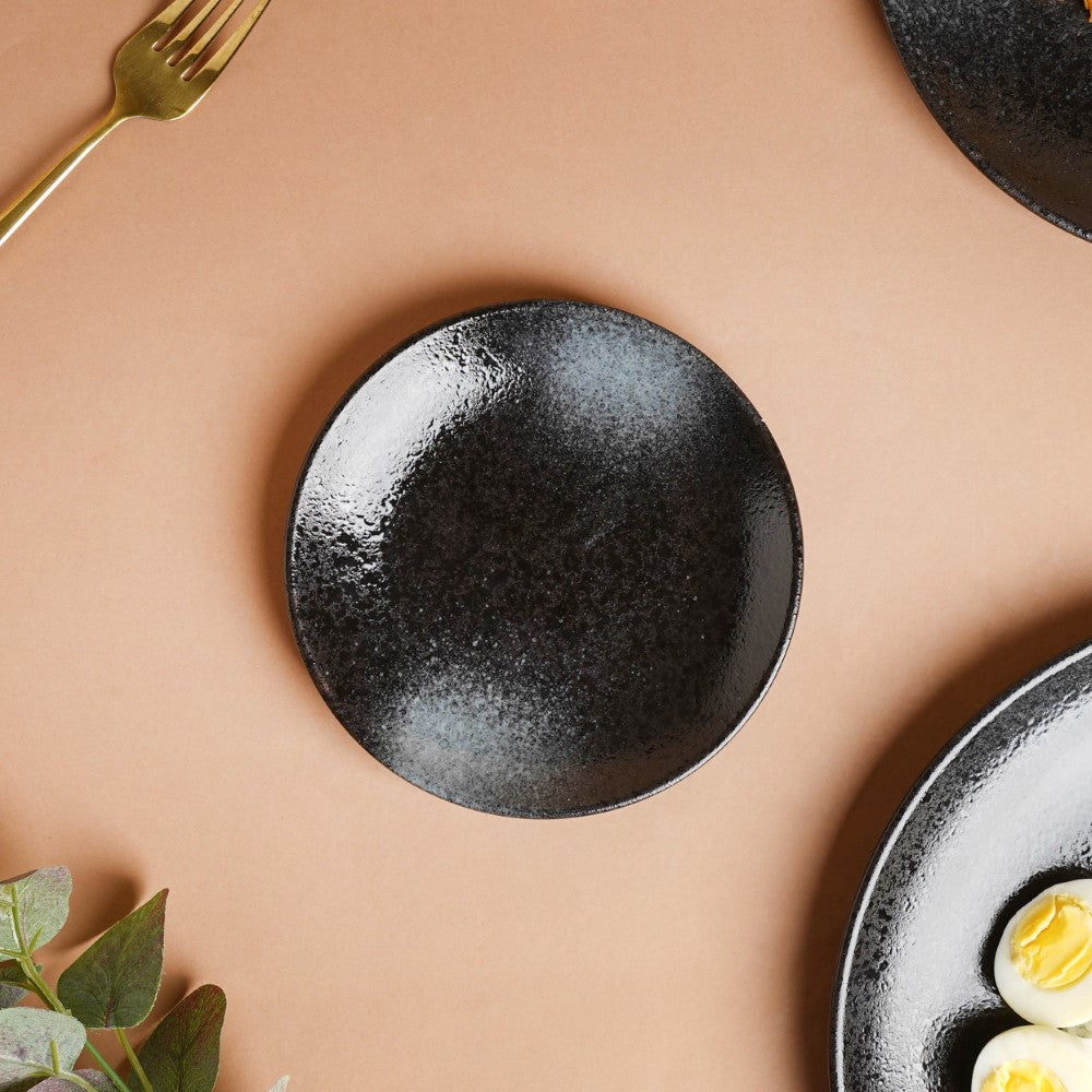 End the main course on a sweet note by serving delicious desserts on the ceramic dessert plate. The glossy stoneware plate features a combination of gloss and matte design and textures to make a stunning display on the table. The sleek glazed black handmade ceramic plate is a modern addition to the crockery collection and a ready pick for impressing guests.