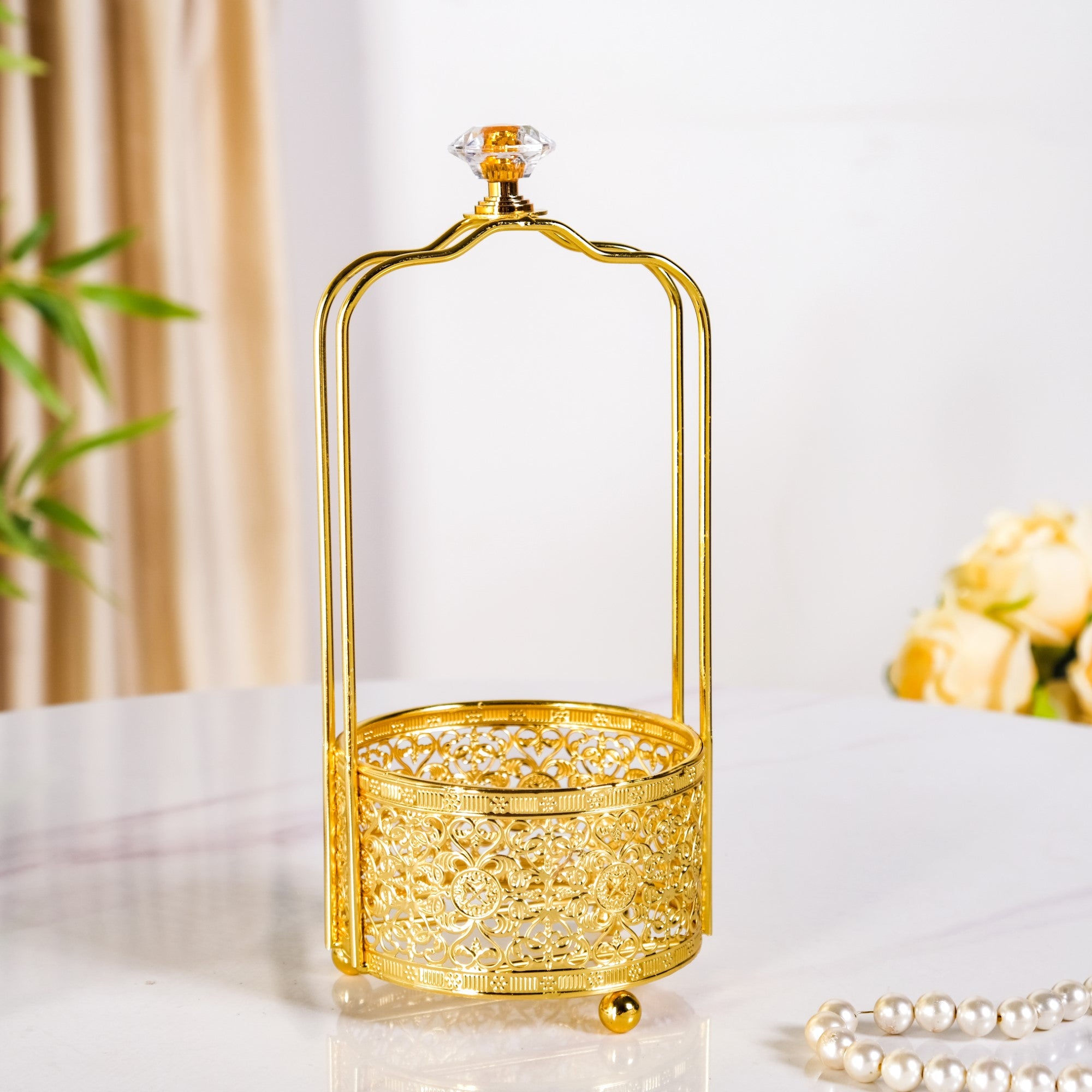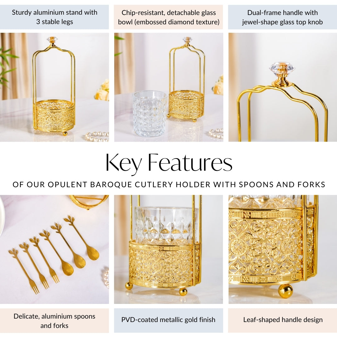 Design: Functionality meets grandeur in this thoughtfully crafted cutlery stand. The detachable glass bowl features an embossed diamond texture, giving it a refined yet sturdy finish. Resting within an intricately designed metal stand that showcases an elaborate Baroque-inspired detailing, it instantly adds a vintage charm. The handle is crowned with a jewel-shaped glass knob for an added touch of luxury, while three sturdy metal feet provide elevation, keeping surfaces protected. To complete the set, the included spoons and forks feature delicately designed leaf branch handles, blending artistic craftsmanship with everyday utility.