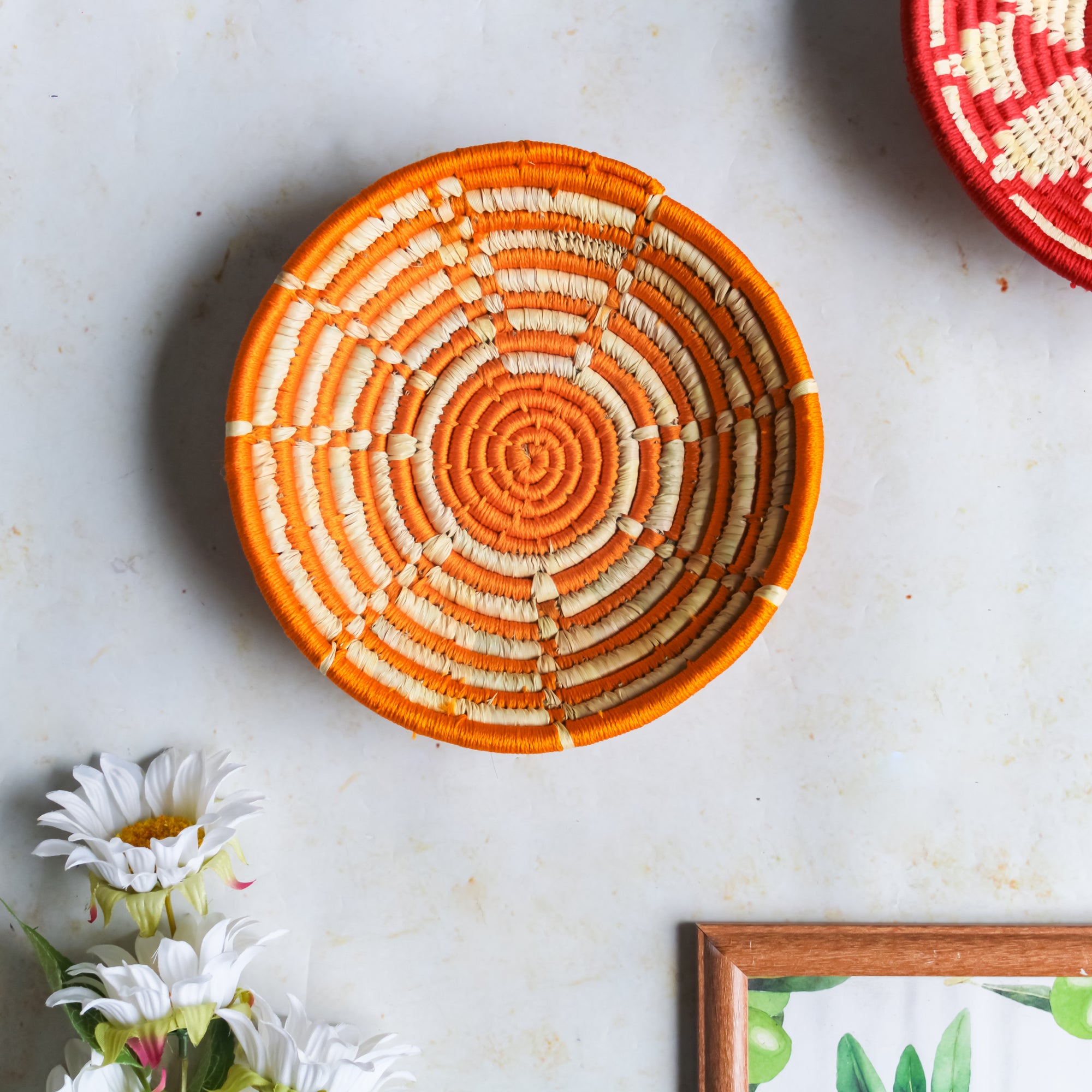 Hand woven basket crafted by local sabai artisans with utmost care. The hand made basket is made with dried sabai grass, date palm leaves and brightly colored orange nylon thread. The boho-chic look that the handcrafted basket emanates is truly exceptional and is bound to add a touch of ethnic aesthetics to any room decor. The colorful combination of orange and the natural sabai color makes it a unique and attractive addition. The colorful sabai basket can be utilized as wall decor as well.