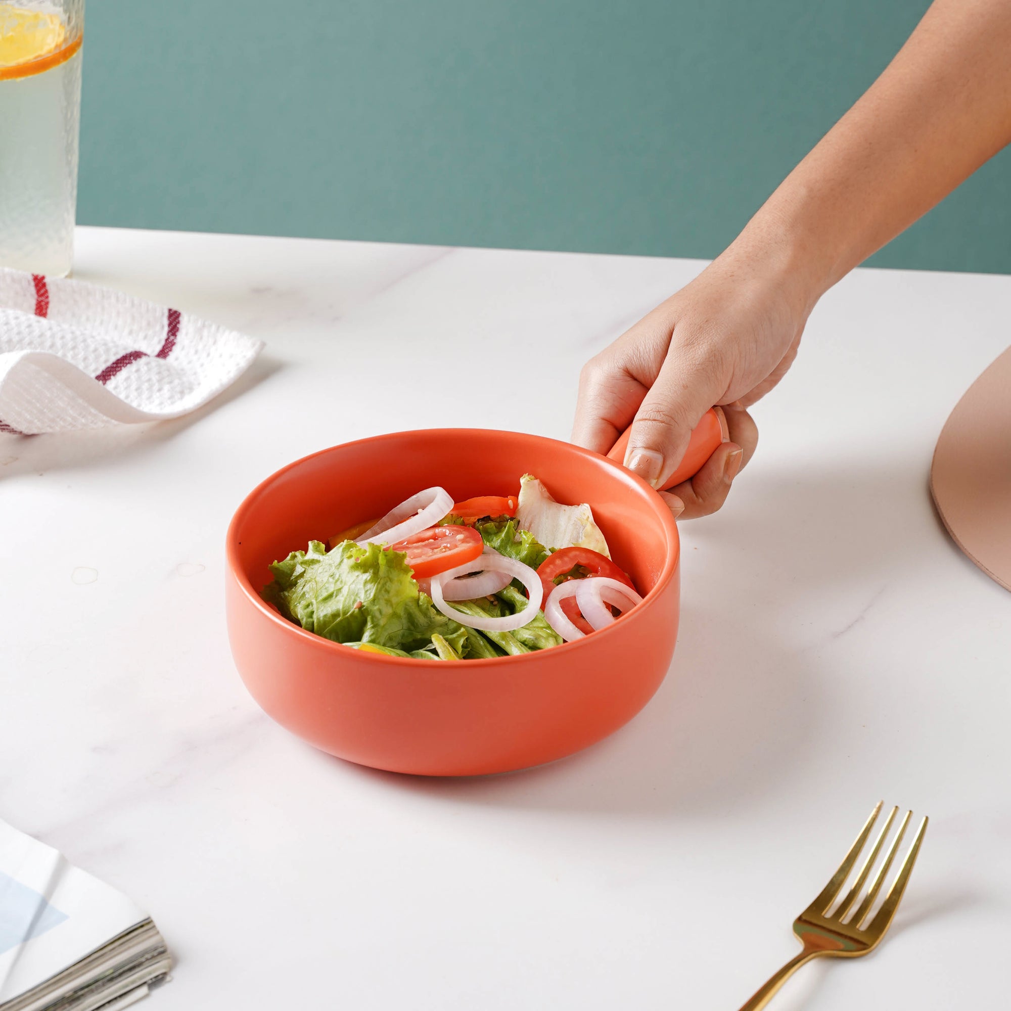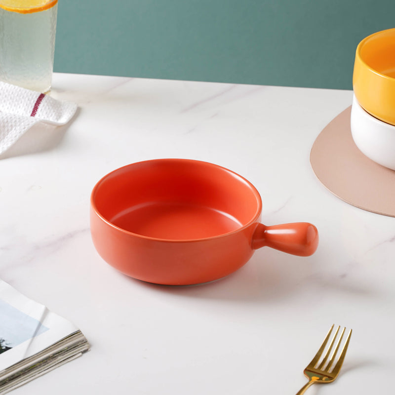 The vibrant orange bowl with handle is crafted in ceramic that can brighten up a table setting with a pop of color. The bright serving bowl can be used as a gravy bowl, side bowl, or snack bowl for serving curries, lentils with gravy, or porridge. The curry bowls come in a variety of bright, dark, and neutral shades that can together make a table setting look energetic and joyful. The handle makes it easy to serve and pass the bowl.