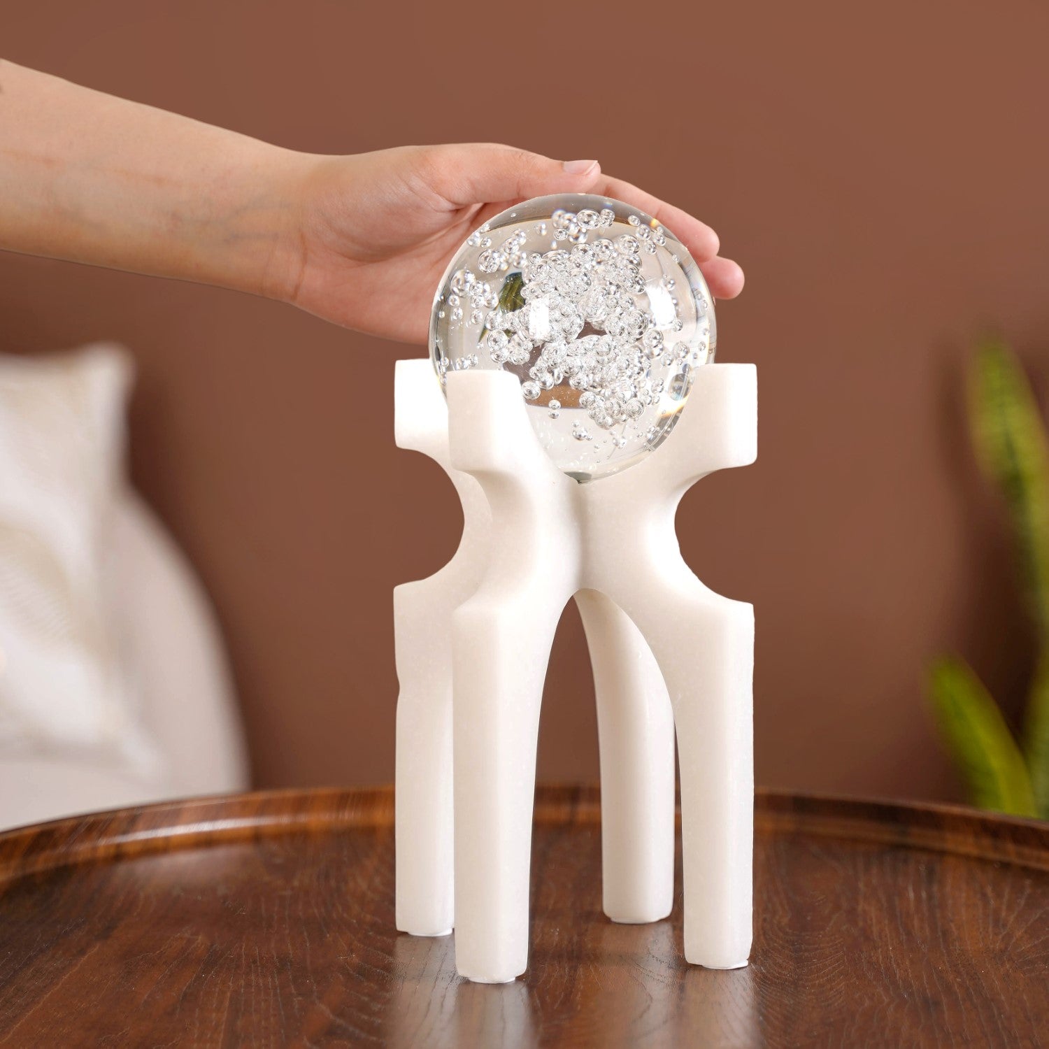 Design: The centrepiece is a magnificent, light-filled embedded glass orb that contains captivating, unique bubble inclusions, making each sculpture distinct. This orb rests atop a dynamic abstract figural stand that seems to gracefully support its weight. The stand is given a flawless monochromatic smooth finish, a choice that enhances the transparency and sparkle of the orb at its centre, showcasing true expert craftsmanship.