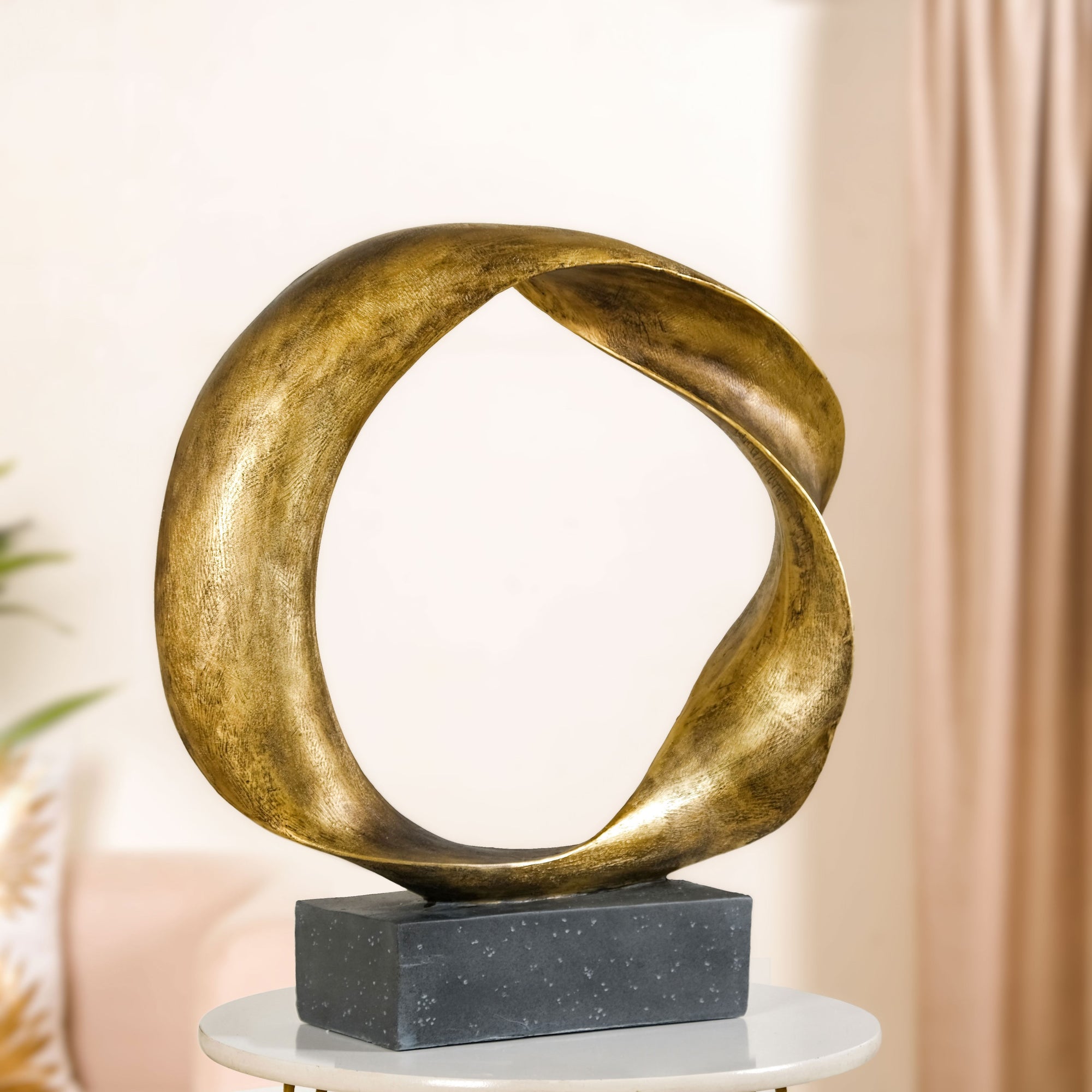 Design: This abstract sculpture is made from premium resin, and along with its bronze coloured finish, it looks like a metallic work. It features a fluid, twisted loop form finished in a burnished antique gold, set firmly on a matte black rectangular base. The organic, wave-like structure creates an illusion of continuous motion, lending a modern yet timeless artistic appeal. Its textured finish enhances depth, making it look striking from every angle. Ideal for display on consoles, office desks, or living room shelves, it doubles as both art and décor.