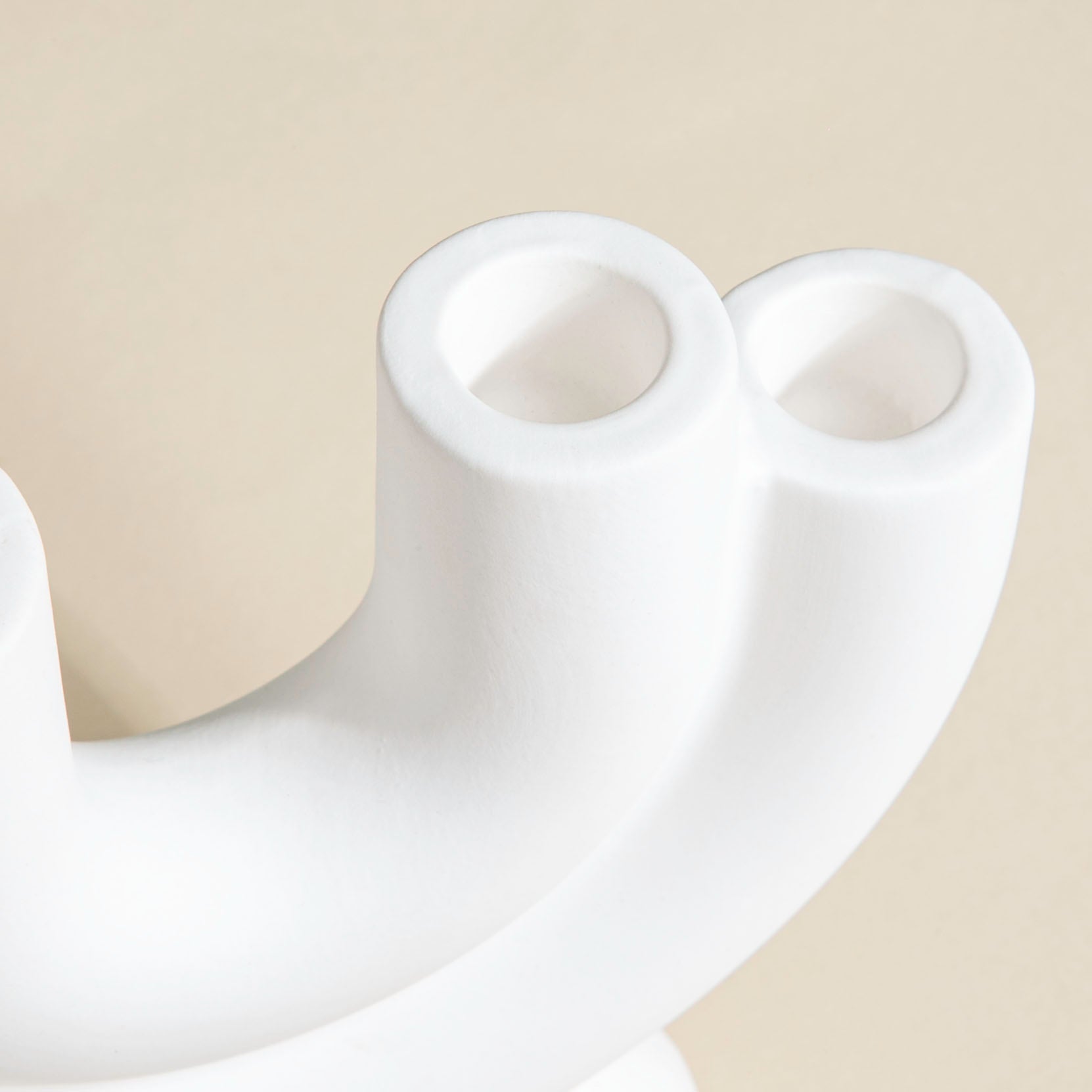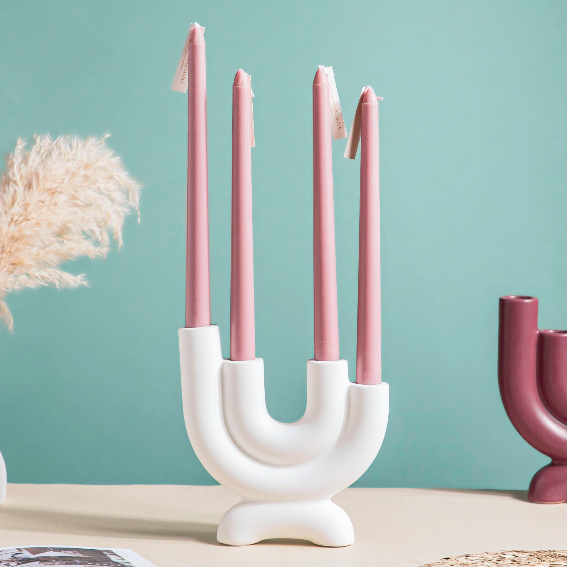 The ceramic clay candle holder features a modern contemporary design and will add an understated elegance to the interior. The candle stand, inspired by musical organs, features a unique U-shaped design and has slots to place 4 tapered candles. Featuring an ivory colour and matte finish, the candle stand beautifully complements the warm yellow glow of candle sticks to aesthetically light up the interior. The extremely durable and high-quality candle holder is the perfect candle stand for the dining table, where it can be placed as the centrepiece.