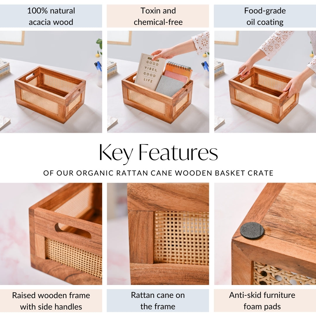 Design: A seamless fusion of natural acacia wood and woven rattan cane gives this rectangular crate an elegant yet earthy aesthetic. The raised wooden frame, complemented by sturdy side handles, ensures both durability and ease of use. Subtle variations in wood grain and cane weaving make each piece unique.