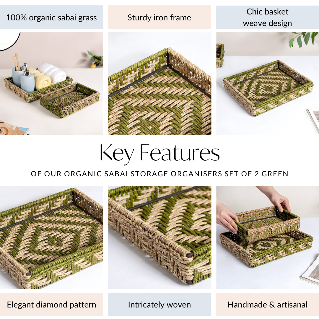 Design: Crafted from sabai grass and iron, each storage organiser features luscious grass green and sabai's naturally rustic hues. The chic diamond pattern and classic basket weave add to the warming charm of the design.