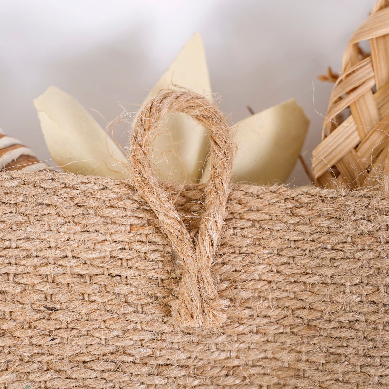 Design: This handcrafted bandarwal unveils a captivating design, featuring a prominent central cluster of intricately arranged sola flowers. These blooms are a delightful mix of creamy white and deep maroon hues, creating a beautiful contrast against the natural jute base. Each segment showcases smaller, detailed sola flower arrangements along with dried leaves, offering a textural beauty and a refreshing burst of colour. The piece culminates in elegantly braided jute tassels adorned with subtle floral details at both ends. It has multiple jute knots throughout the edges of the bandarwal for easy hanging.