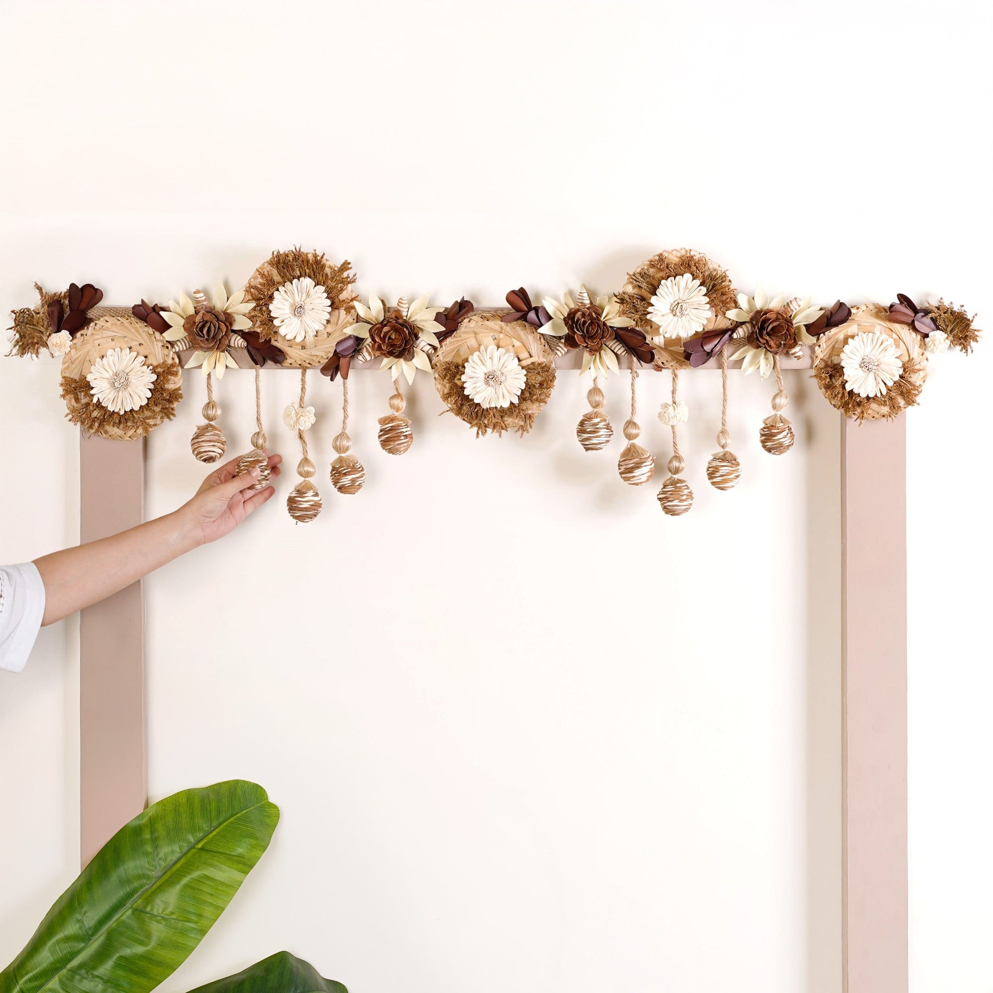 Discover the artistry of natural decor with this meticulously sustainable bandarwal, created to adorn your home. The toran is handcrafted with sola flowers and dried flowers for a touch of earthy elegance.