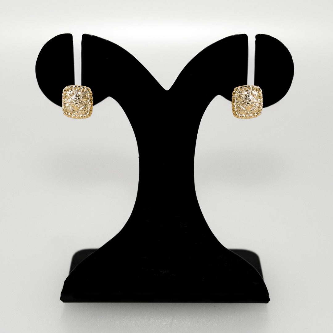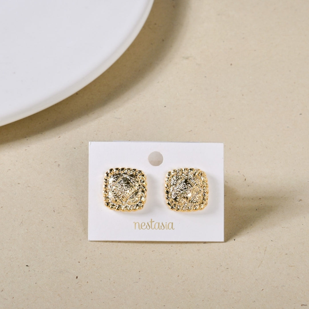 Drape your ears in sophistication with these exquisite gold stud earrings. Crafted in a sleek square shape, each stud features intricately carved geometric patterns that exude charm. The textured surface mimics the delicate crinkle of gold foil, adding a rich, luminous dimension to the design. Framing the edges are ornate swirls, enhancing the studs with a touch of vintage allure.