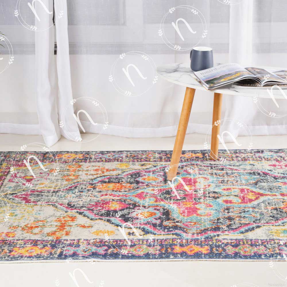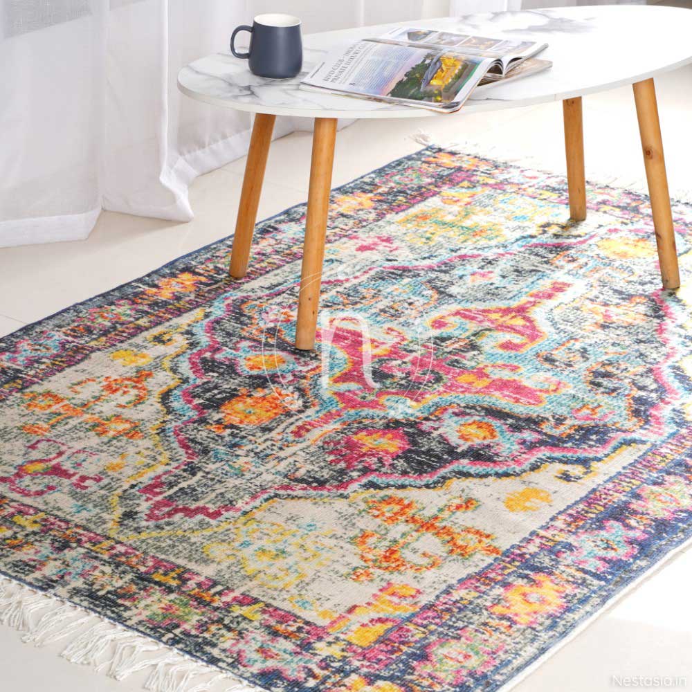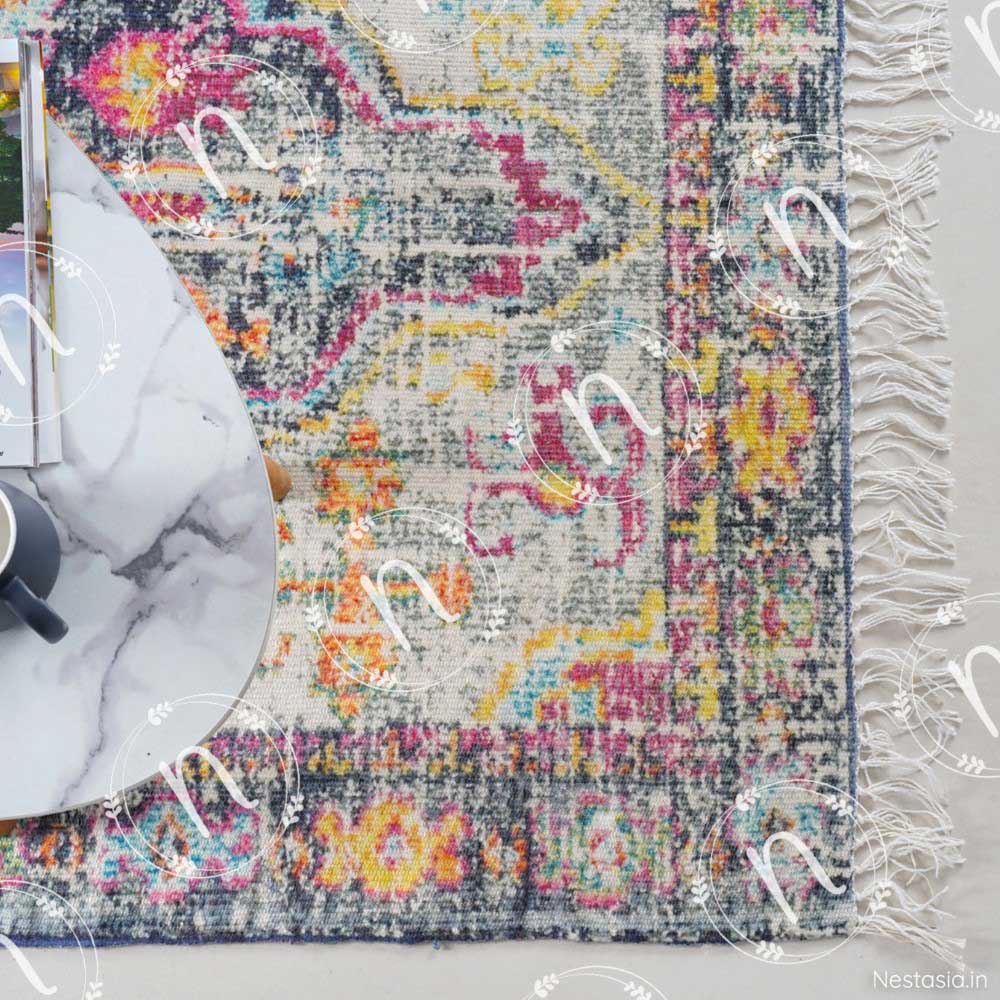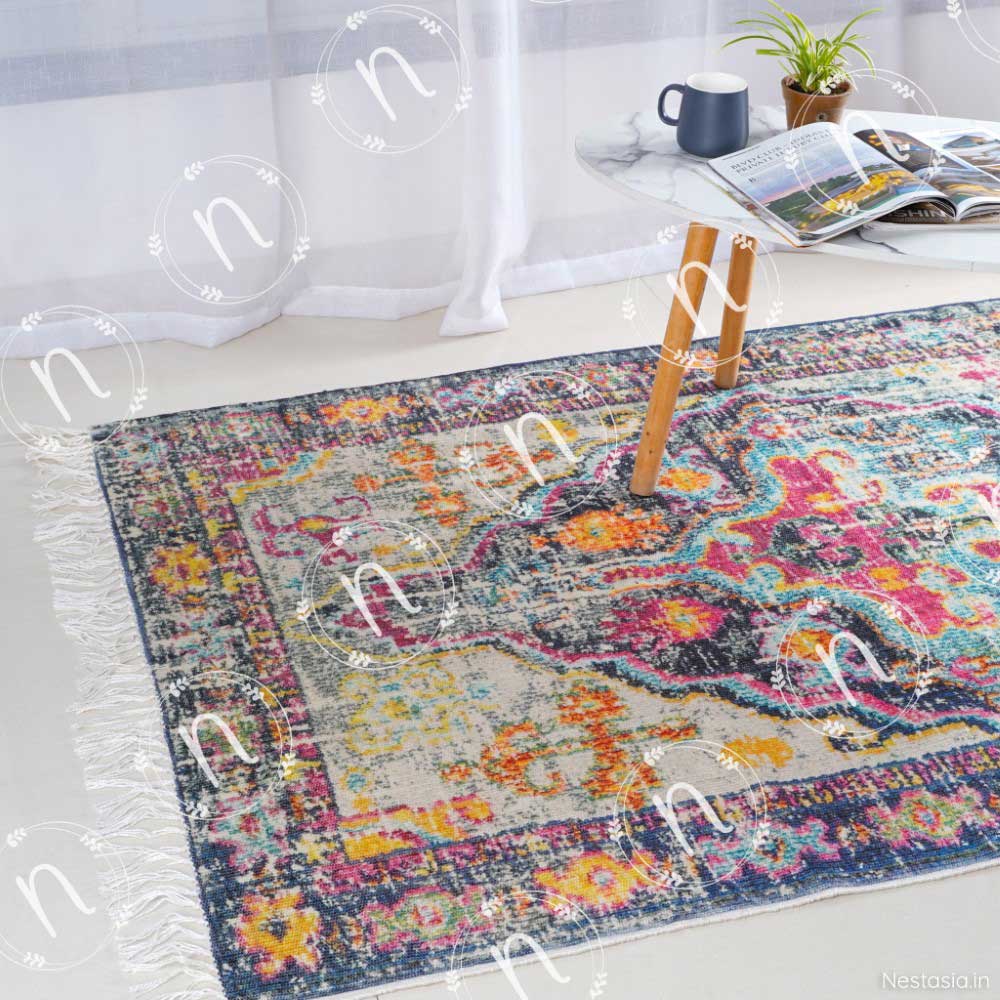 Outdoor rug in pet yarn can elevate any home or modern living space. The multi coloured rug comes in a sturdy material which is very easy to clean and can be used as a garden rug or picnic rug. The printed rug can be a colourful addition to any living room as well. Rugs for living rooms can also be placed in the balcony along with planters for a bohemian look.