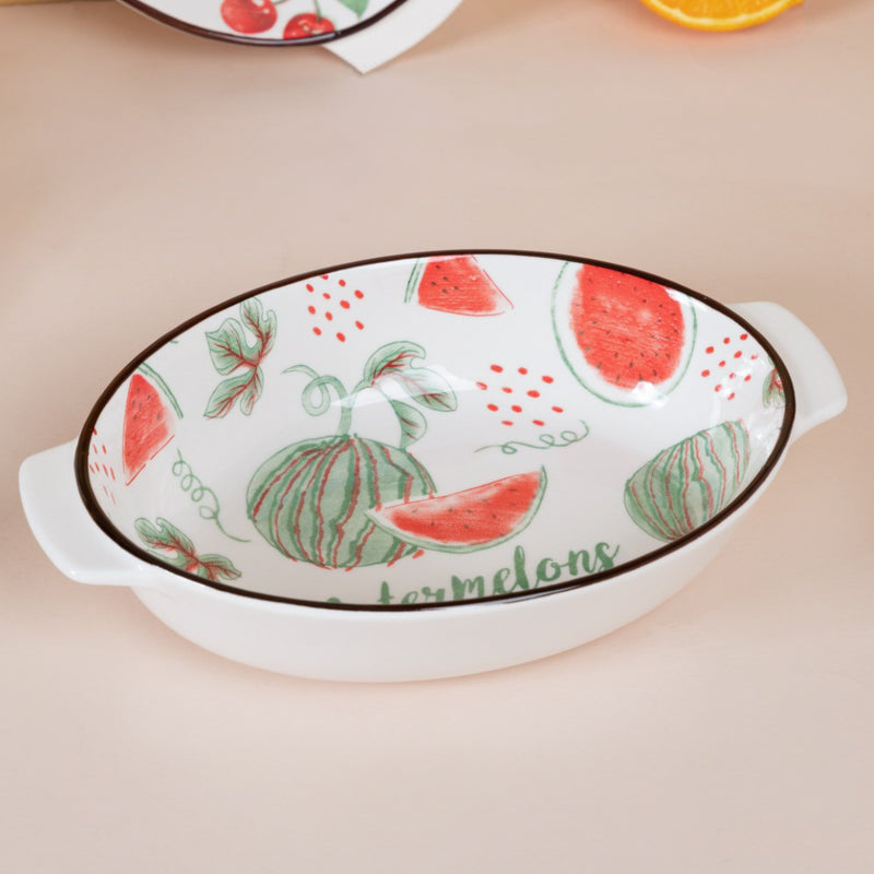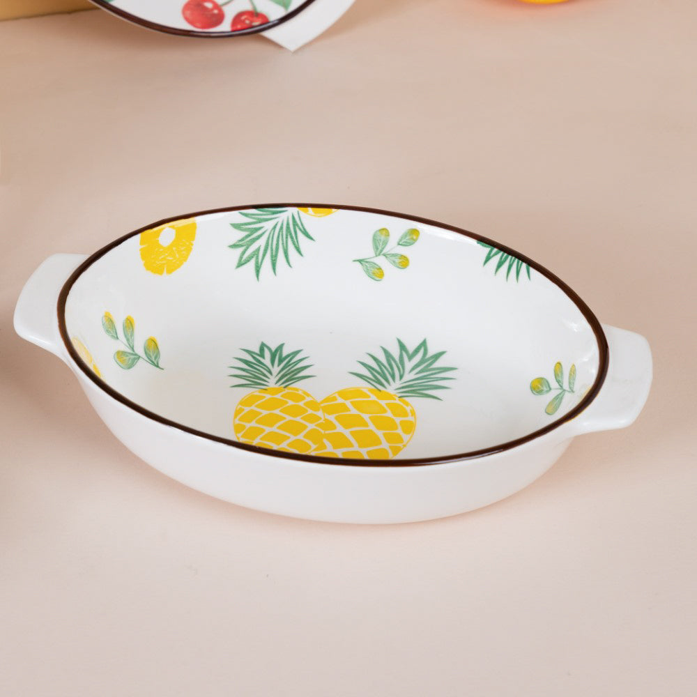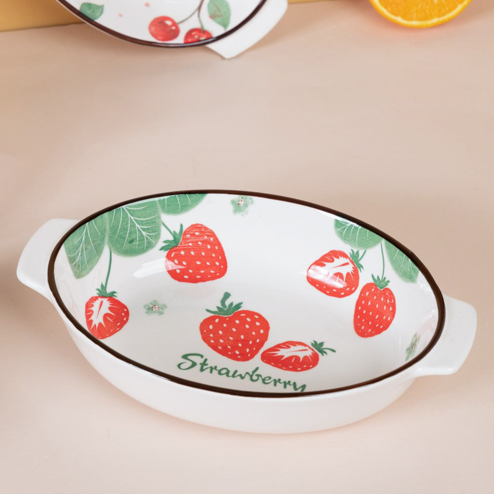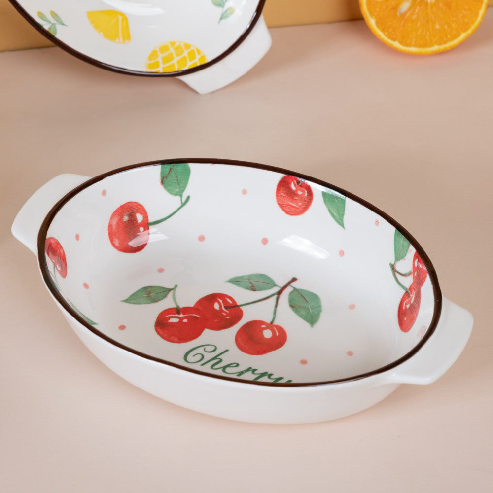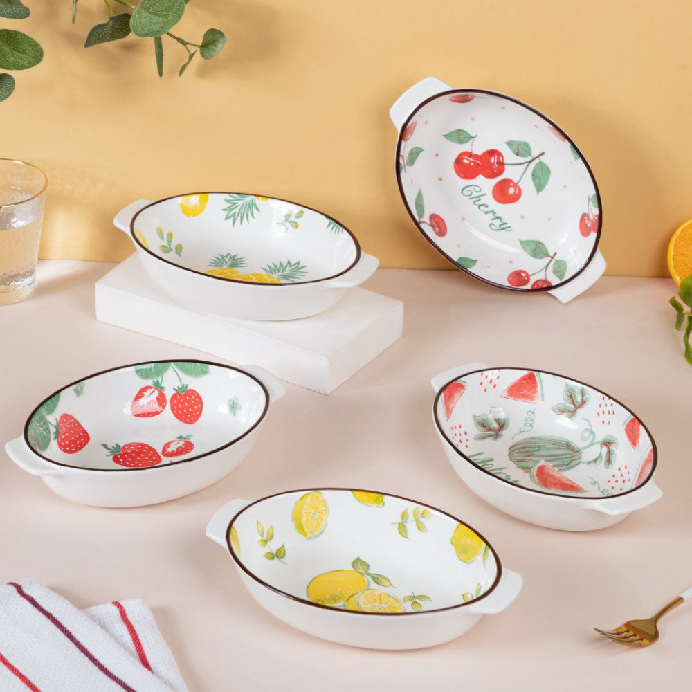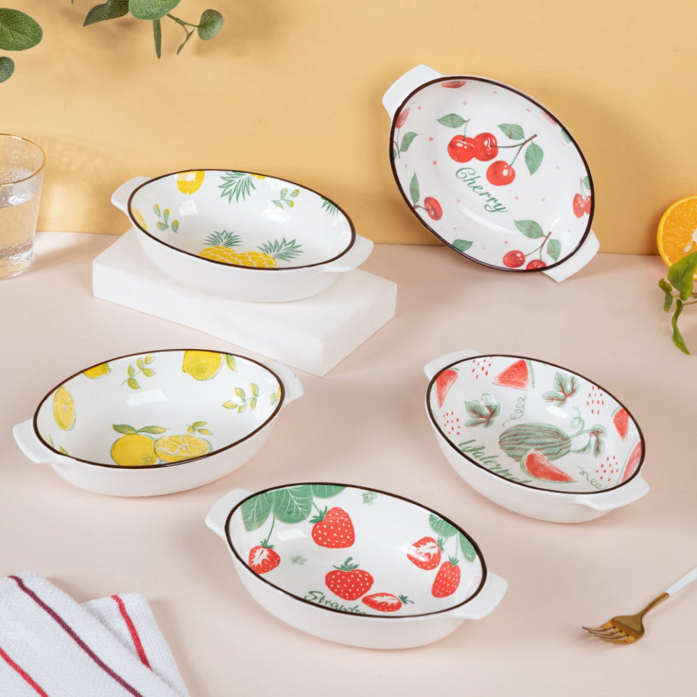 White ceramic bakeware pans that have fruity and flowery patterns on the inner surface. The oval shaped dishes can be used to bake and serve a variety of foods such as pasta, salads, kebabs, desserts like cakes, mousse and more. The baking bowls come with handles on both sides, making them easy to carry and serve. The ceramic bakeware can be used to enliven a serving and add a splash of colour to an informal dinner table environment. One can also use the ceramic baking bowl as a oval cake bowl mold. The baking dishes are microwave safe and dishwasher safe.