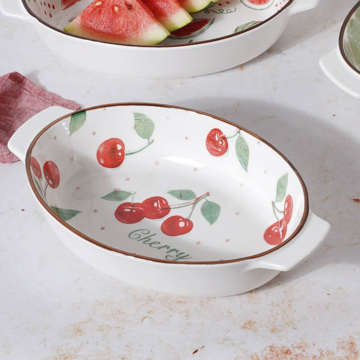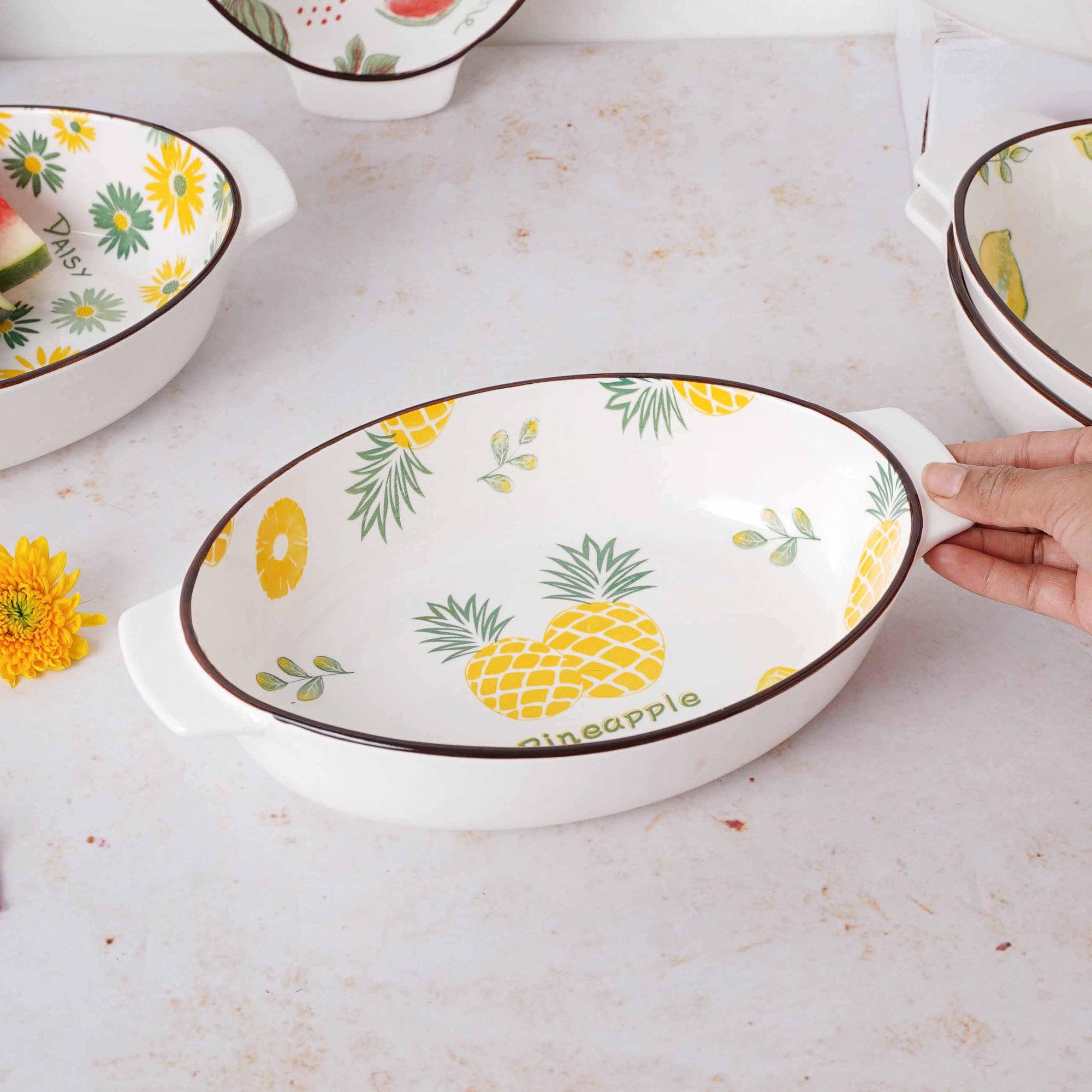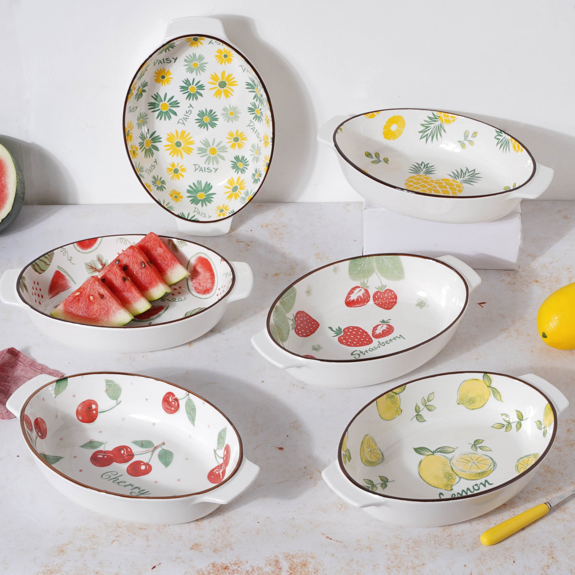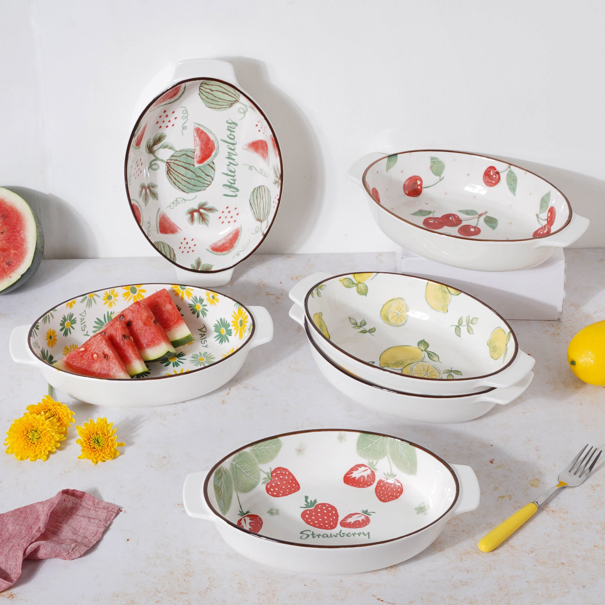 White oval ceramic baking pans with pleasant fruity and floral designs. The bakeware comes in six different patterns that are quirky and colourful. Kebabs, pastas, chicken and more can all be baked in the baking pans. The dishes have handles on both sides, making them easy to carry and serve. The baking bowls can also be used as serveware to serve breakfast and meals. The ceramic bakeware can be used to add colour and interest to a table and are perfectly safe to be used in a microwave, oven or dishwasher. The microwave safe bowls are good for both heating and baking.