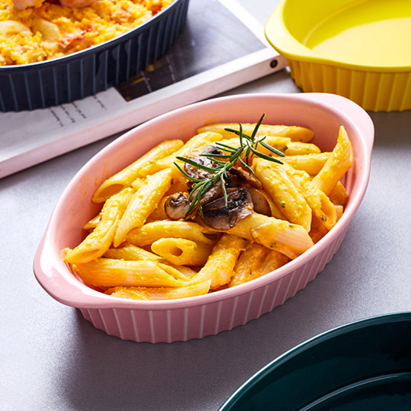 Microwave baking pan that comes in a pink colour looks stunning on the table. Use the ceramic dish to bake both sweet pie and savories like pasta and lasagna. The bakeware is not only great for baking pie, tart, pasta or veggies, they can also be used for serving snacks and knick knacks.