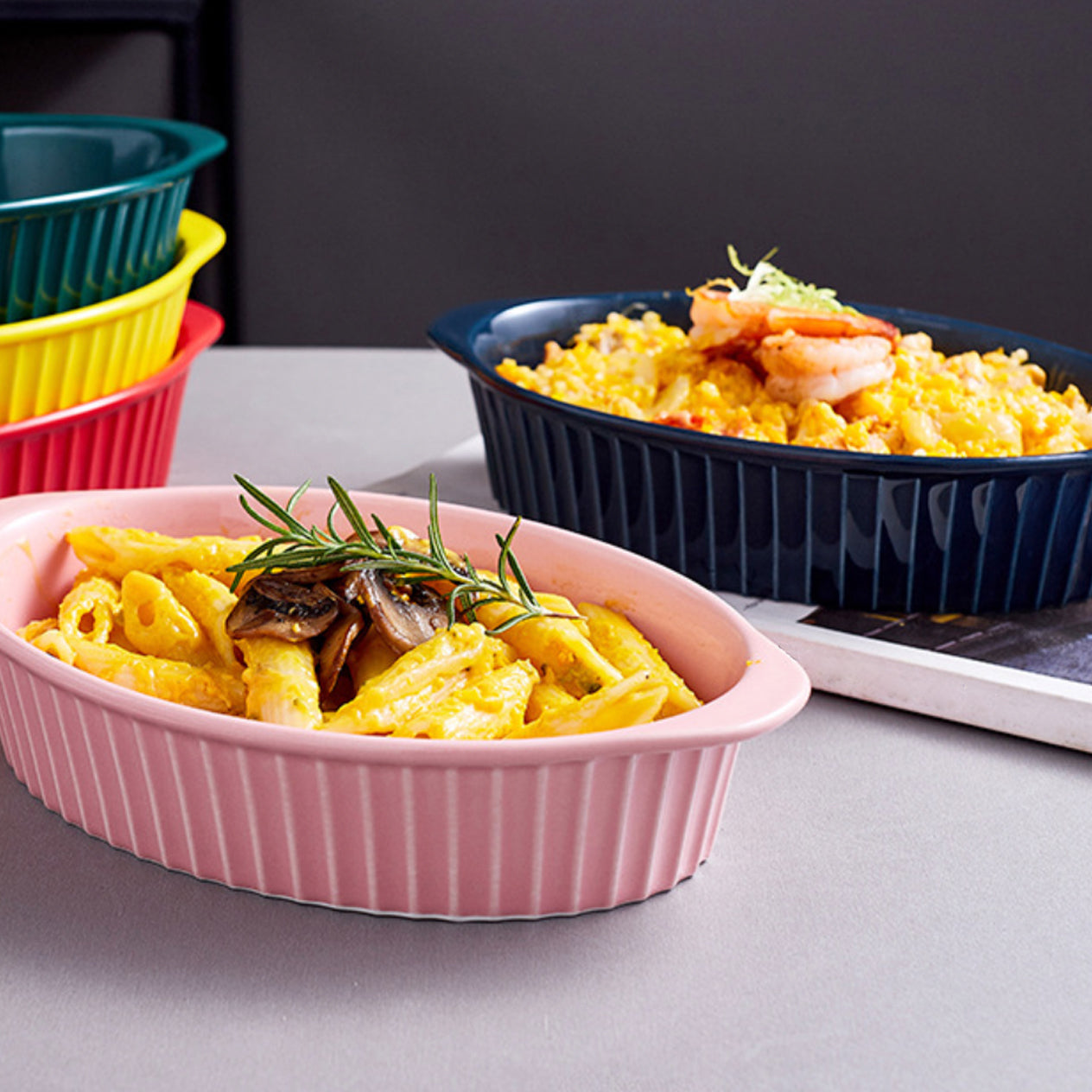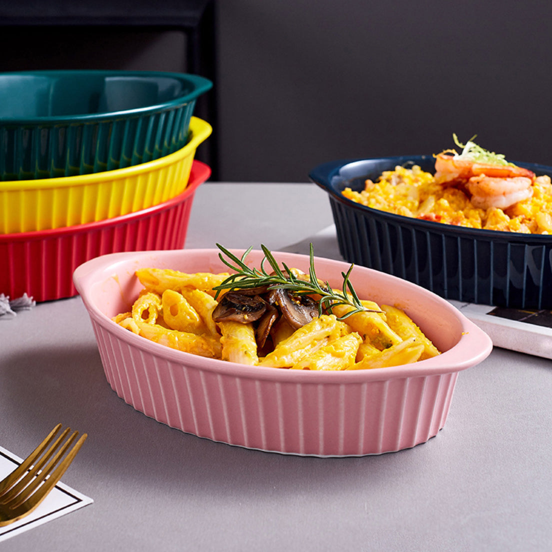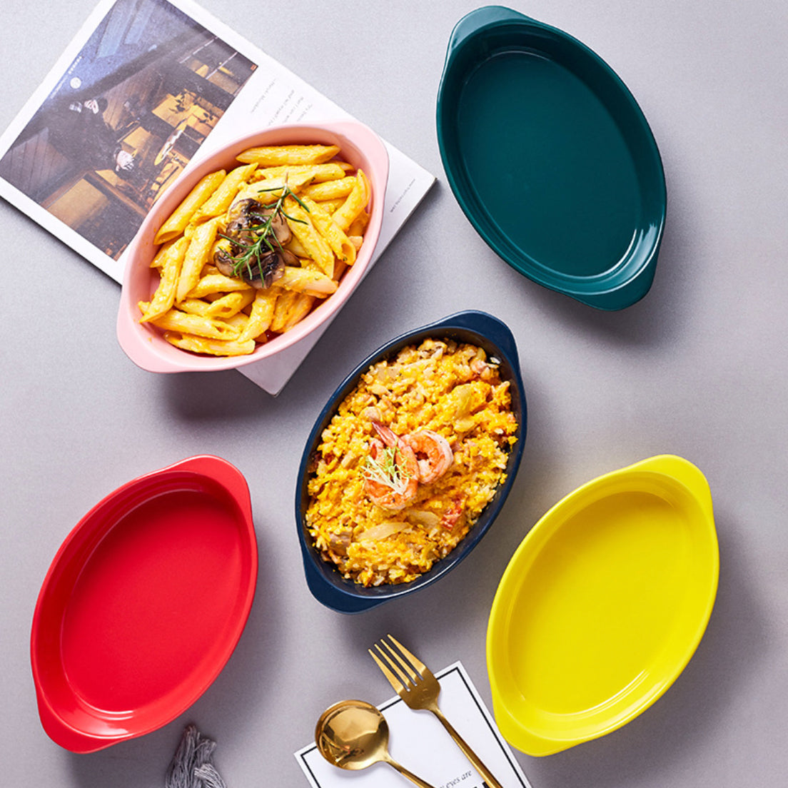 Nestip: Pair the baking dishes with the ramekins of the same colour to serve puddings with ice cream