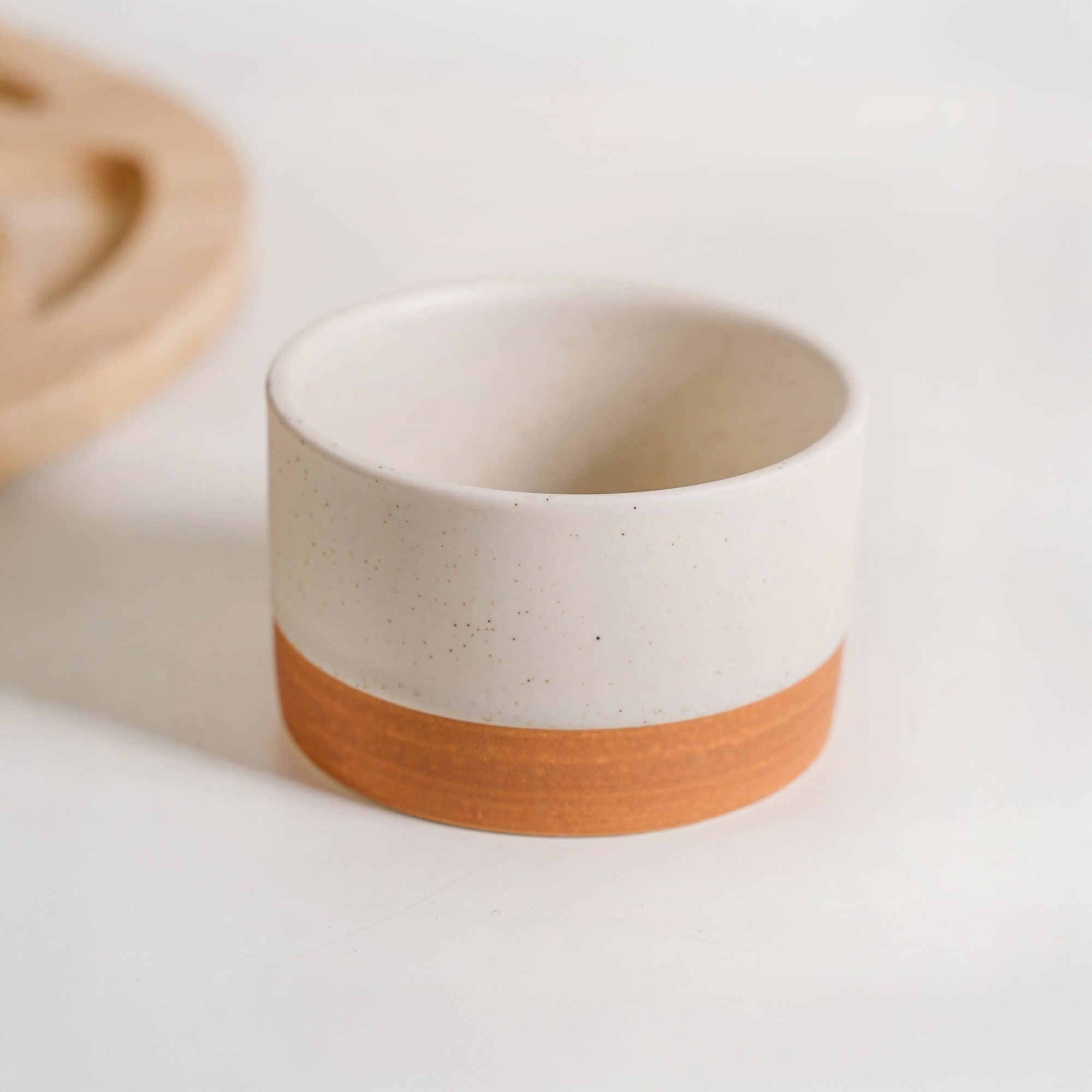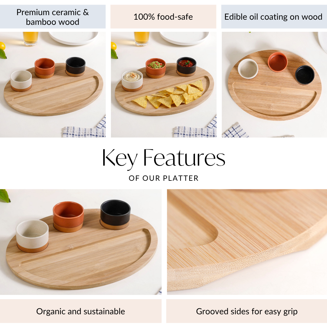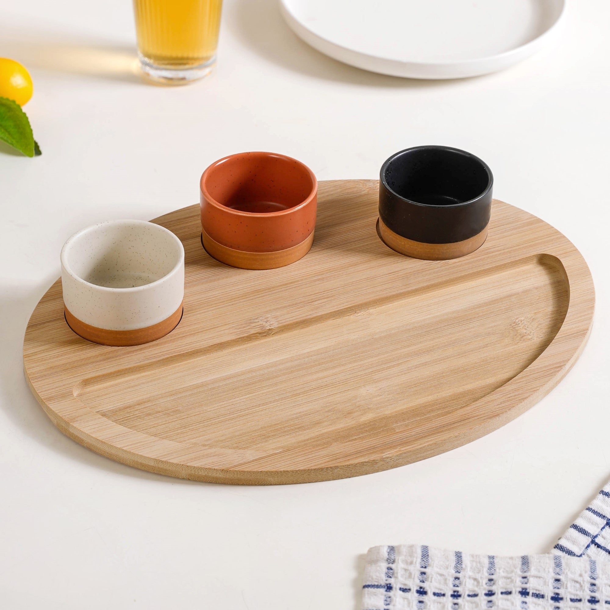 Design: This oval platter set with a bamboo tray and bowls features three ceramic bowls nestled in their respective slots. The bowls showcase a contemporary, colour-blocked design in three distinct shades: one off-white, one terracotta, and one black, each with a light brown rim at the base and a subtle speckled finish. The base tray is crafted from light, natural bamboo, with gently grooved sides. The smooth, minimalist aesthetic of the wood perfectly complements the rustic finish of the ceramic dip bowls.