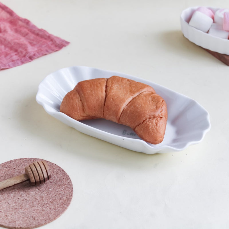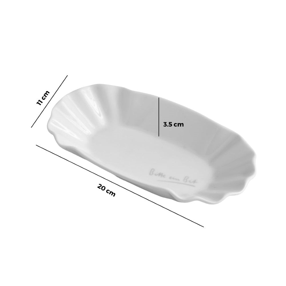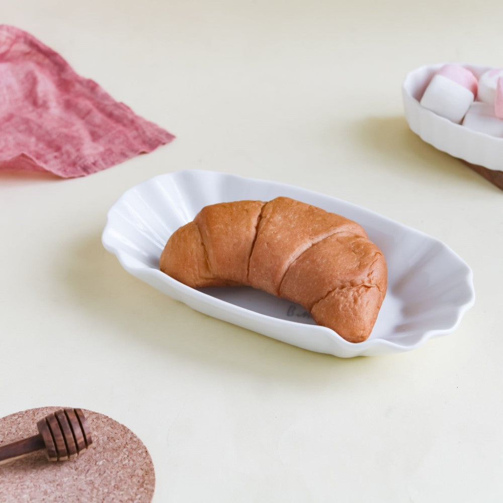 Oval snack plate in white ceramic that has a textured and heightened outline. The ceramic plate can be used as a serving plate or a serving platter to serve starters or snacks before the dinner plates are served. Serve breads, croissant, chips, kebabs, sandwiches and more in the quarter plats. The white ceramic plates can also be used for heating food in the microwave.
