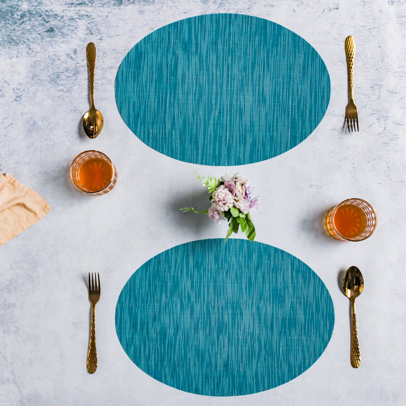 Set of two oval table mats or placemats made of high-quality, long-lasting material. The place mat's bright blue hue gives it a smart and chic appeal. The placemat can be used to place and arrange makeup pouches and storage boxes on the dresser, as well as on the side table, coffee table, and study table. The colourful table mat protects the dinner table from heat, stains, and heat damage and is a great addition to any home.