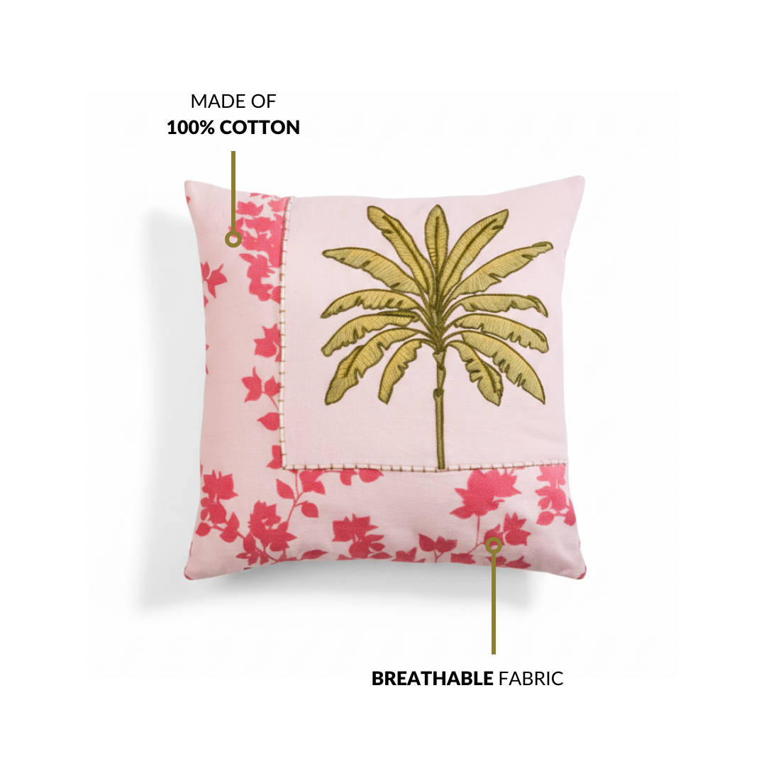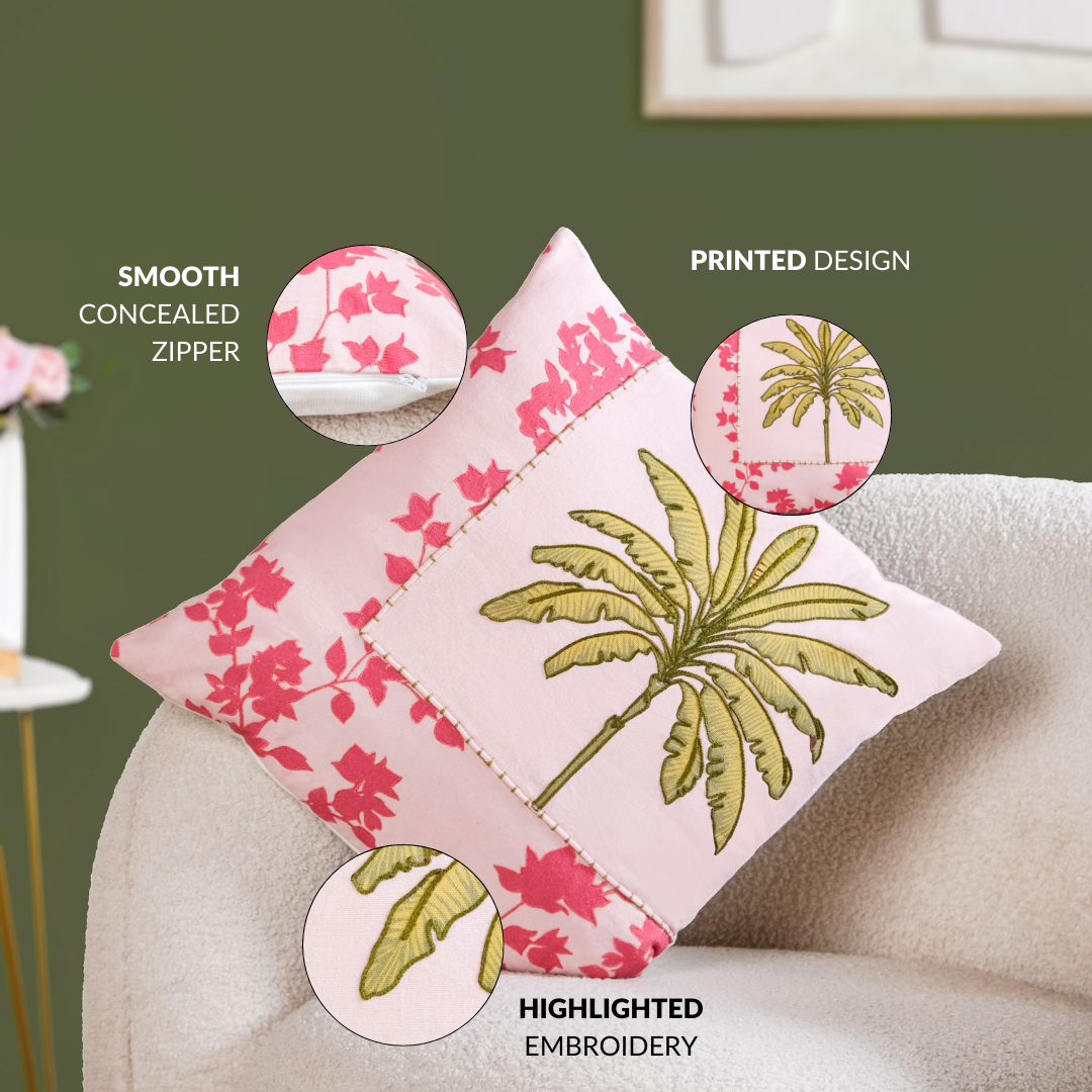 Design: Set on a soft blush base, this printed cushion cover features highlight embroidery on a palm motif framed with floral accents. The combination of printed and embroidered details creates depth, while the soothing pink and green palette adds a calm, tropical elegance to your decor.