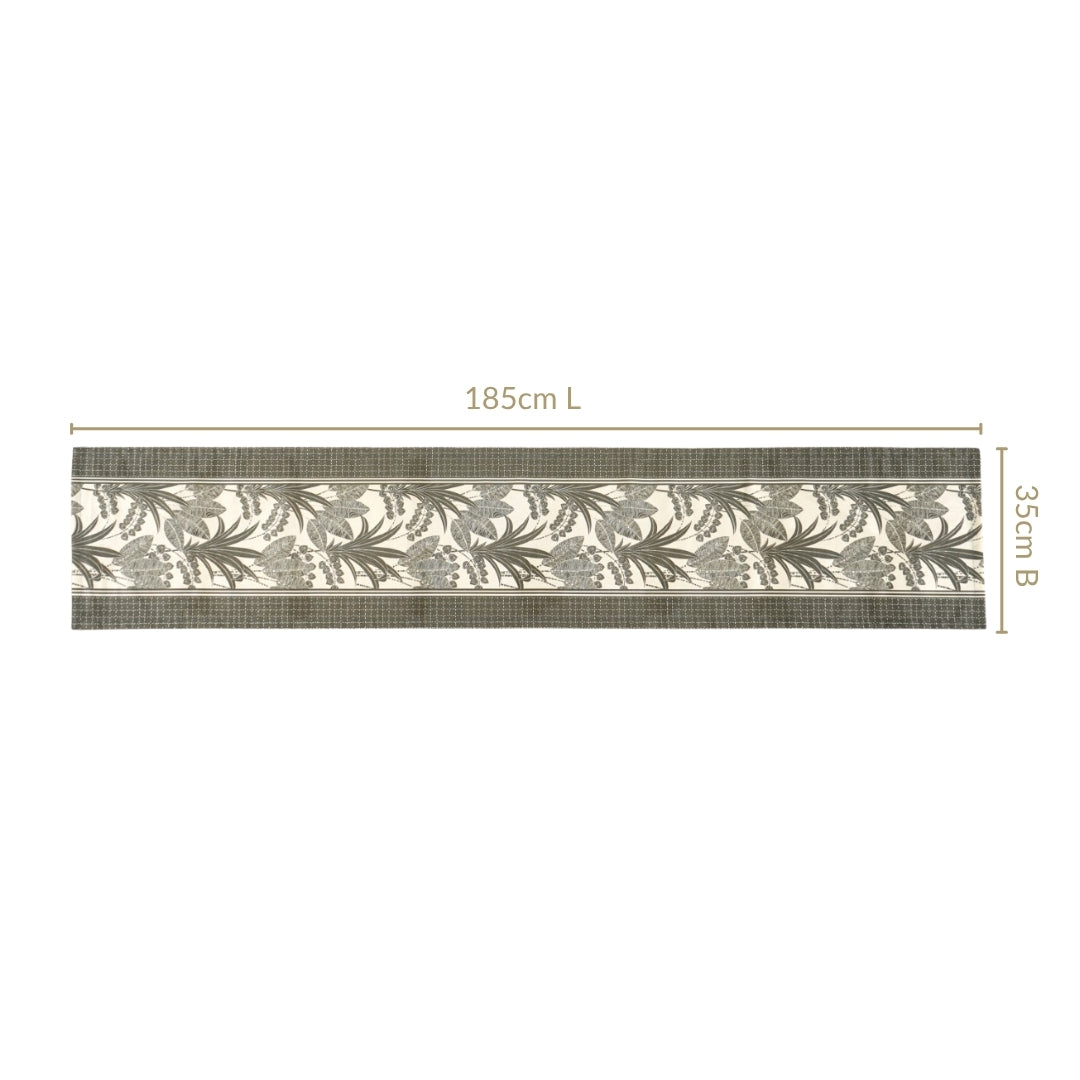 Design: This pure cotton table runner set with an acrylic polymer coating showcases a sophisticated botanical print in soft sage green tones, featuring intricately drawn tropical leaves. The centre is adorned with detailed foliage motifs, bordered by a structured geometric pattern that adds balance and depth. The fabric’s natural texture enhances the overall aesthetic, giving it a refined, earthy charm that perfectly complements both modern and traditional dining setups.