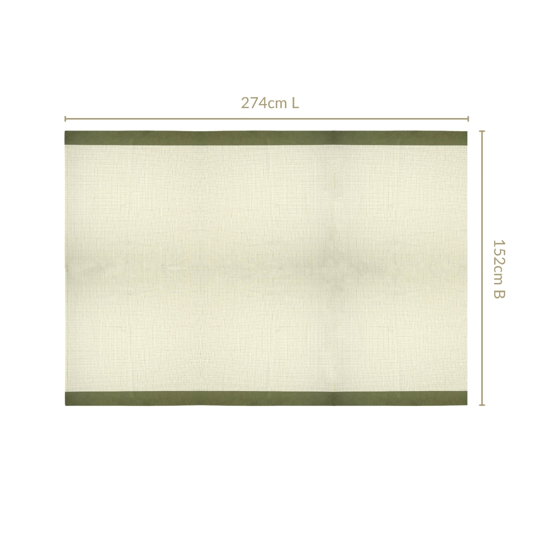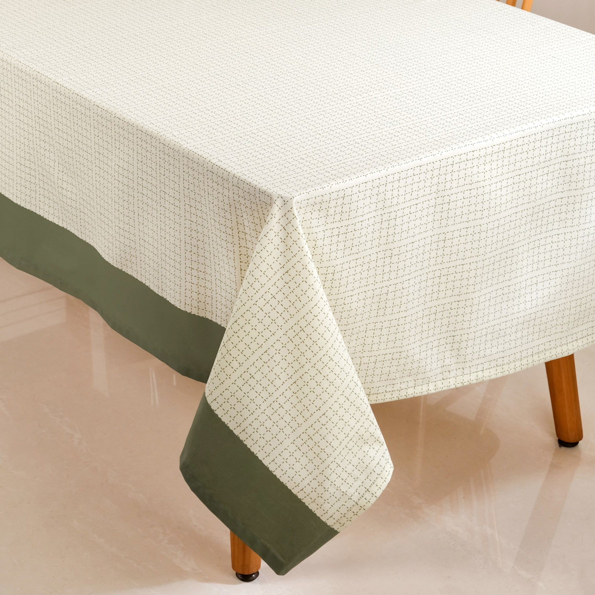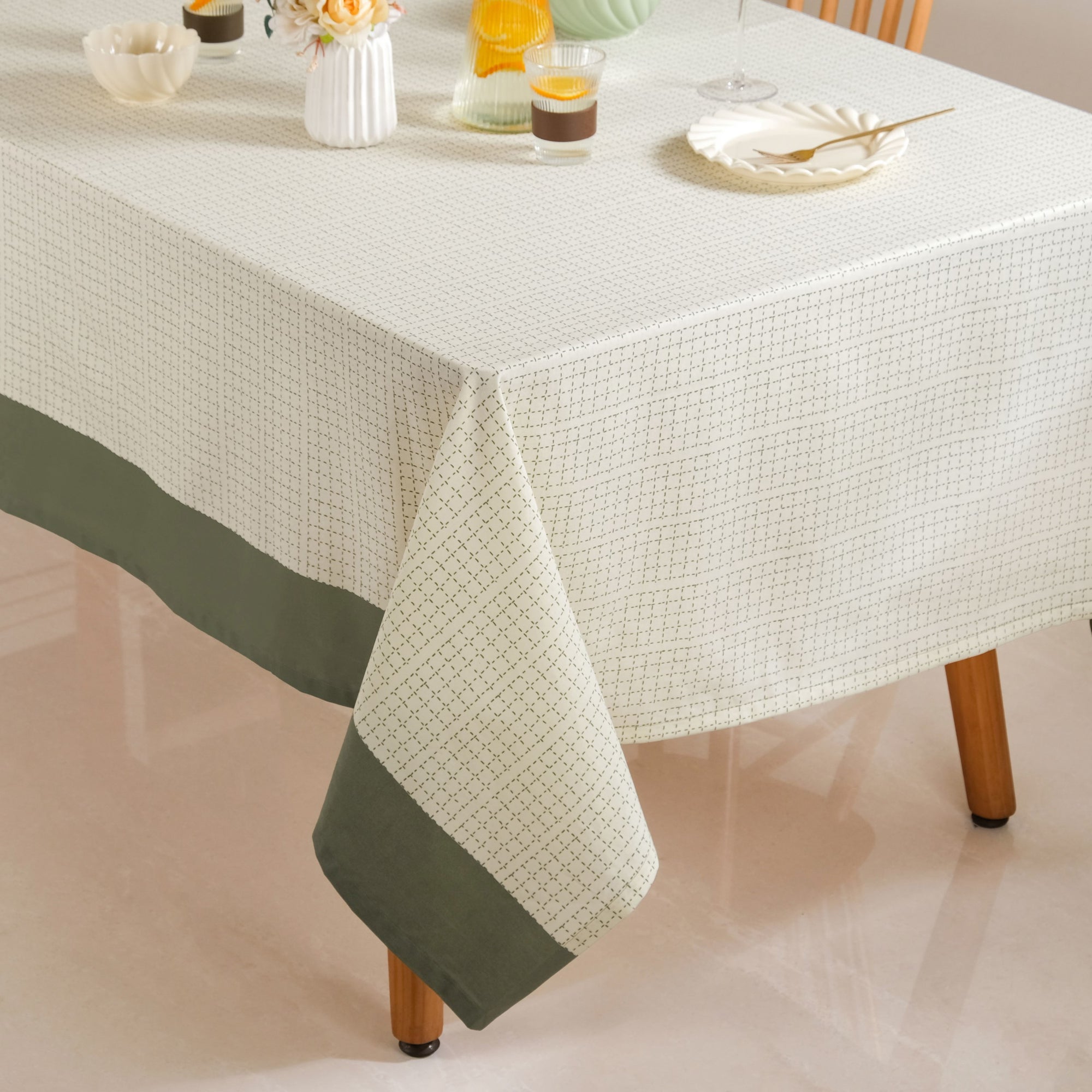 Design: Measuring 274x152cm, it offers perfect coverage for larger gatherings while maintaining a graceful drape. The unique running stitch grid pattern creates beautiful texture and visual interest, transforming everyday meals into special occasions. The design features an elegant running stitch grid pattern that creates subtle texture and dimension across the surface and a solid olive green border. This artisanal detailing provides a contemporary take on traditional embroidery techniques, adding character and sophistication while maintaining a versatile, neutral aesthetic that complements both modern and classic tableware and dining settings.