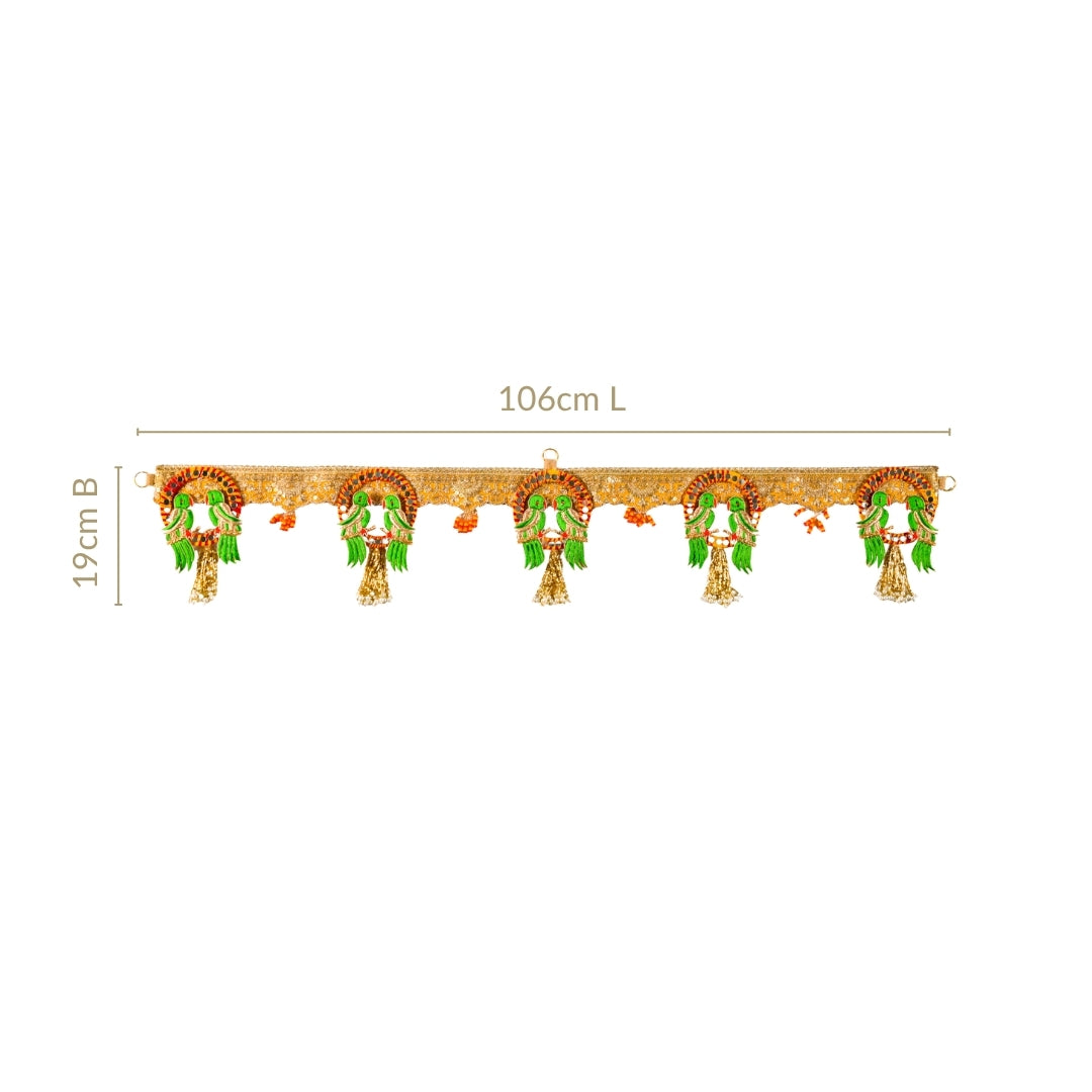 Design: This toran is crafted on a golden fabric base with a lace-like texture that gives it a rich, festive appearance. It features hand-crafted parrot motifs in pairs, designed in bright green with detailed embroidery and stone embellishments. Small circular mirrors are embedded across the top border to reflect light and enhance visual appeal. Each motif is finished with dangling bead and pearl tassels, along with red-orange beaded hangings that add movement and colour. Loop rings are attached for easy hanging across standard doorways or windows, making it ideal for gate decor and wall decoration.