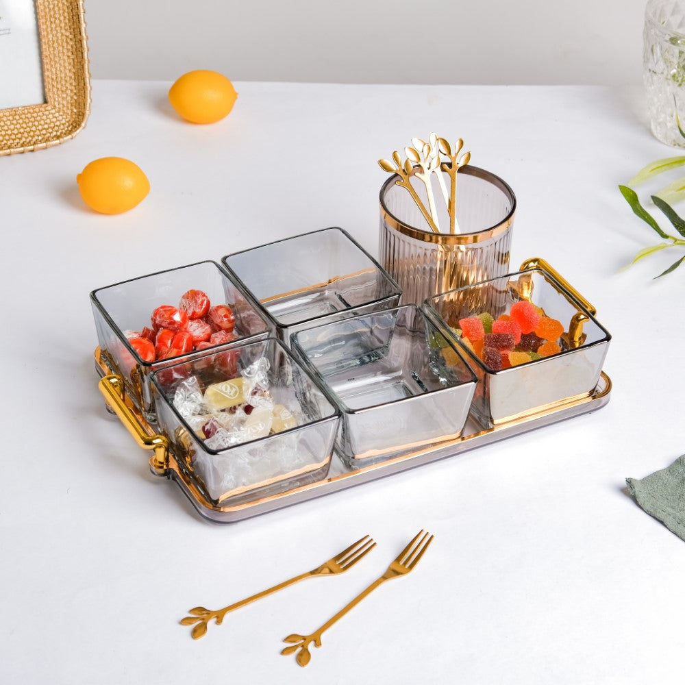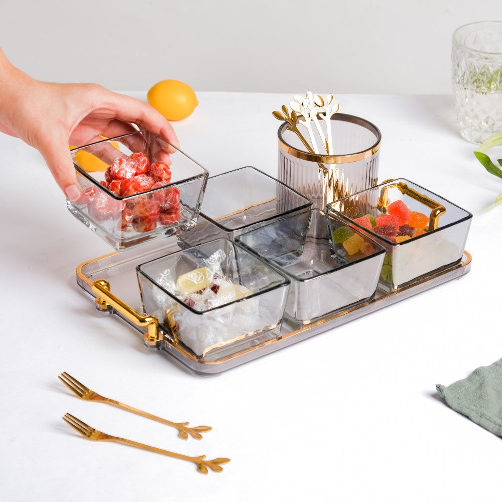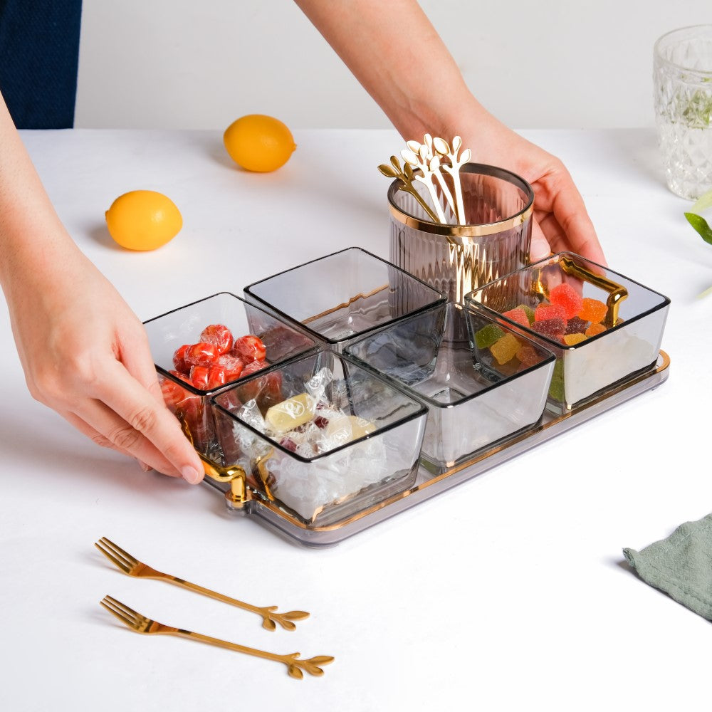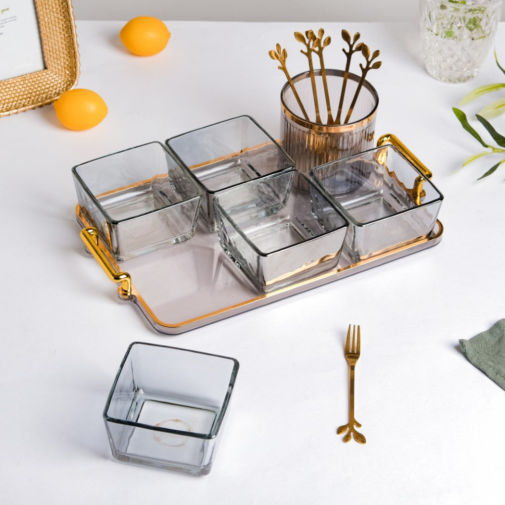 An exciting cricket match or a nail-biting thriller movie doesn't give you enough time to rush to the kitchen and get the spoons in time. So, gather around and let the arrangement take care of it with the set of 5 glass bowls, 6 forks, 1 tumbler and a tray. Fill the bowls with snacks without the worry of breakage as they are made of sturdy and durable material, and can be reheated owing to their microwave-safe feature. They are also dishwasher safe. The tumbler can be used to keep the spoons collected if they are not in use. Use the metal tray to carry the entire set with ease.
