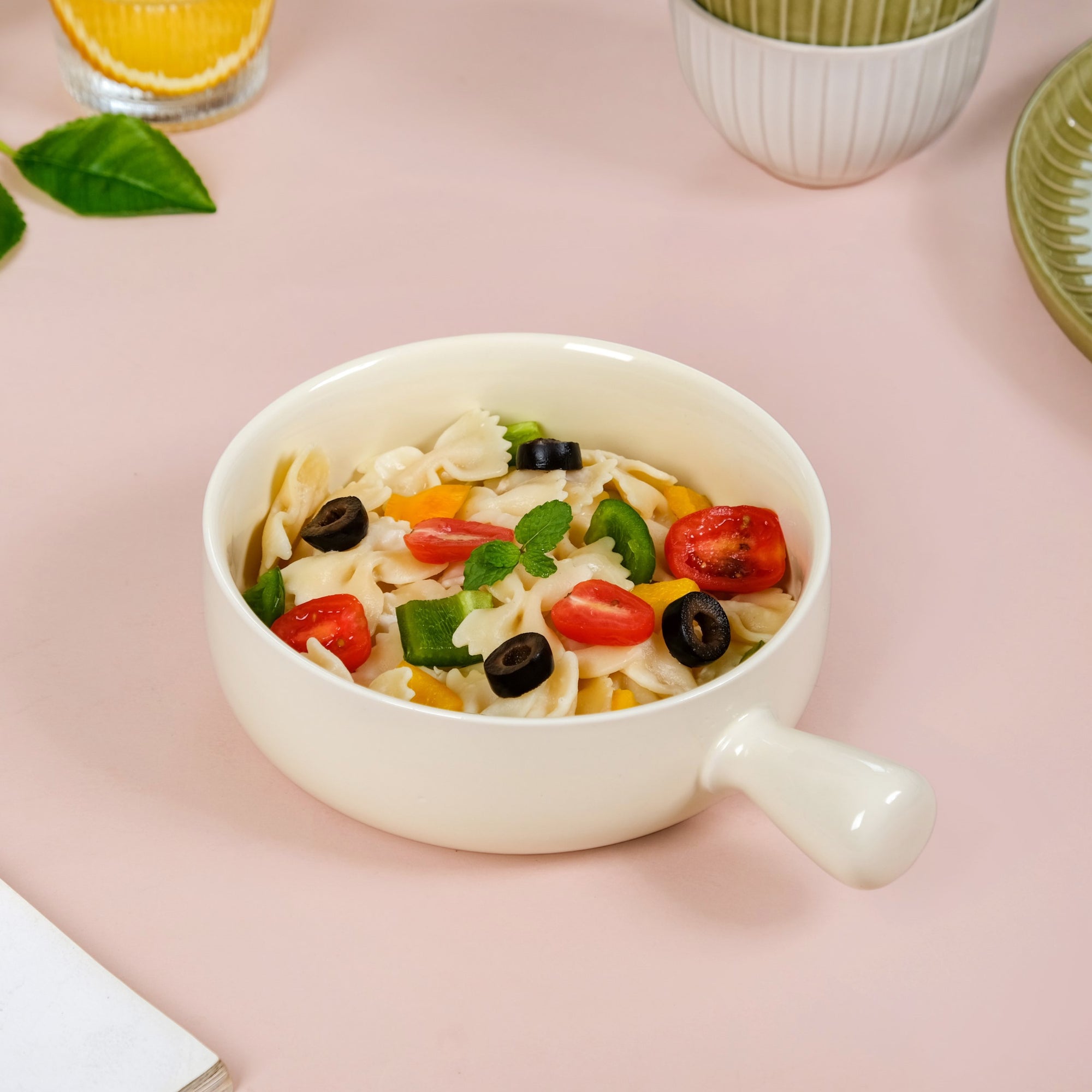 Design: Featuring an ergonomic handle, the ceramic bowl ensures a comfortable grip for easy serving. Its smooth, glossy finish enhances the overall appeal, while the soft pastel cream colour brings a touch of understated charm to your dining table.