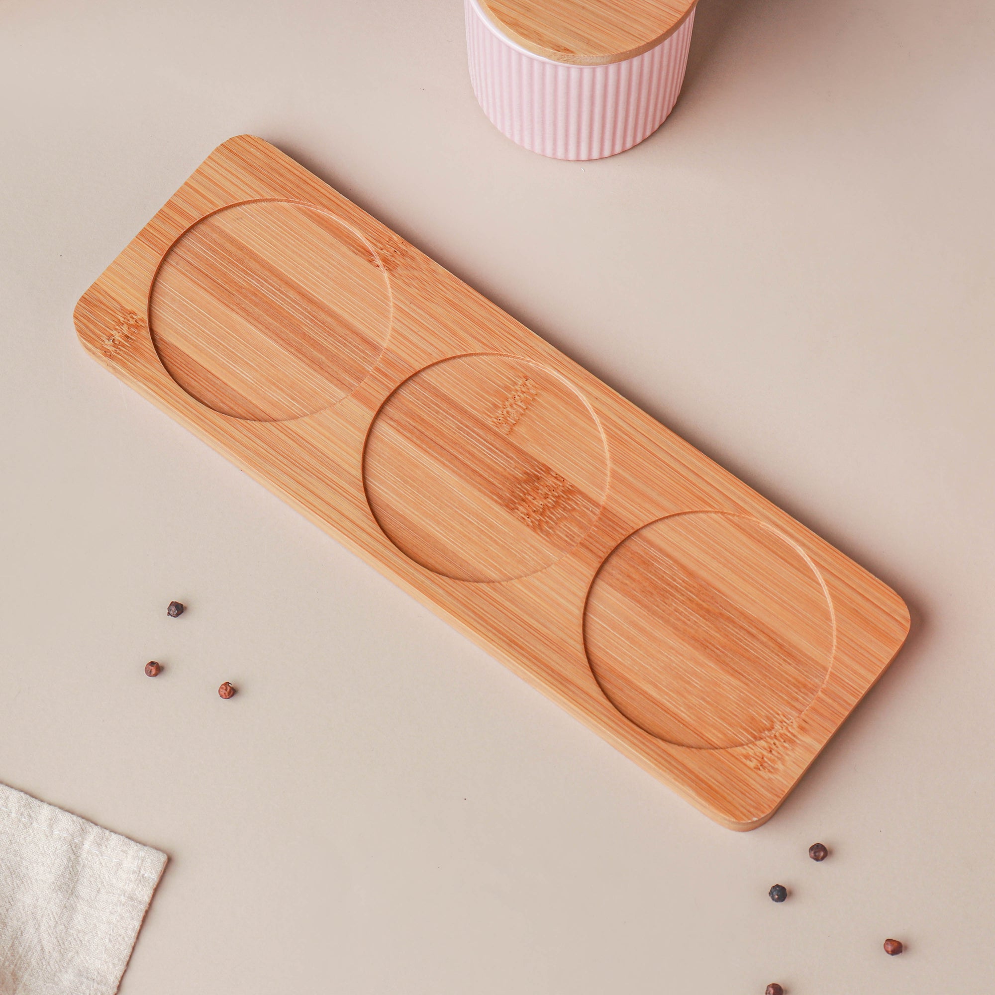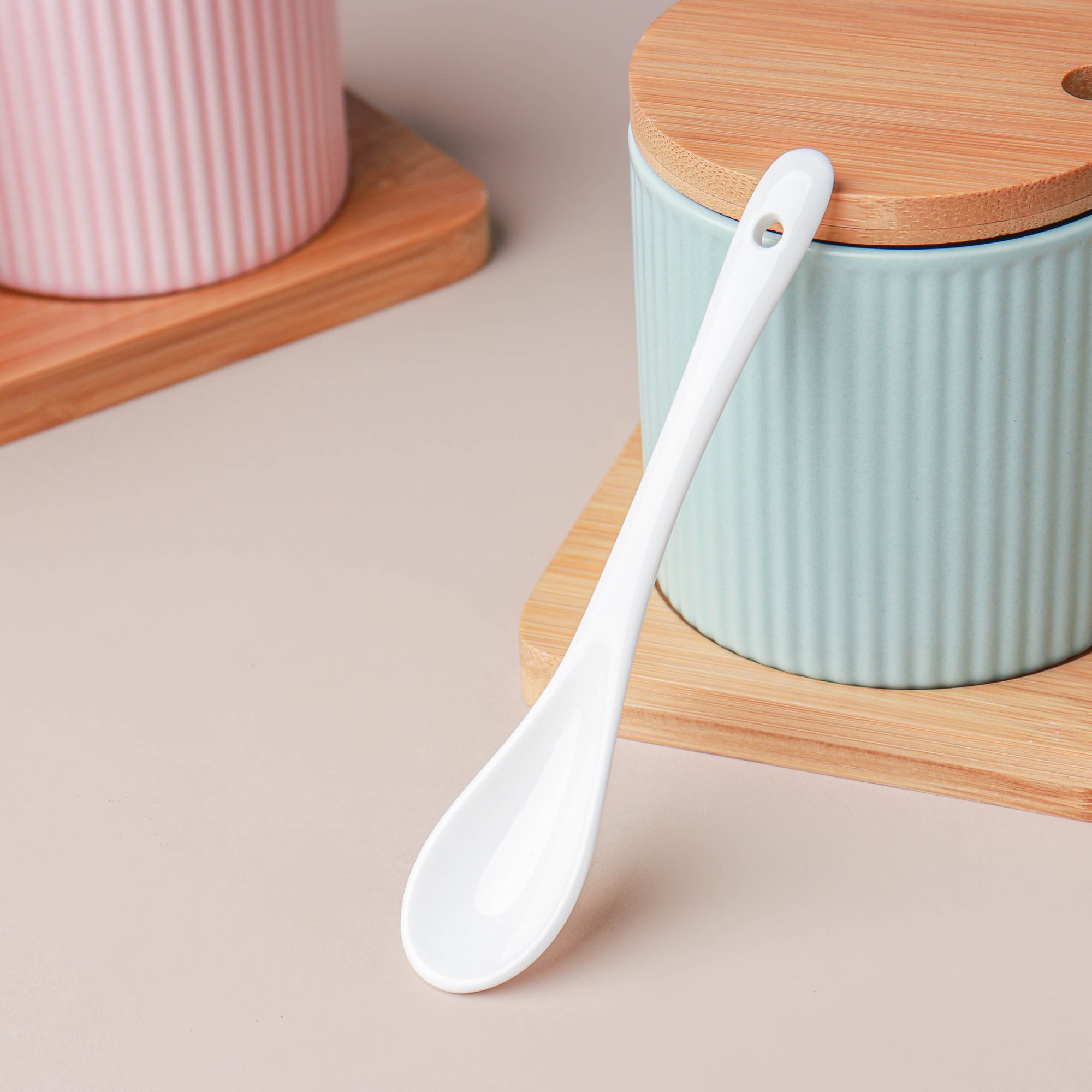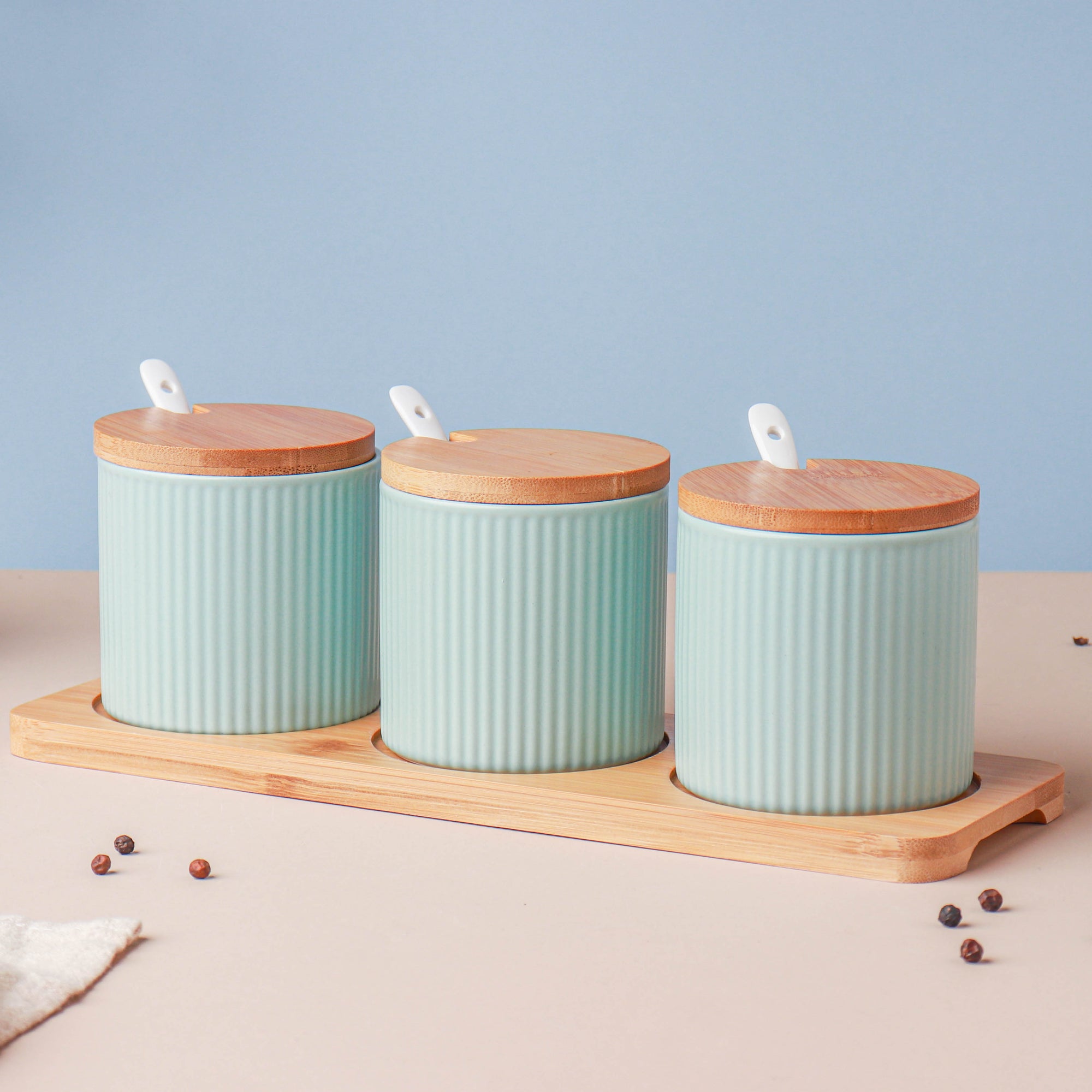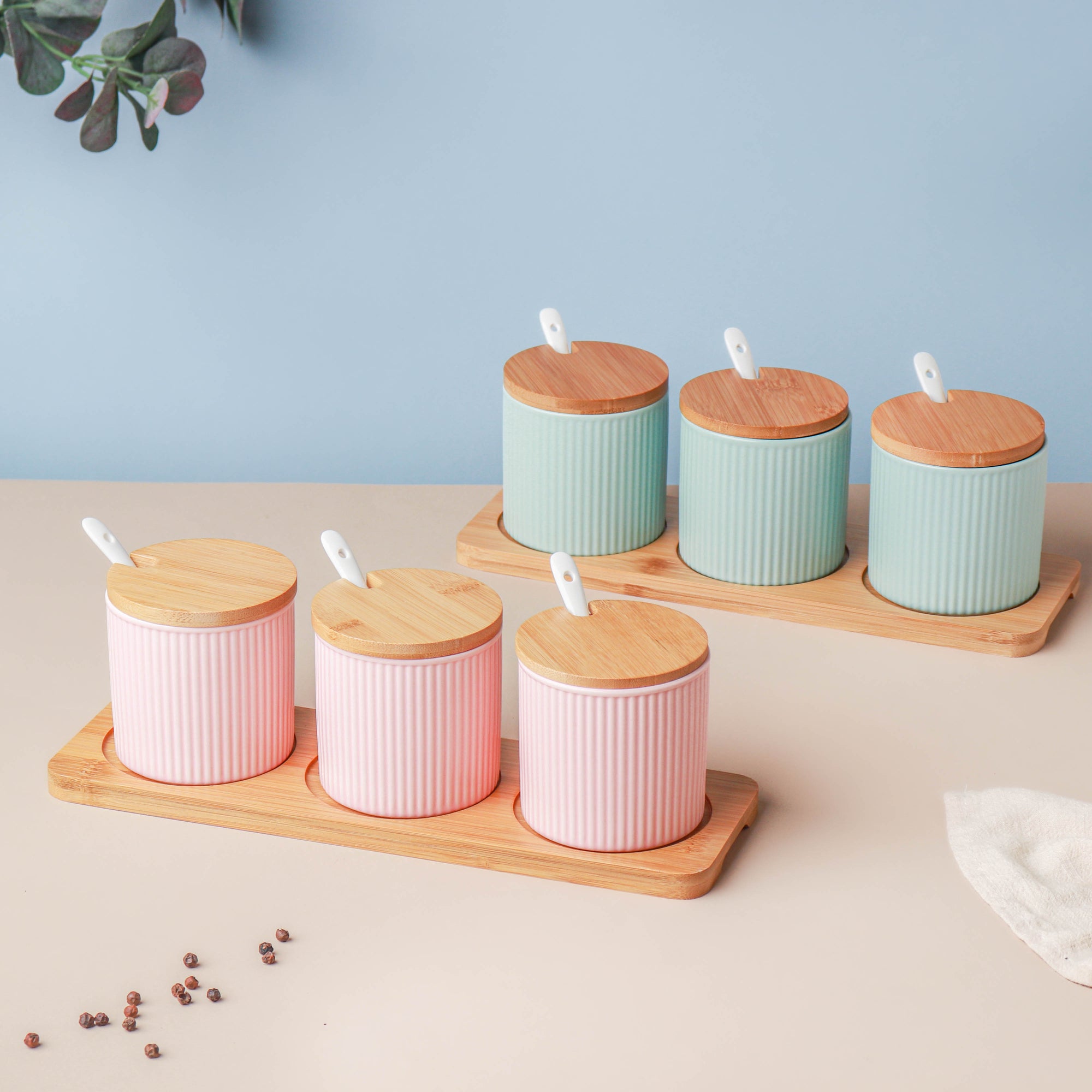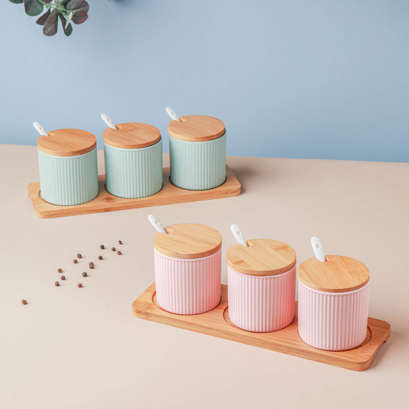 Equipped with a cover lid and spoon, the ceramic jars come in refreshing, pastel shades of pink and blue. The matte finish exterior of each jar is inlaid with vertically ribbed motifs. The spice jar set is also provided with a long tray, which has three coaster-like depressions to signify the resting positions for the jars.