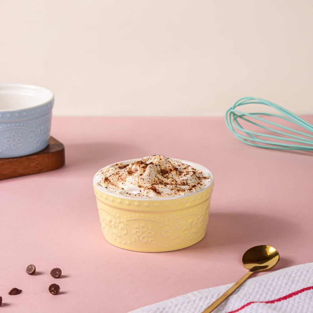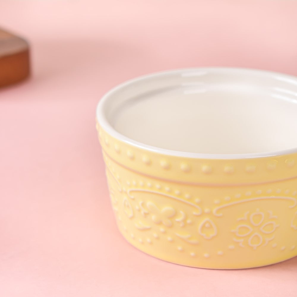 The light yellow ceramic bowl comes with a raised rim and intricate embossed designs which makes it stand out on a minimal dining table. Lift the mood of the table set-up by serving pudding, custard, desserts, ice cream, and brownies after the main meals. The small versatile bowl can also be used to serve soup, curry, and side dishes.
