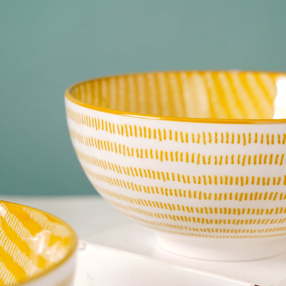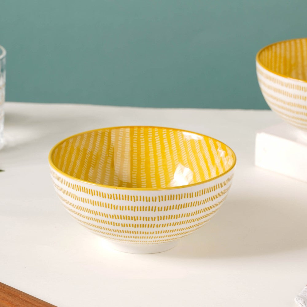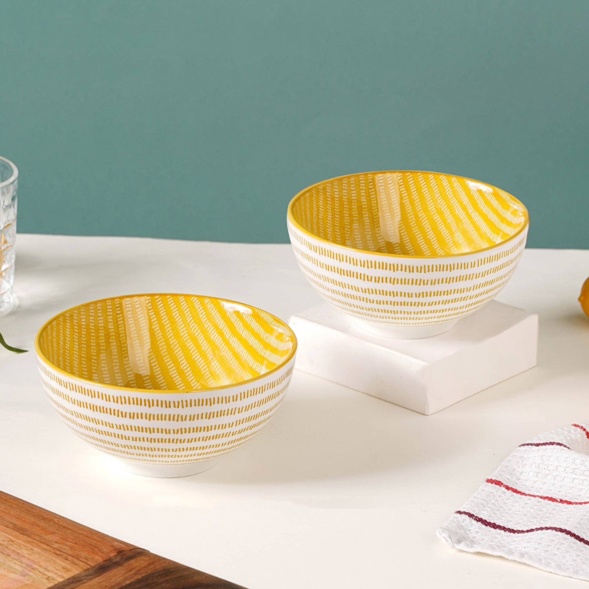 The yellow-coloured round bowls are made with premium-quality ceramic and are patterned with a quirky, geometric shape. The bowls are made of high-quality, food-grade ceramic and hence are perfect for daily use as a soup bowl, snack bowl, popcorn bowl, etc. Their exterior surface is patterned in a linear way while the interior shows a wavy pattern. The bright yellow set of 2 patterned bowls can be a wonderful gift for occasions like housewarmings, anniversaries, other festivities, or any congratulatory ceremony. Features: -Premium quality -Handcrafted, artisanal -Glazed surface -Quirky pattern -Set of 2 -100% lead-free - Food grade -Best for snacks and appetizers, soups and gravy items -Best for gifting Nestip: The yellow bowl can be paired with other yellow-coloured crockery. Size: 15cm D x 7cm H Capacity- 500ml Colour: Yellow, white Material: Ceramic Products included: Set of 2 bowls Style: XCF31